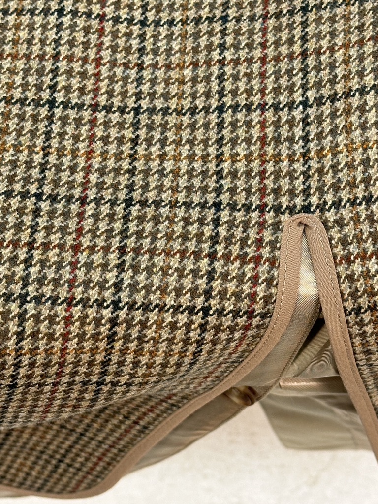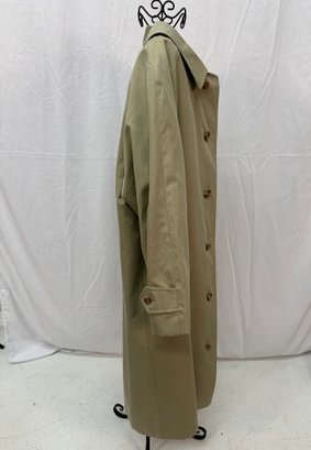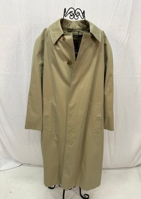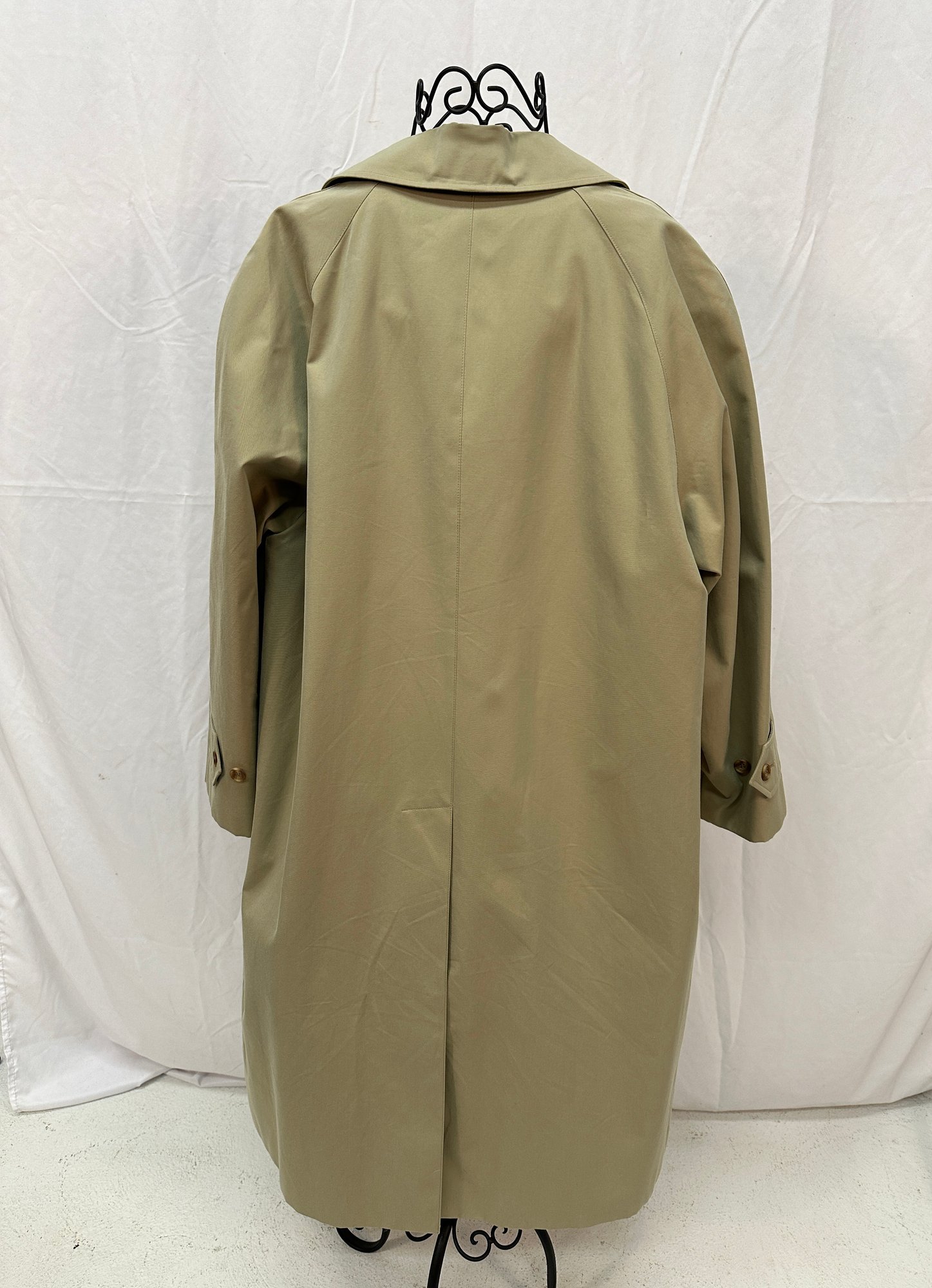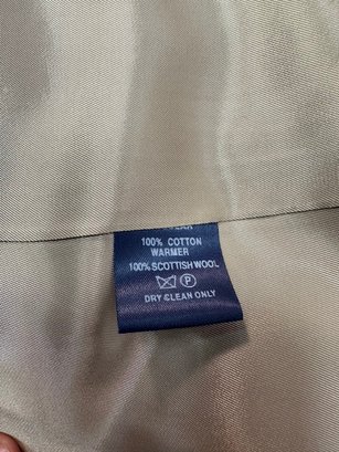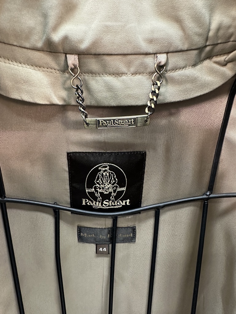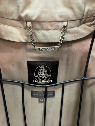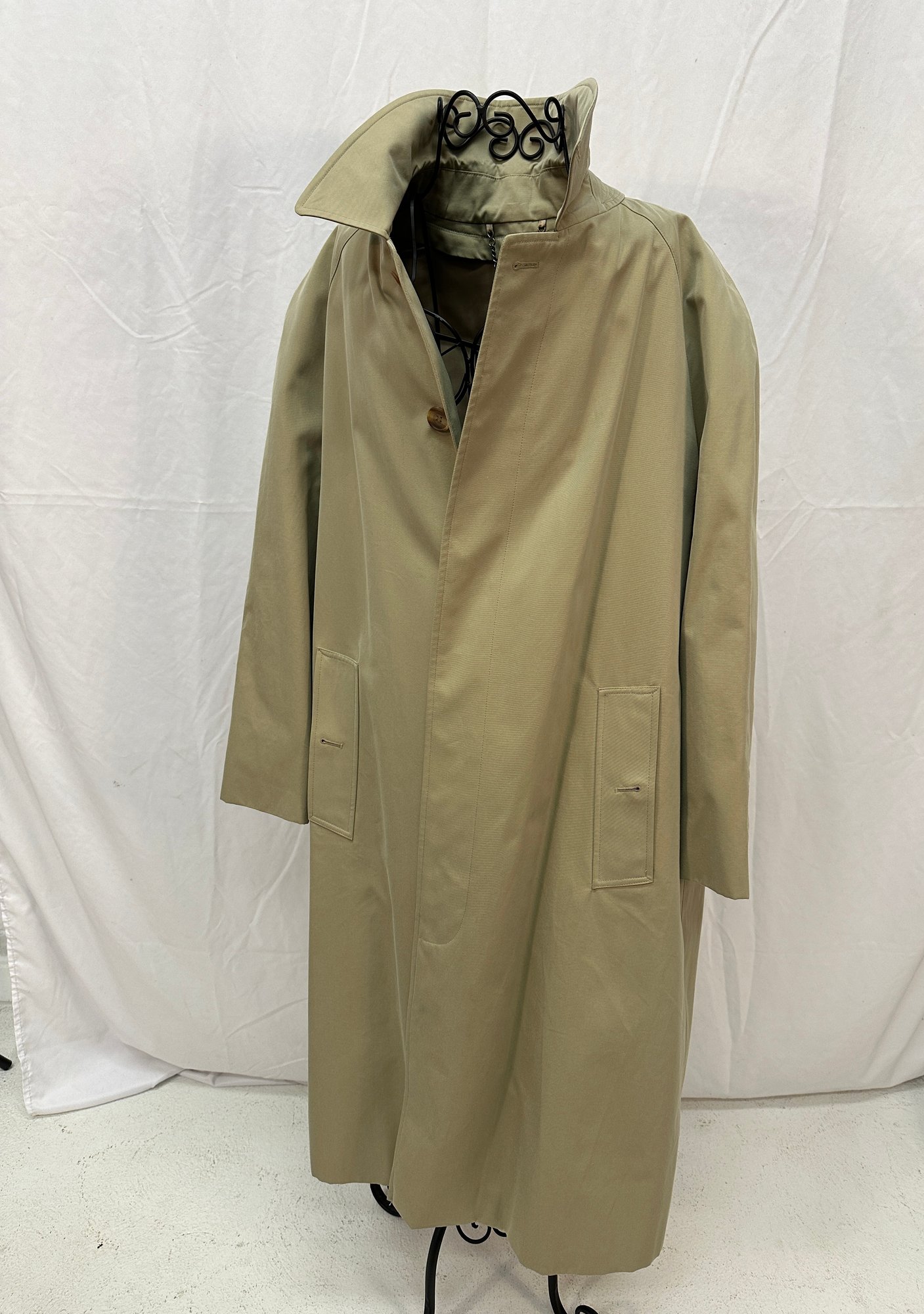 A Paul Stuart trench coat made of cotton, with a houndstooth removable interior wool liner and pockets. Made in England.