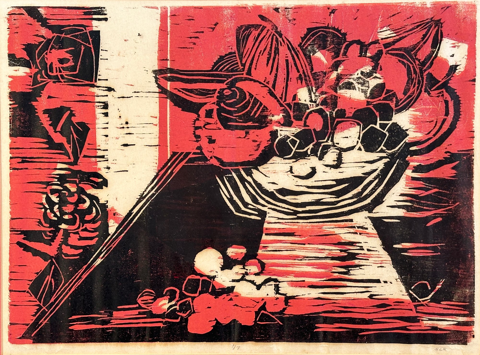 A mid century abstract block print showcasing a still life in red and black ink on white paper. Number and initialed, 1/ 7 and S.L.S.