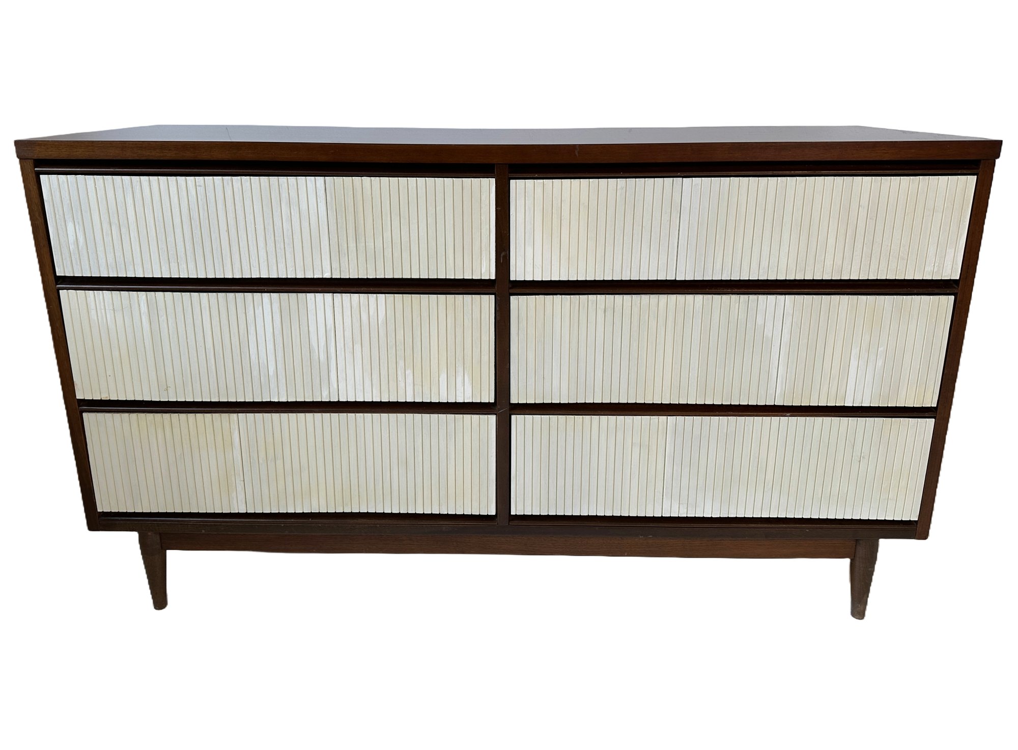 A stacked 3 by 3 drawer walnut dresser with later applied white painted front bead board.