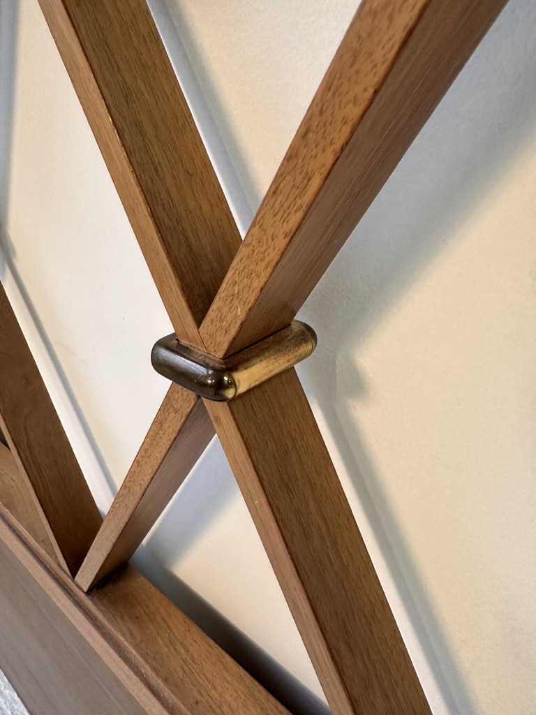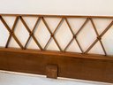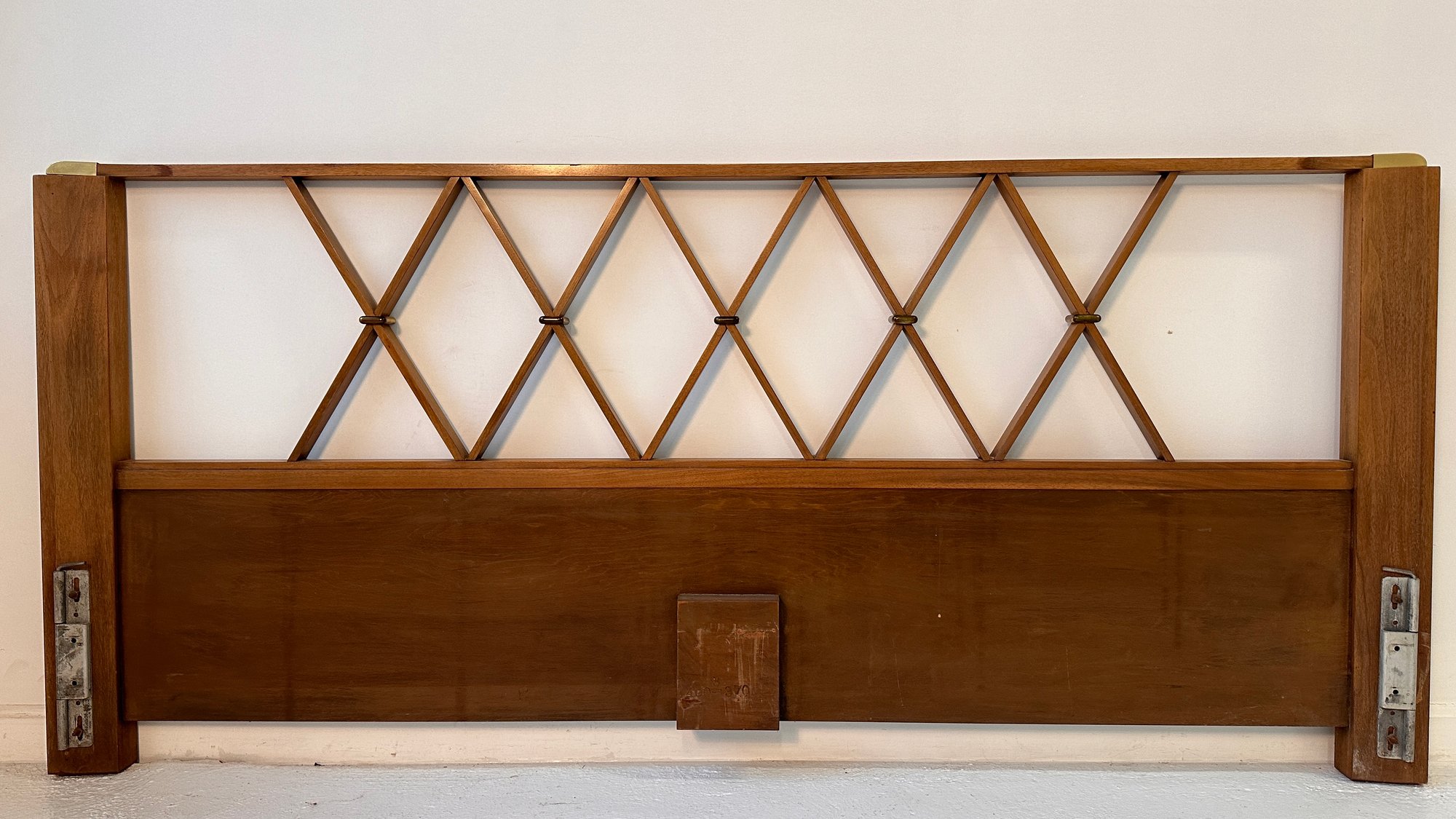A mid century king size headboard with brass accents and diamond lattice design. Designed by Paul Frankel for the Johnson Furniture Co. C.1950's