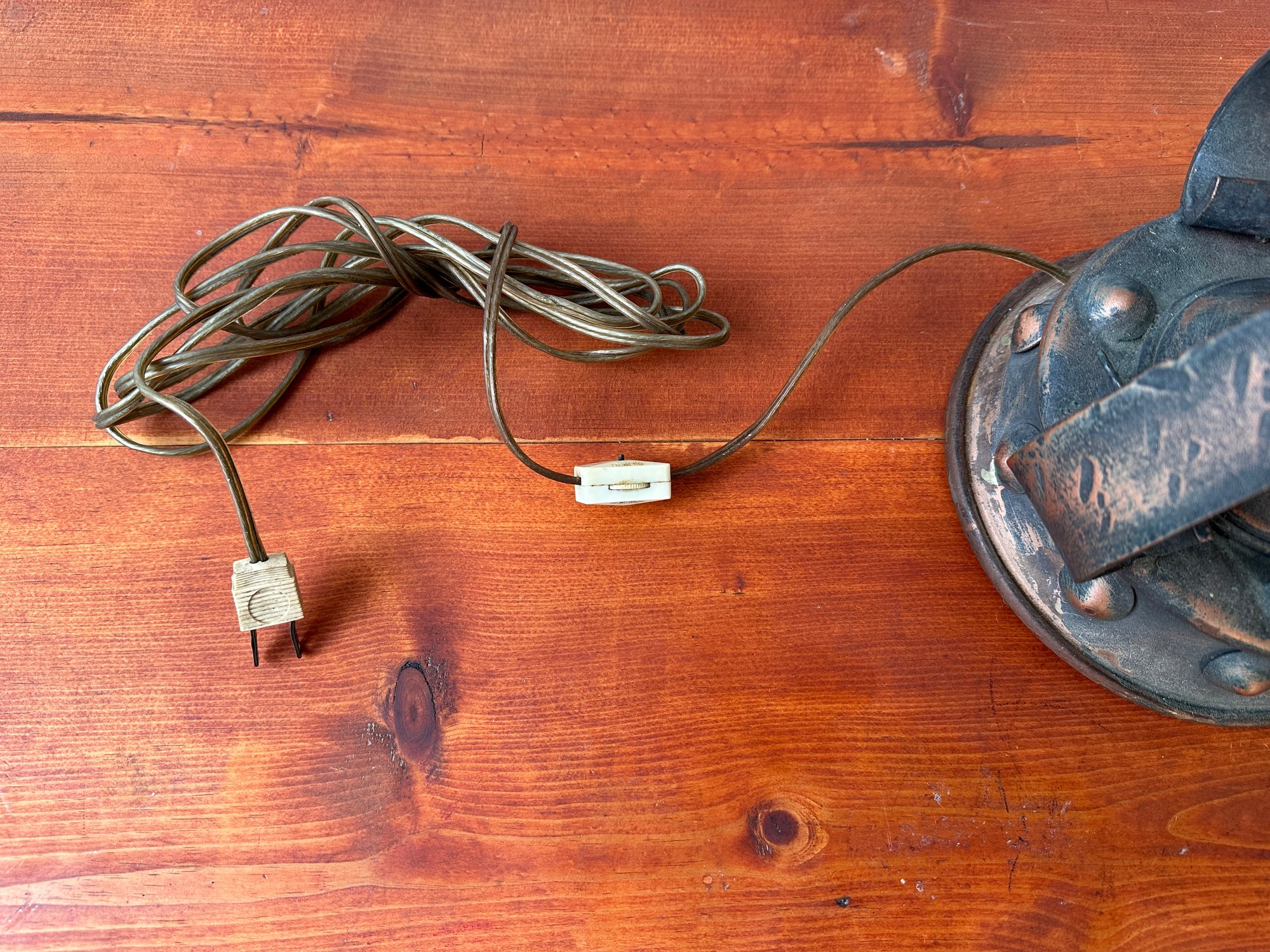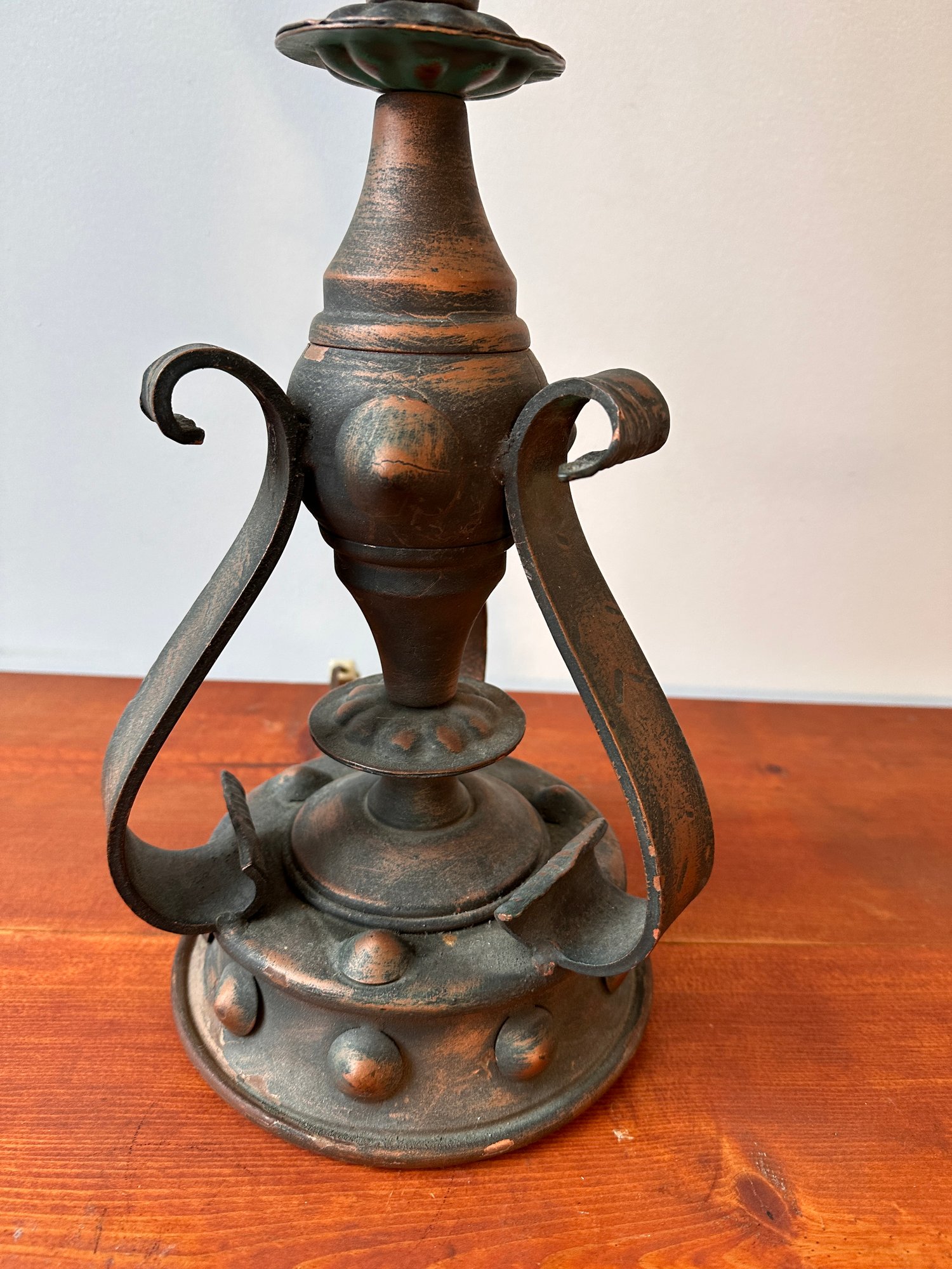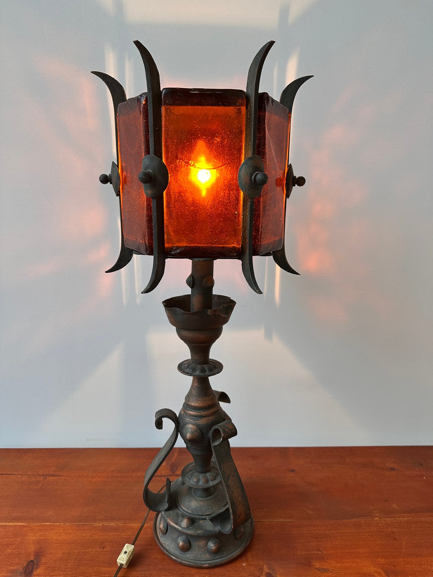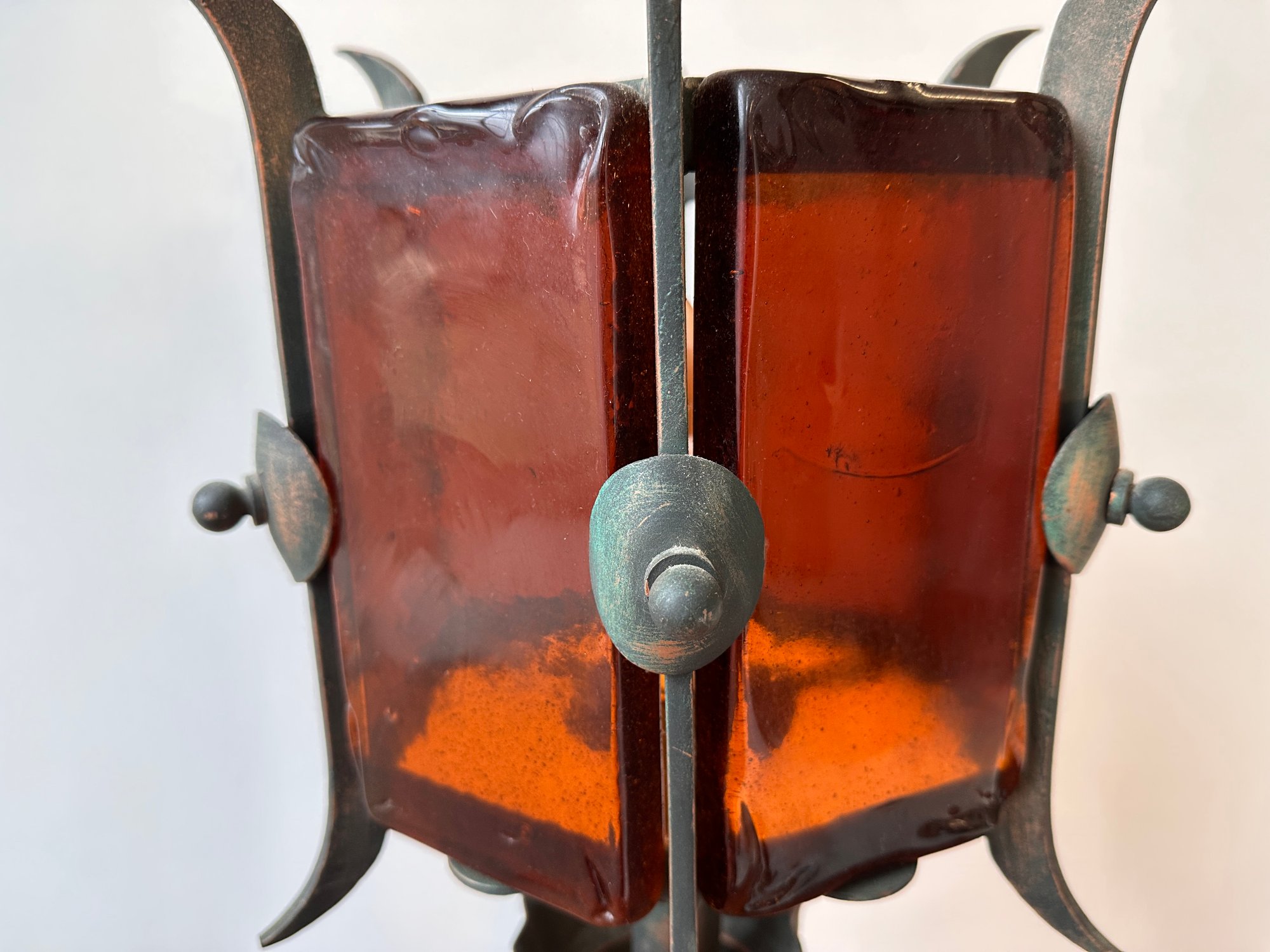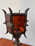 A Mid-century Spanish gothic revival lamp with thick amber glass shades.