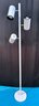 A modern floor lamp with 3 arms on white circular base. Labeled Intertek on bottom.
