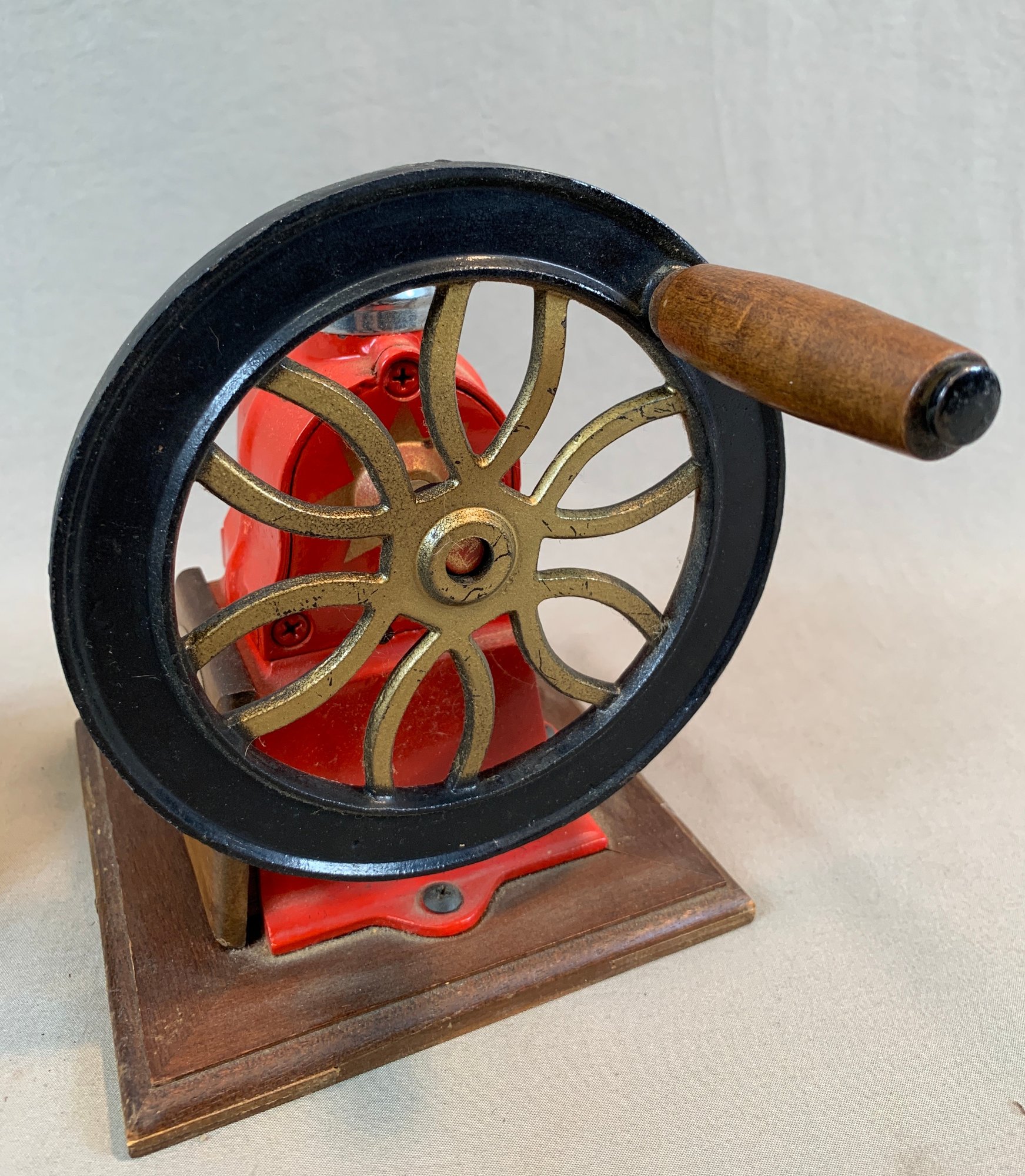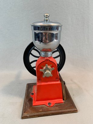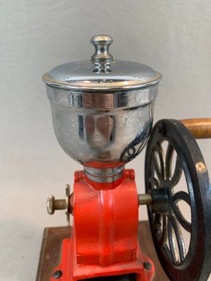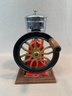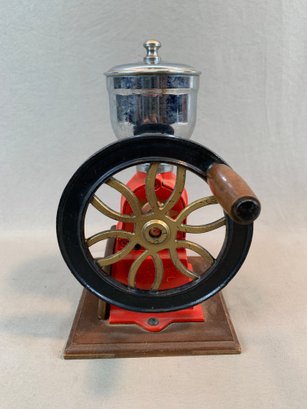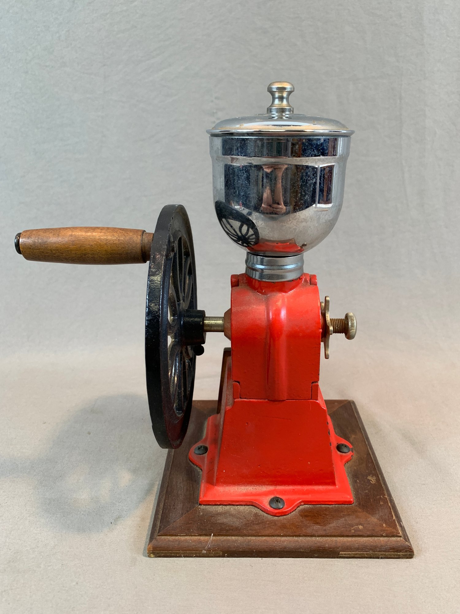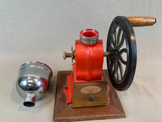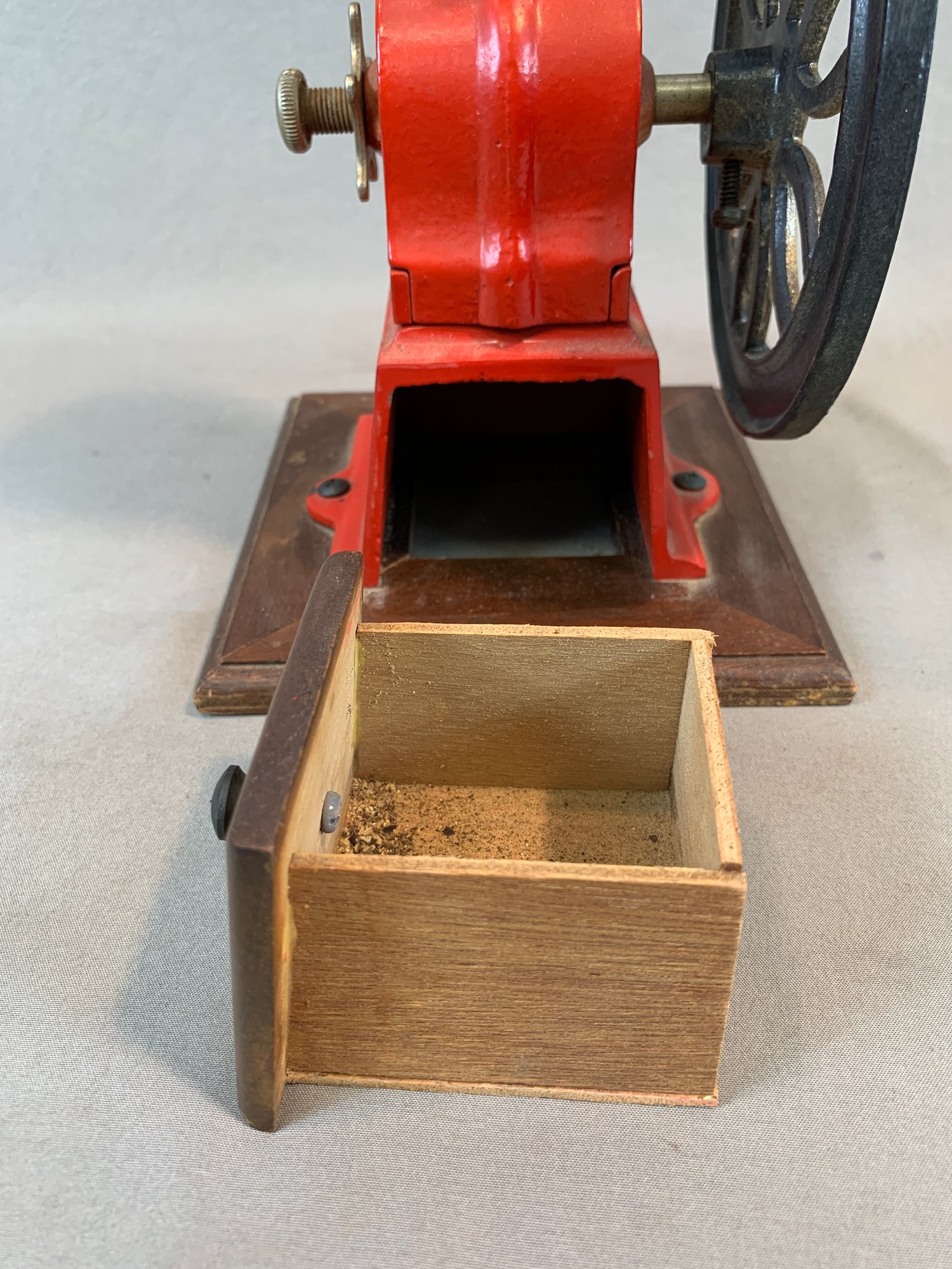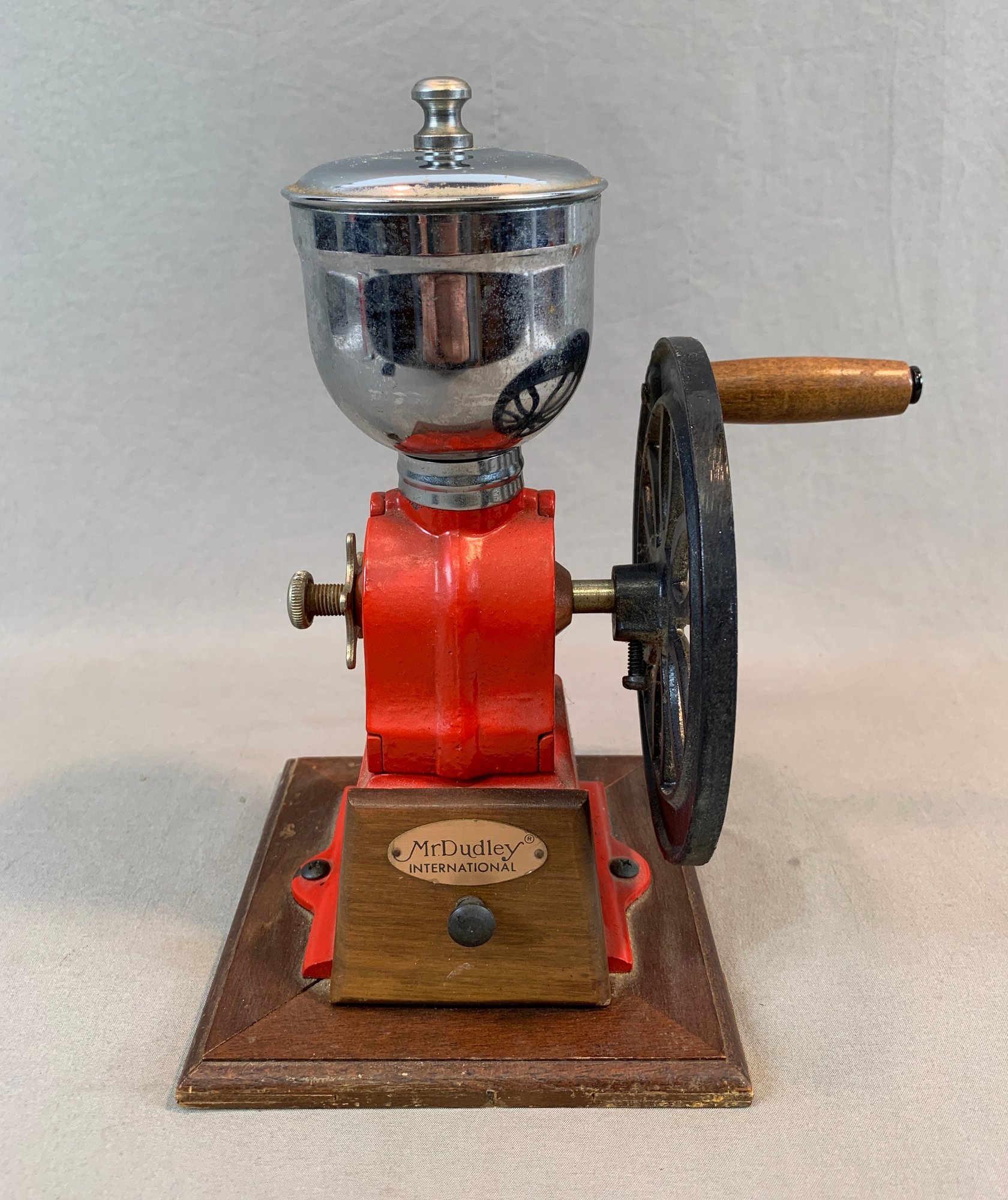 A vintage Mr. Dudley International table-top pepper mill featuring a red-painted cast iron body, chrome hopper with domed lid, large spoked flywheel with gold painted spokes, star-shaped grind adjustment knob, turned wooden handle, and wooden base with pull-out drawer.