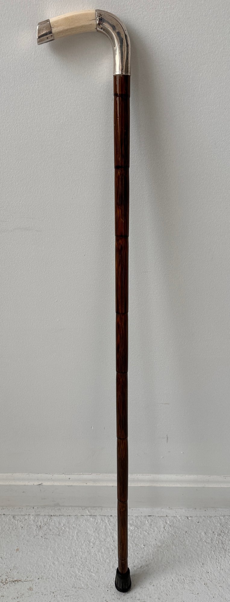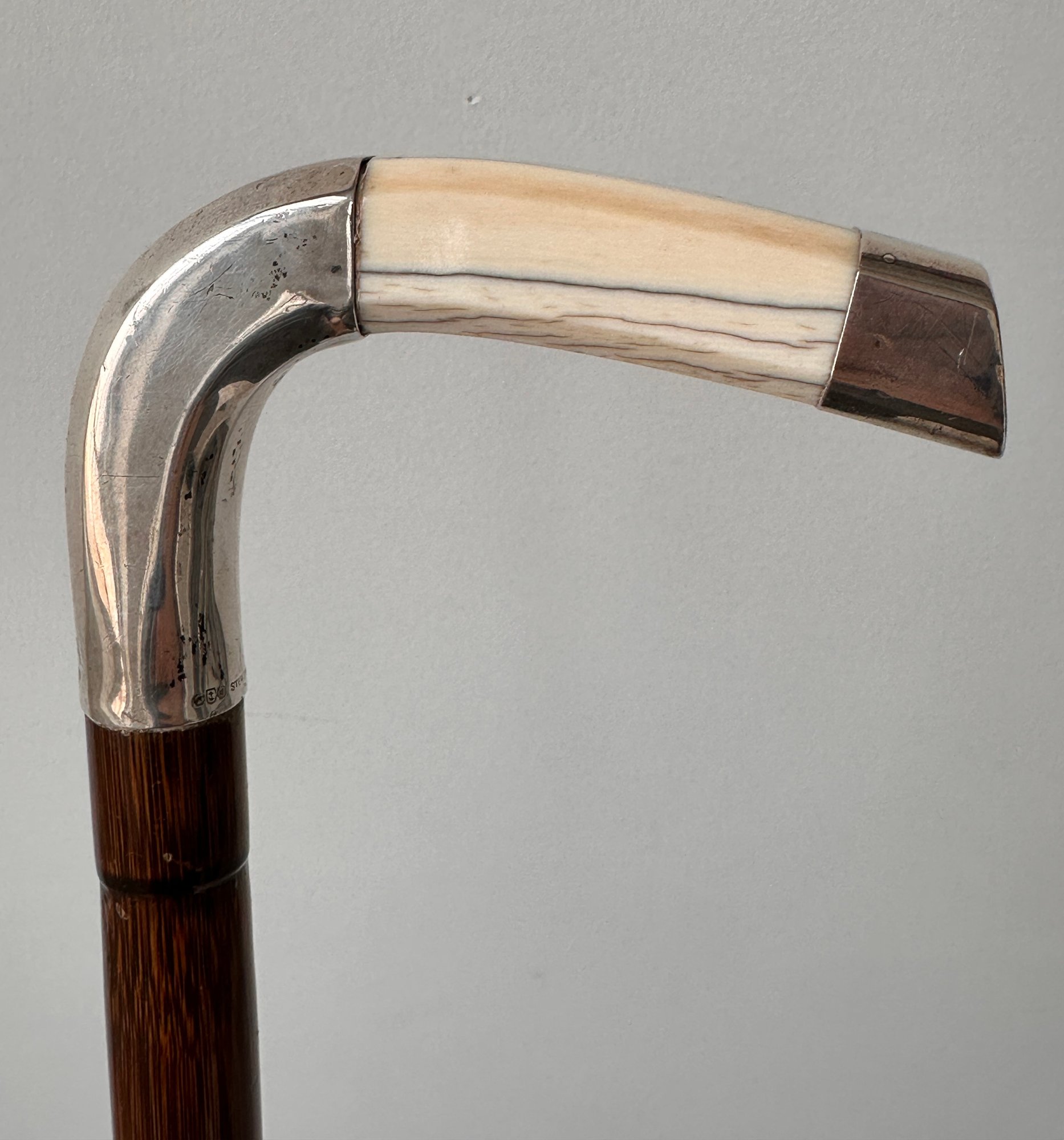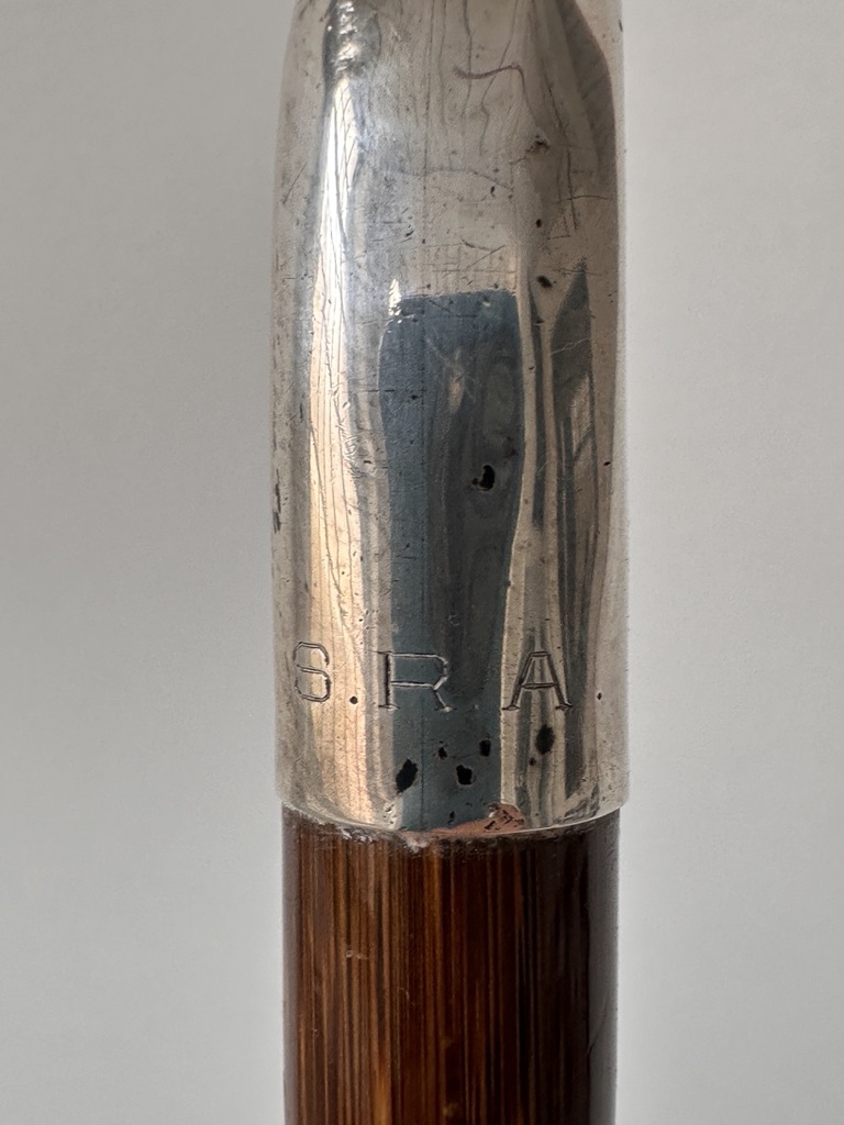Elegant bamboo cane with sterling silver and bone handle, signed Gorham and engraved with initials SRA.