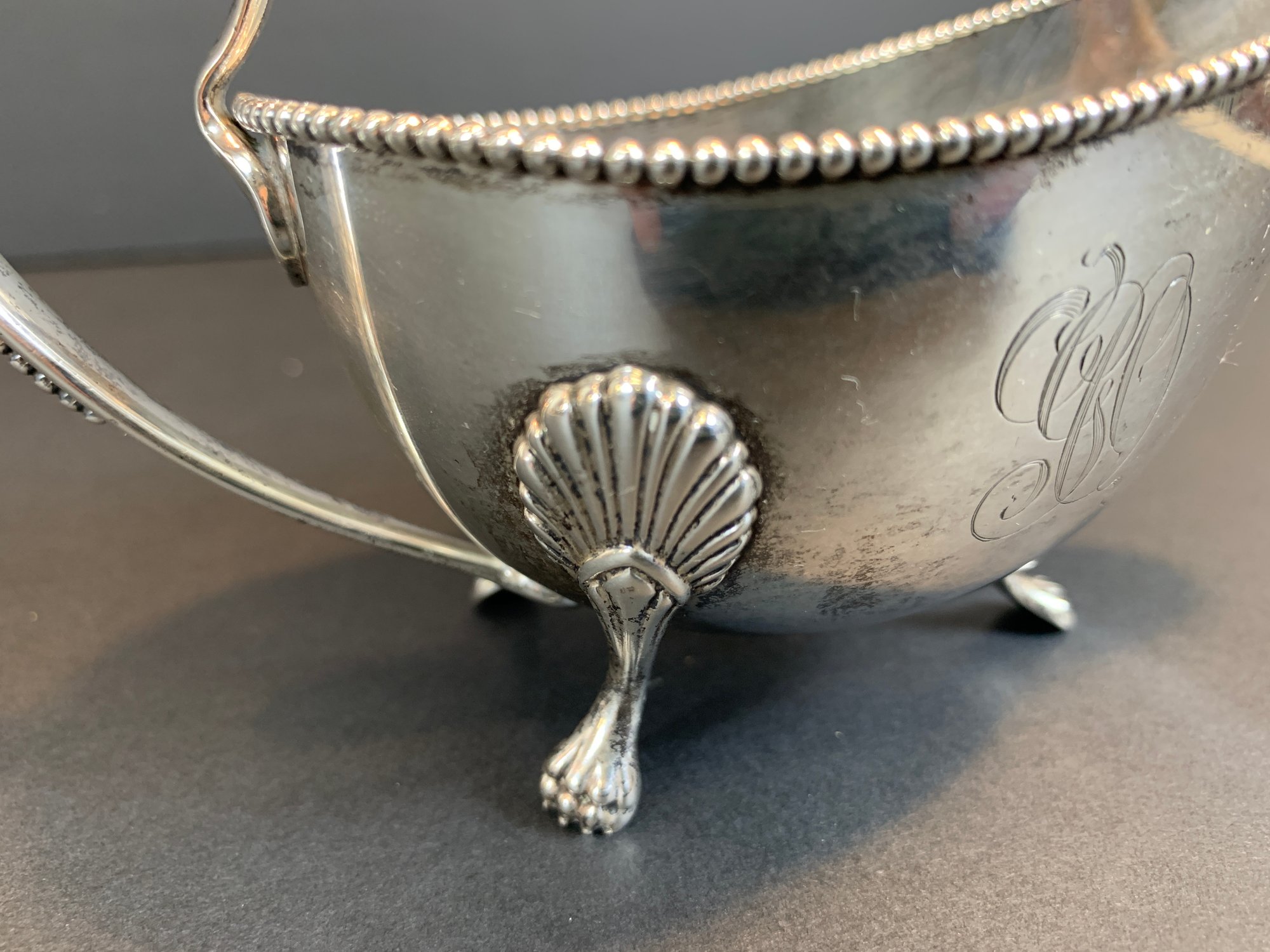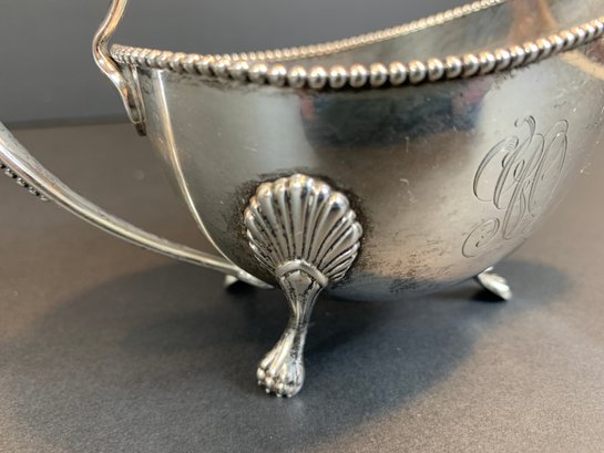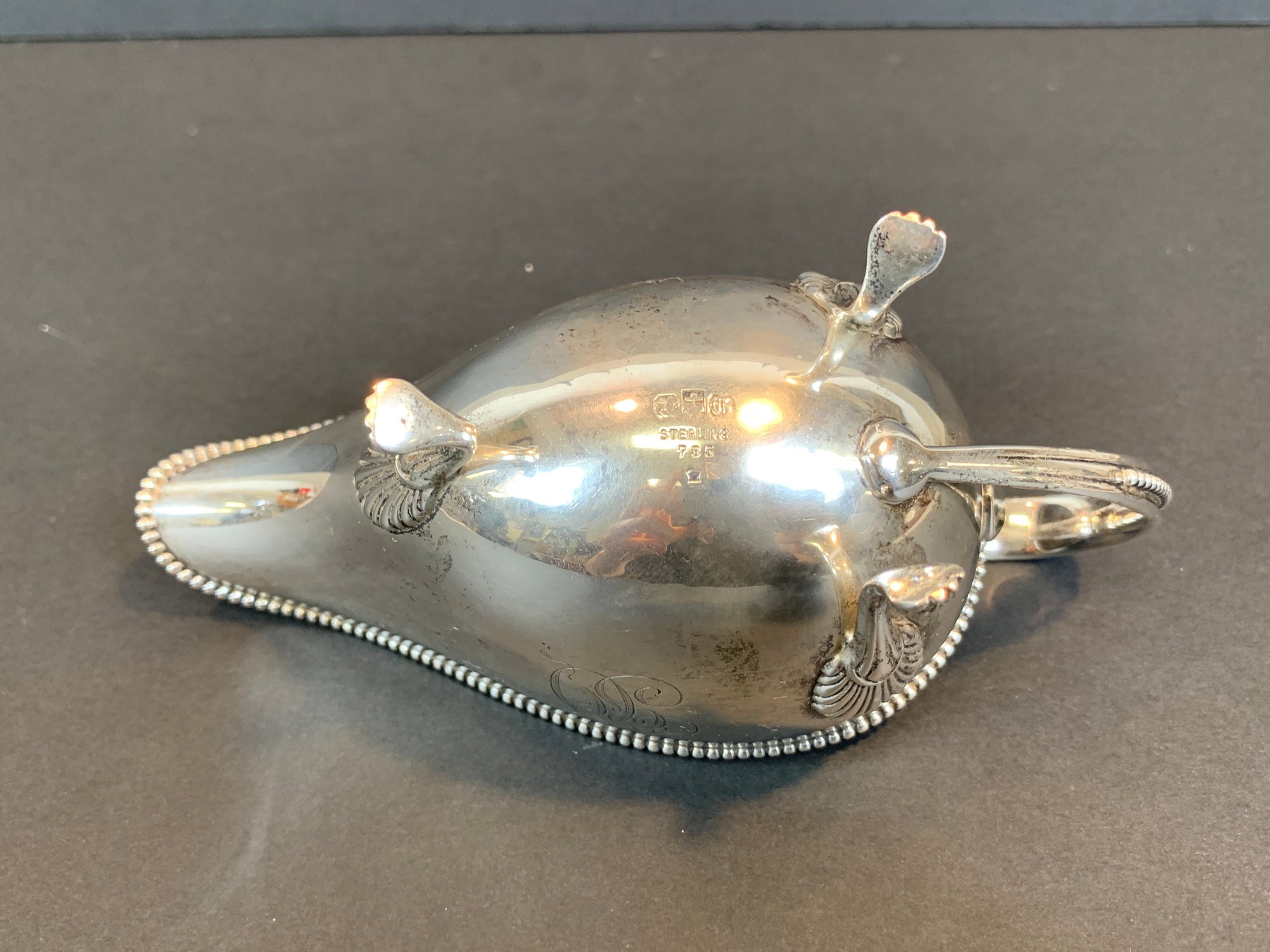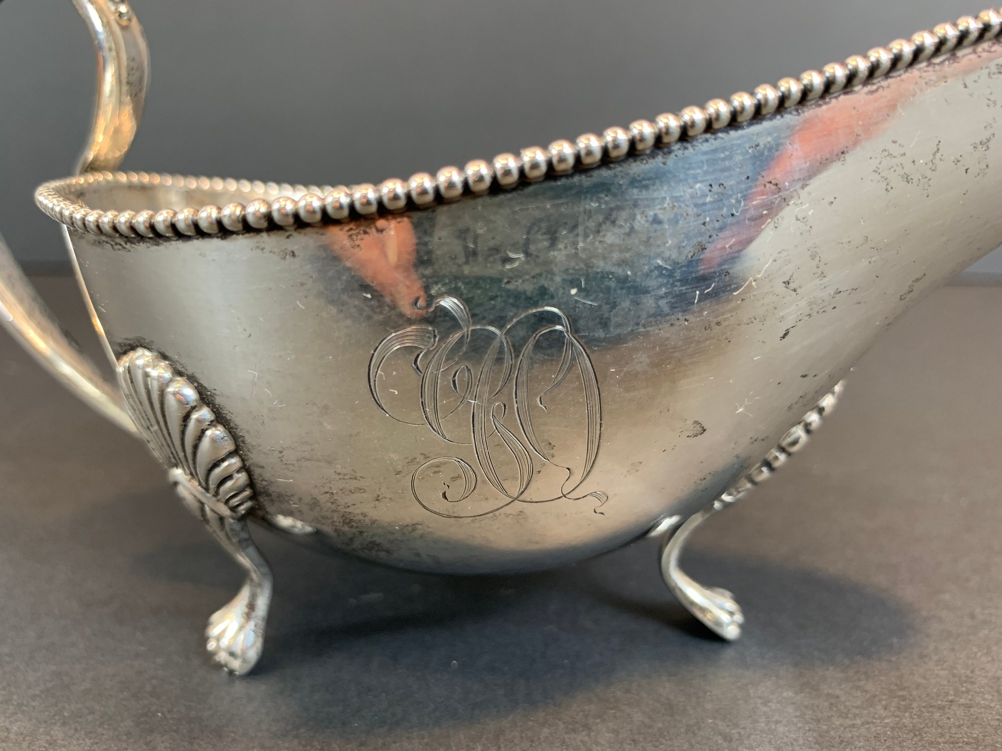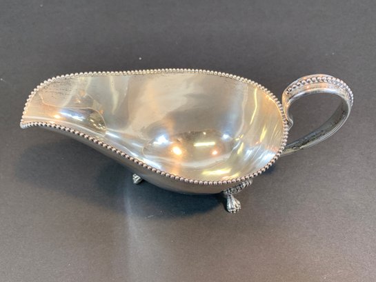 A marked Gorham sterling silver gravy boat with beaded accents and monogram.