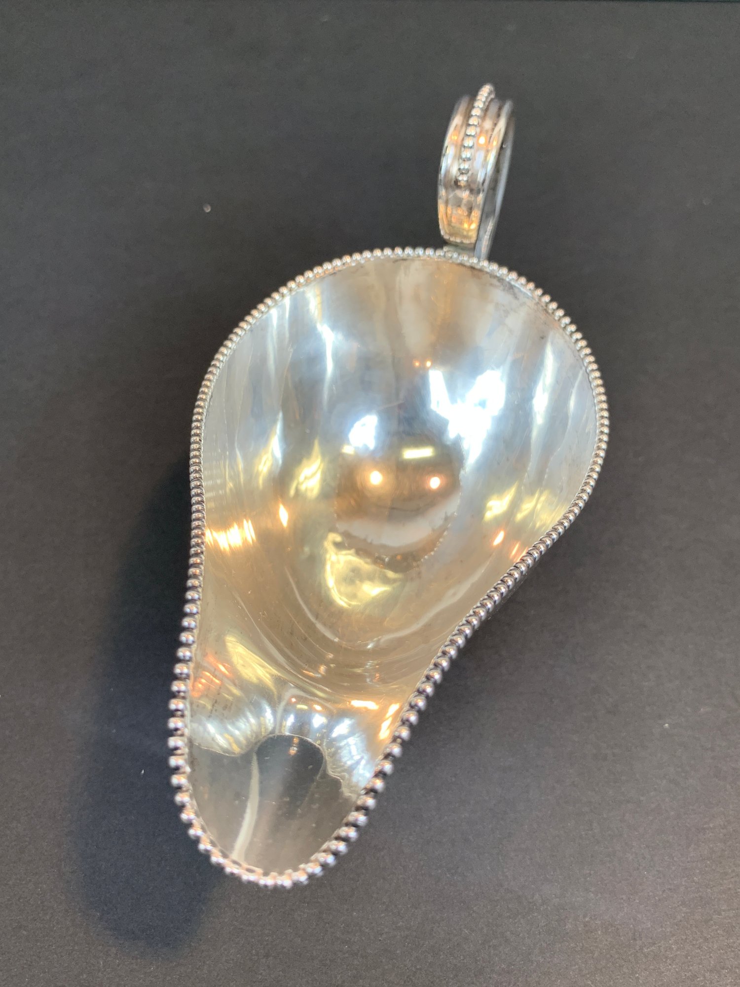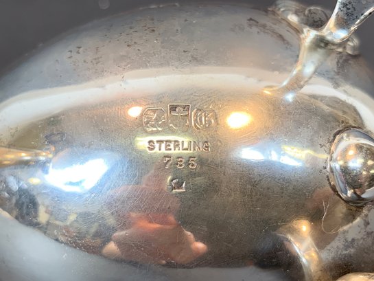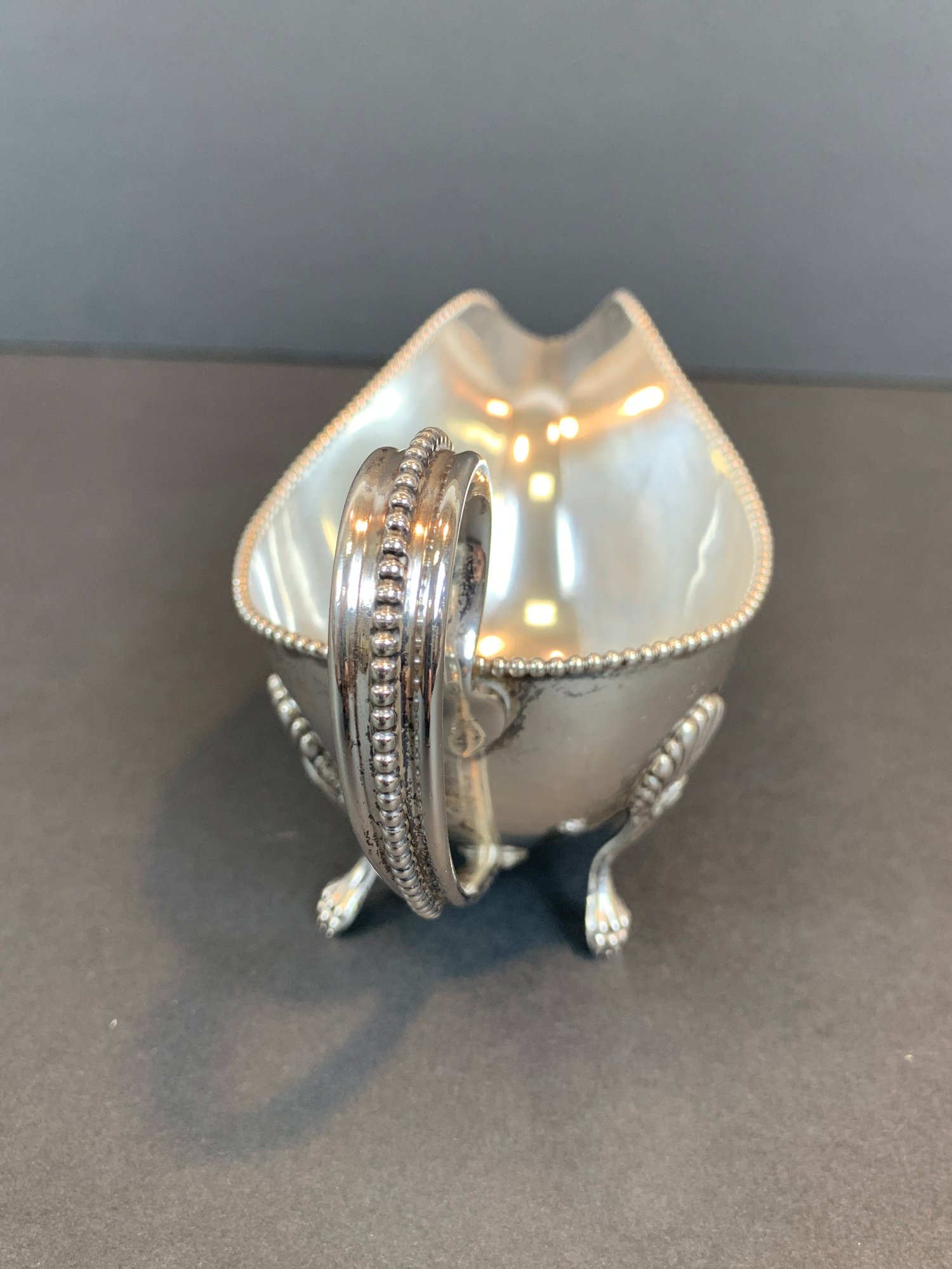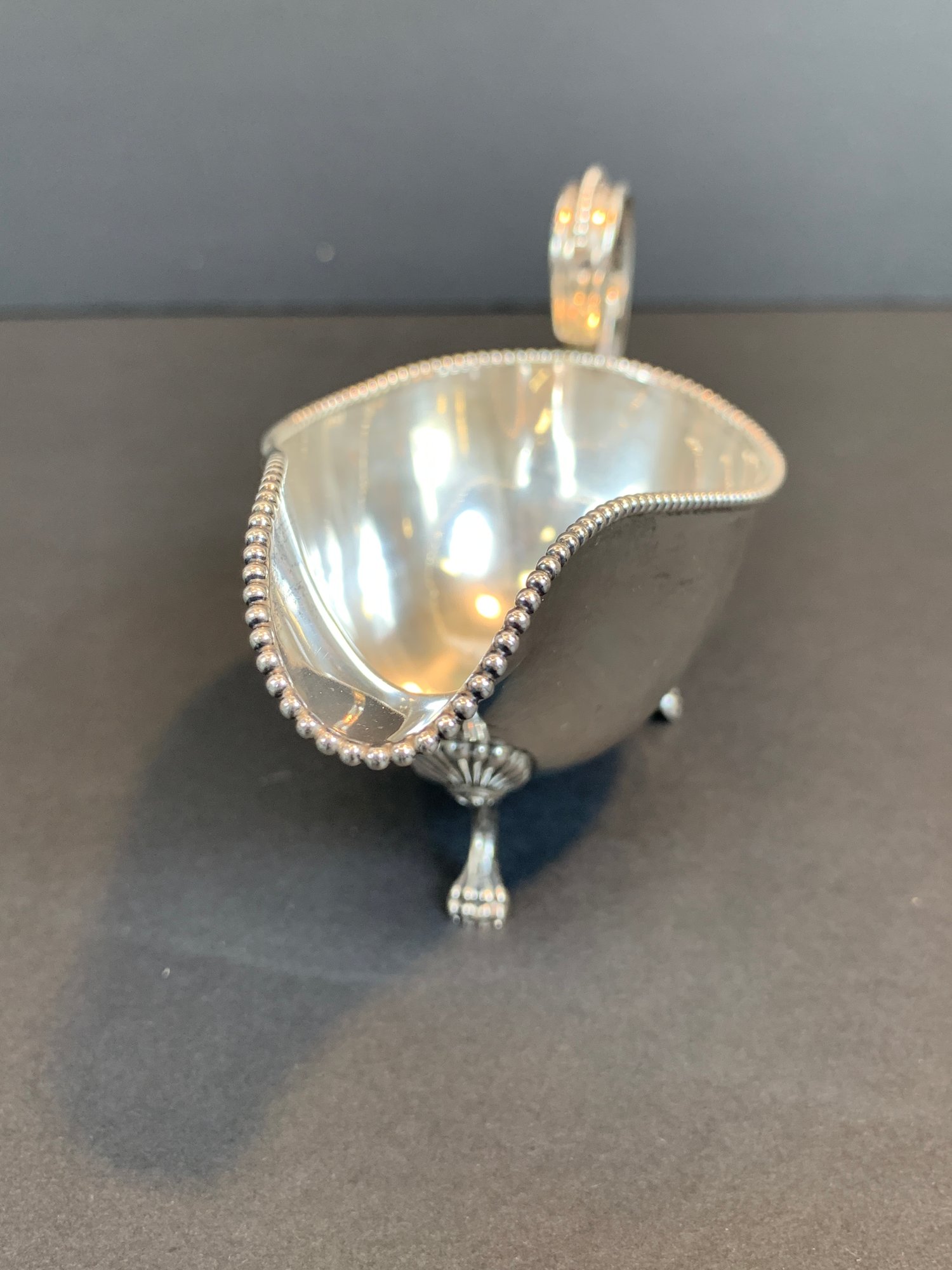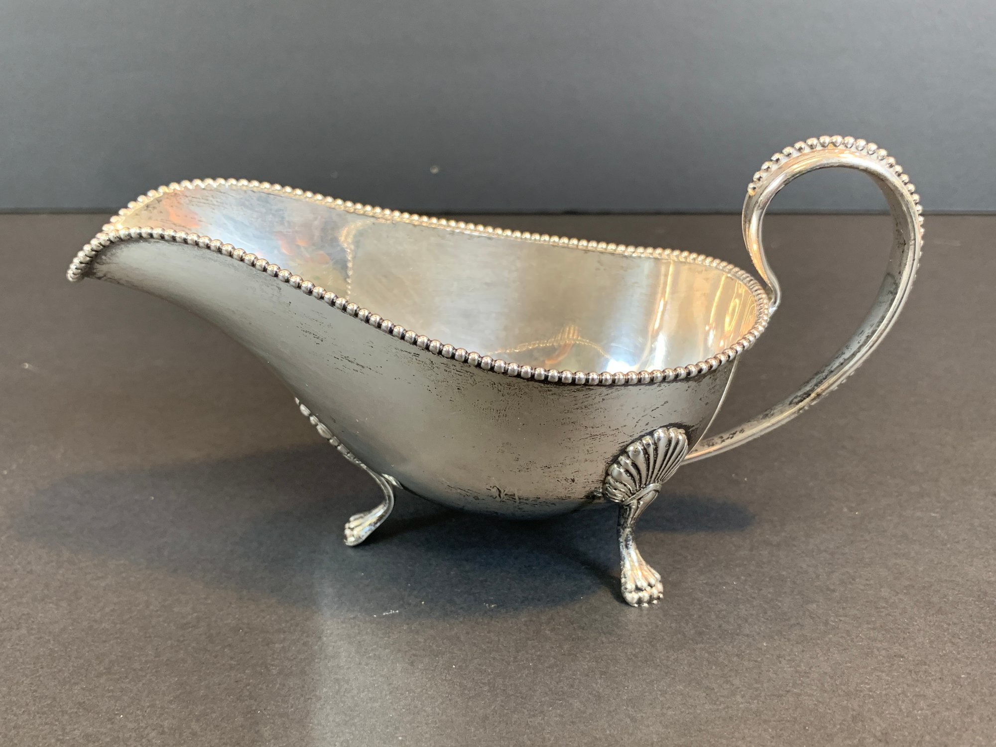 A marked Gorham sterling silver gravy boat with beaded accents and monogram.