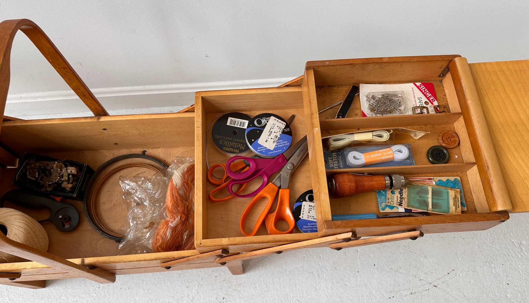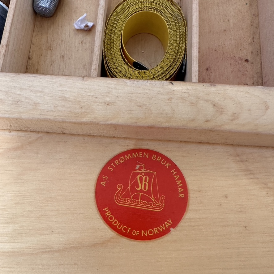 With 5 extended compartment drawers allowing for extensive storage and organization, carrying handle for easy moving when closed, with label As Strommen Bruk Hamar product of Norway.