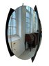 A postmodern curved black metal frame holding an oval tempered glass mirror. Also works well as a coffee table element. Designed by Louis Lara for BDI. C. 1990's.