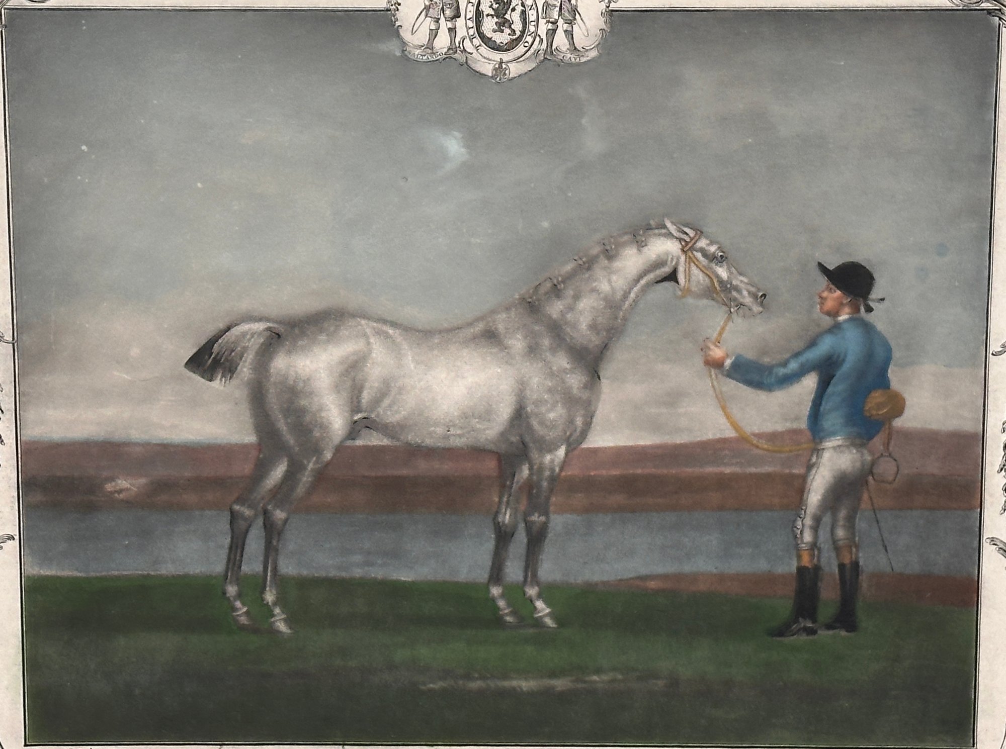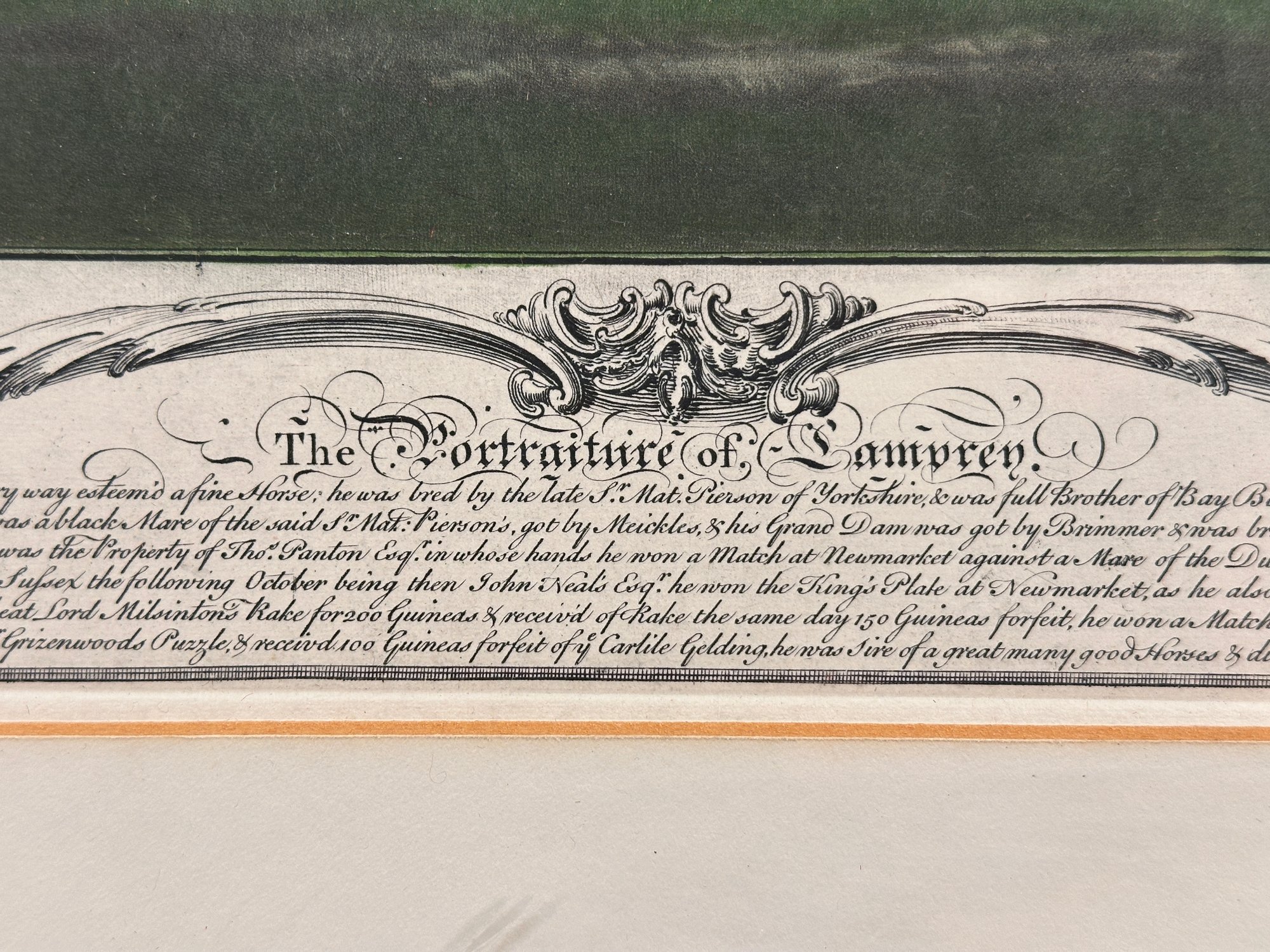 **Title:** Richard Houston hand-colored etching titled *Portrait of Lamprey*, dated 1755. A fine example of 18th-century portrait engraving with bright original coloring. Stamped in the lower left. Matted and framed under plexiglass.