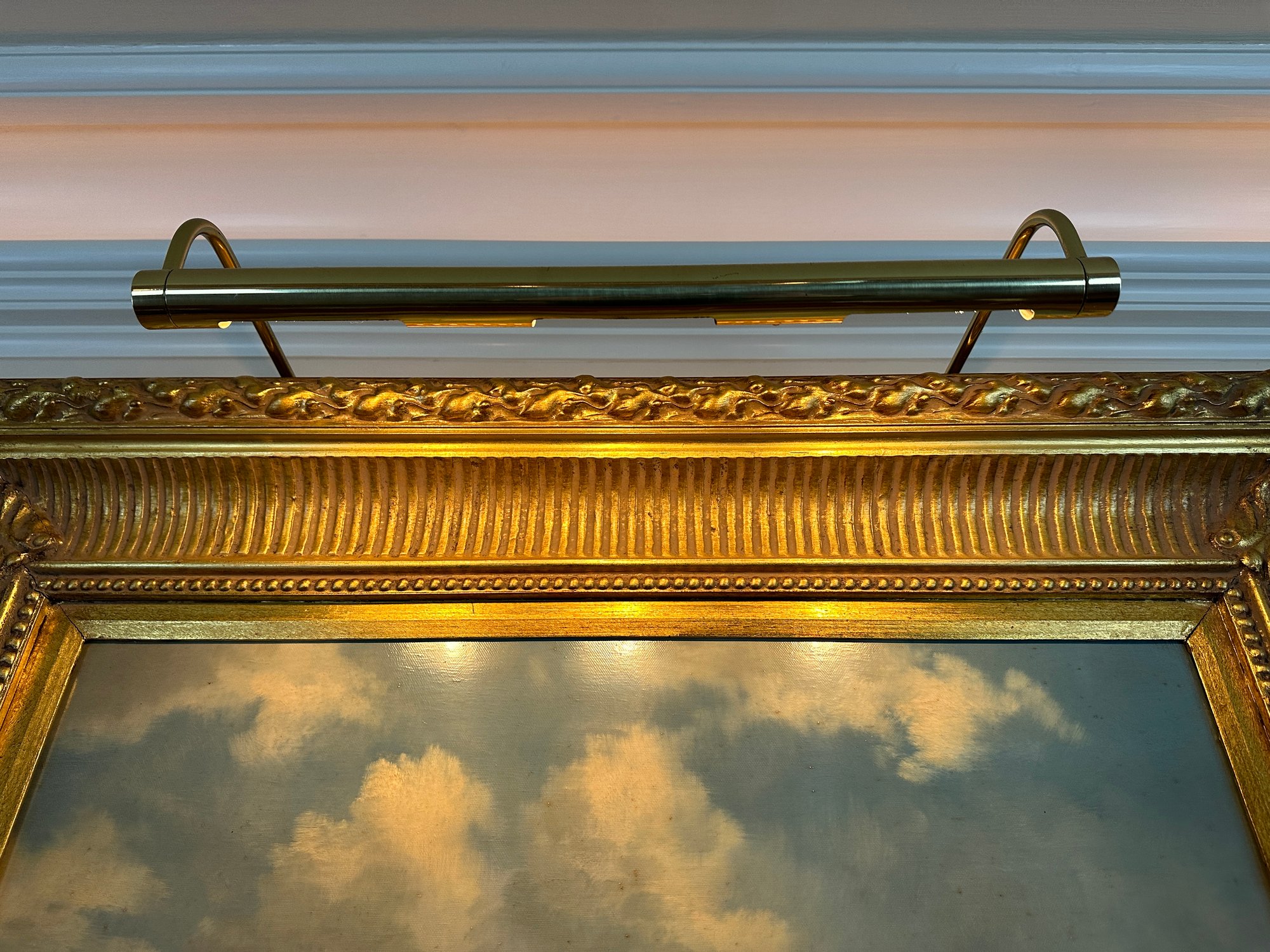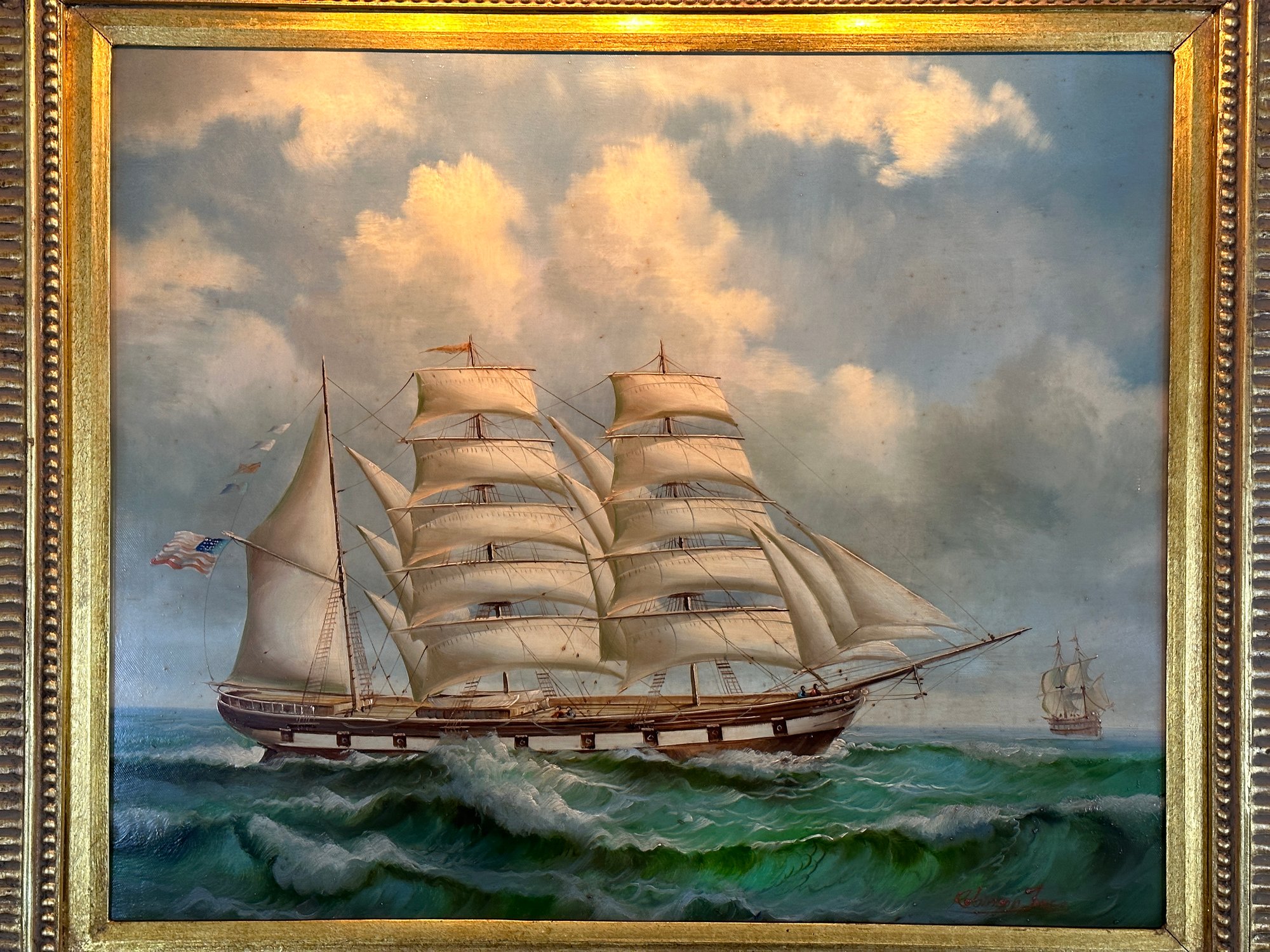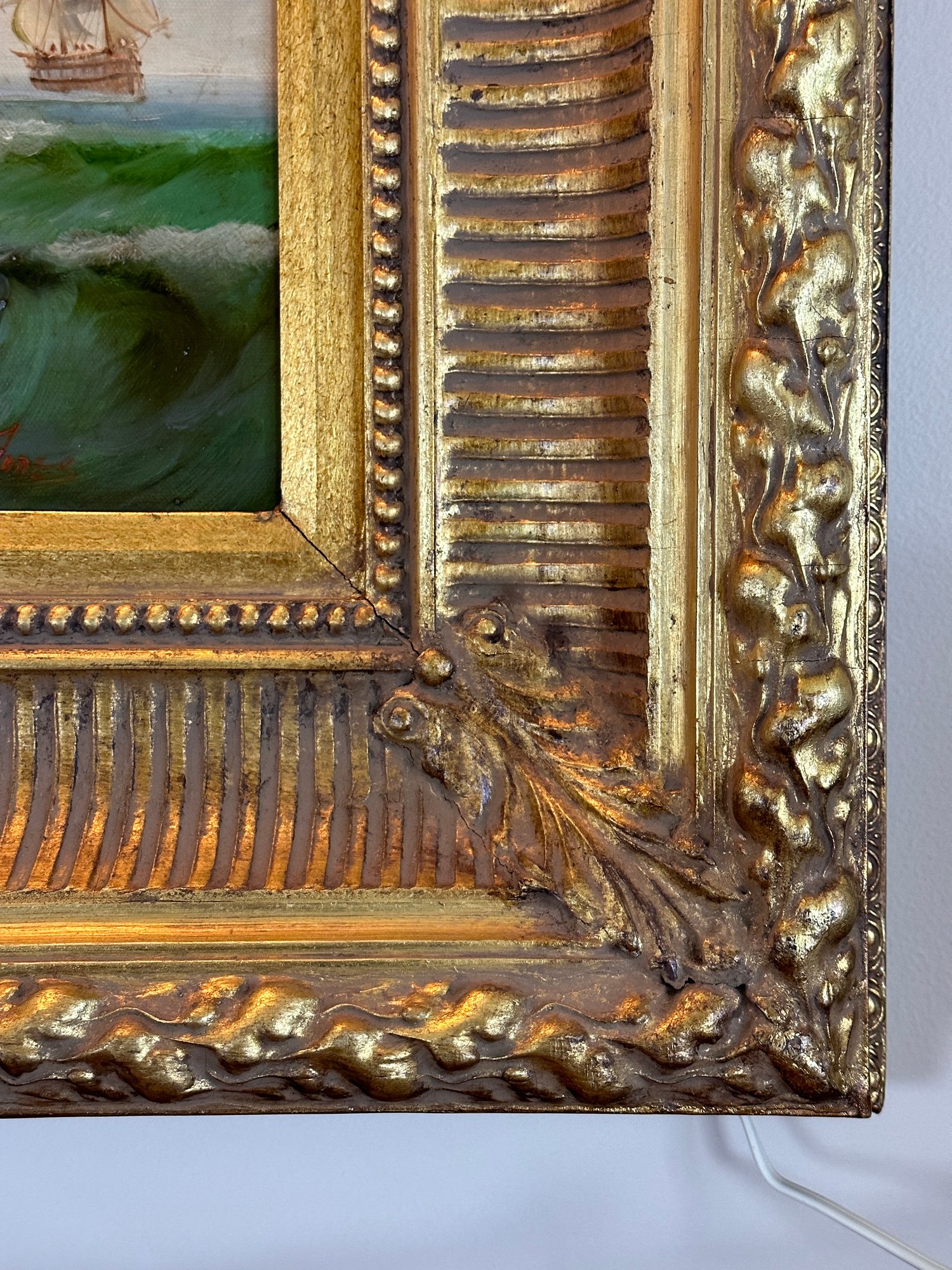 In gilt wood frame, signed lower right. Painting light attached as well.