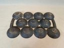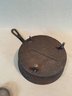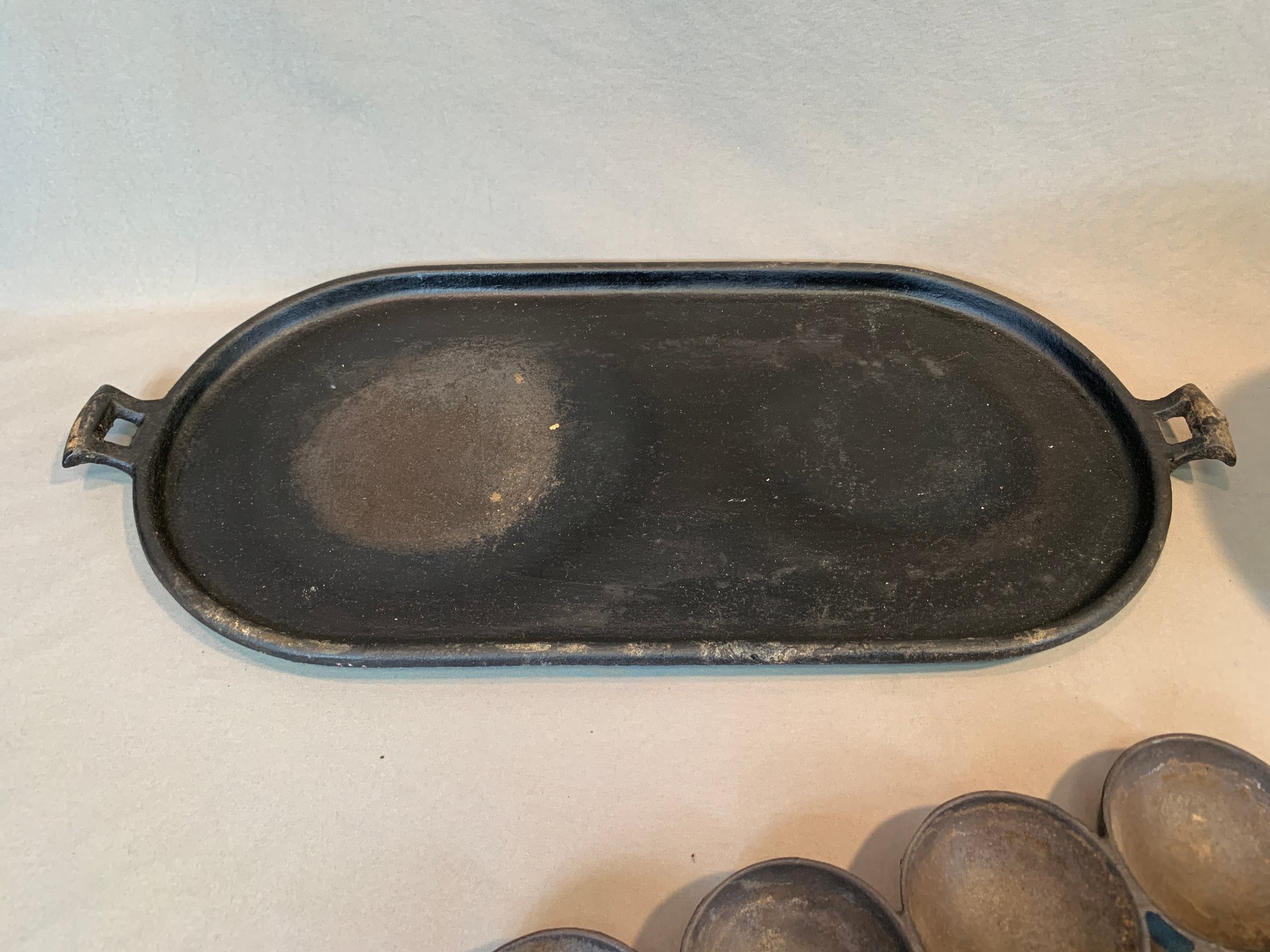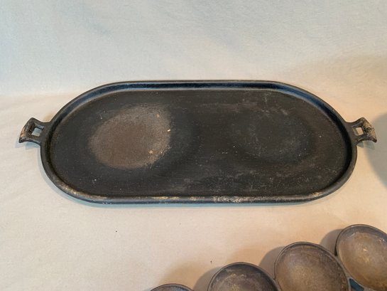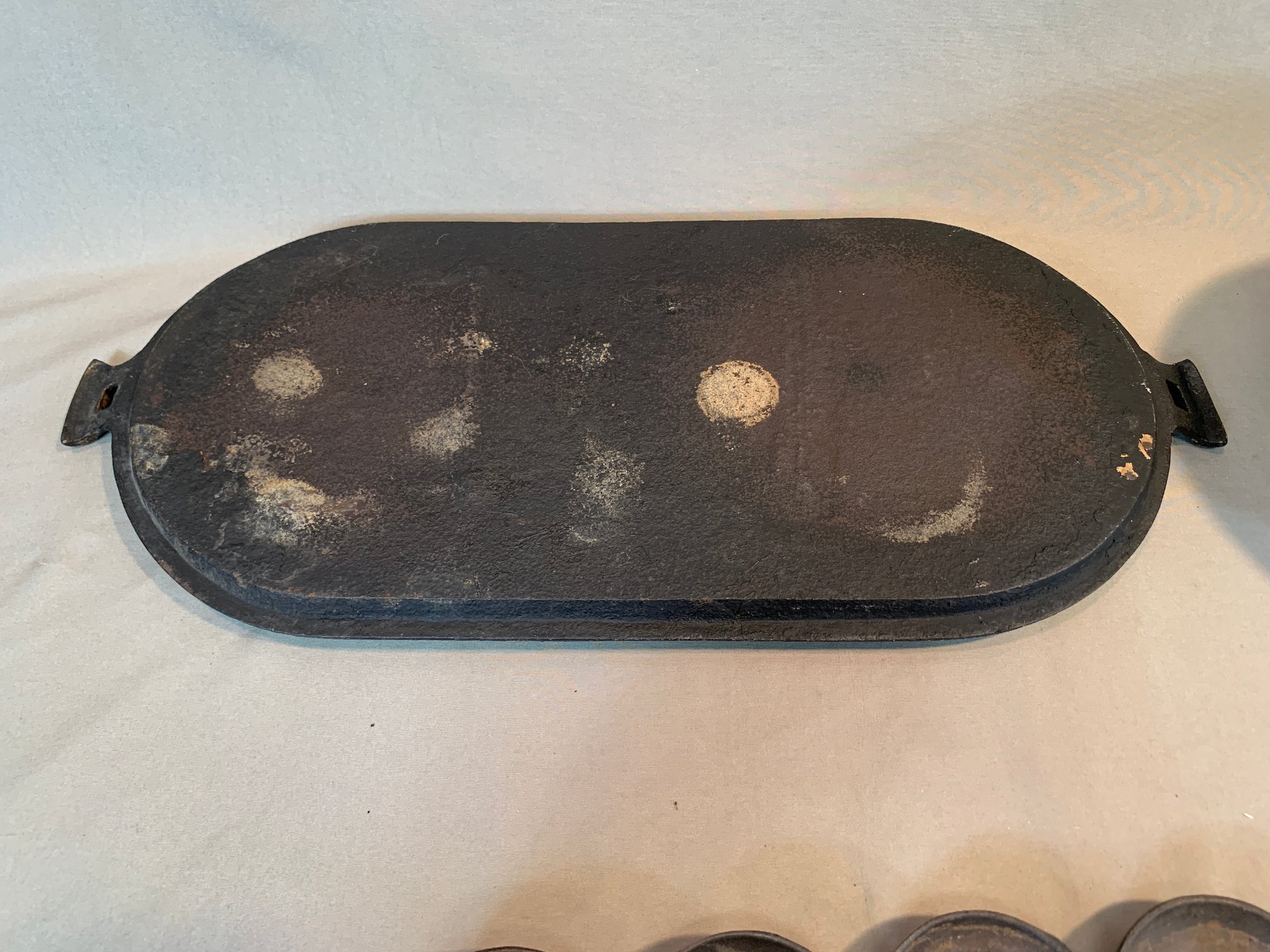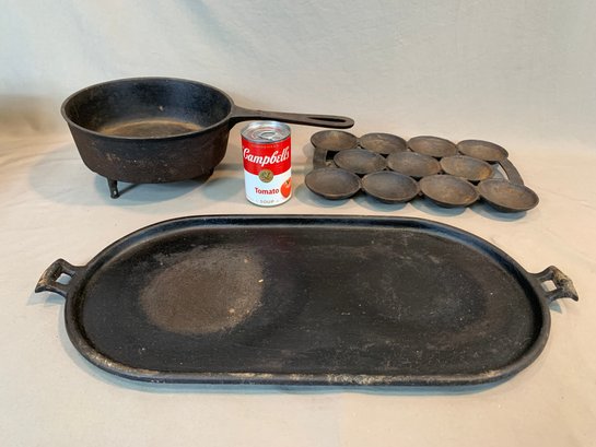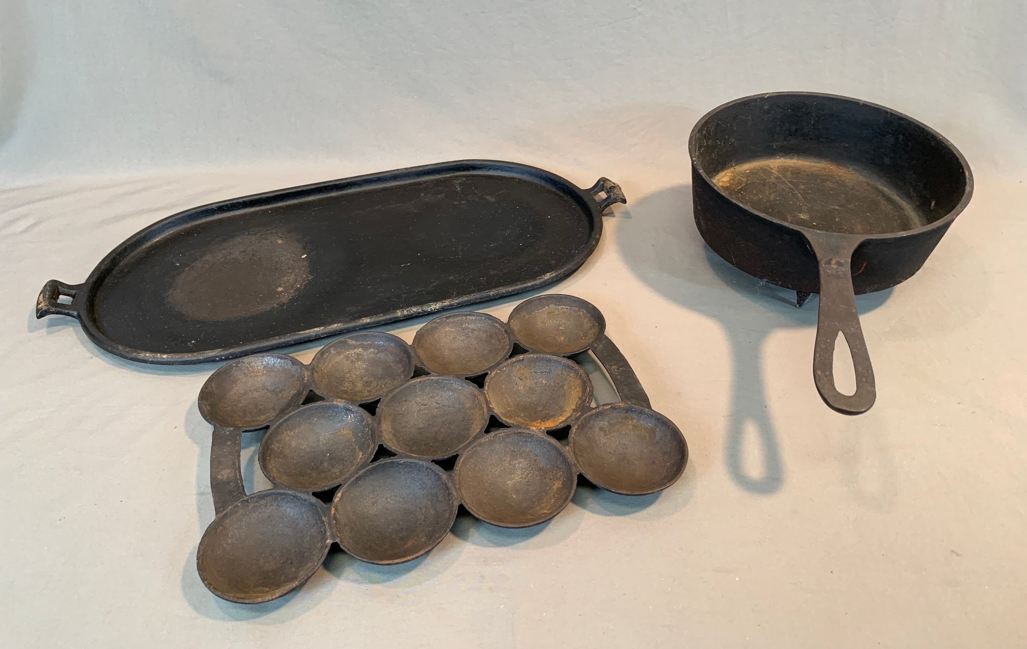 A group of three antique cast iron cooking pieces comprising an oval two-handled griddle or fish pan with number mark; a three-legged spider skillet with long flat handle and number mark, one foot more worn than the other two; and an 11-cup gem or muffin pan with illegible maker's mark.