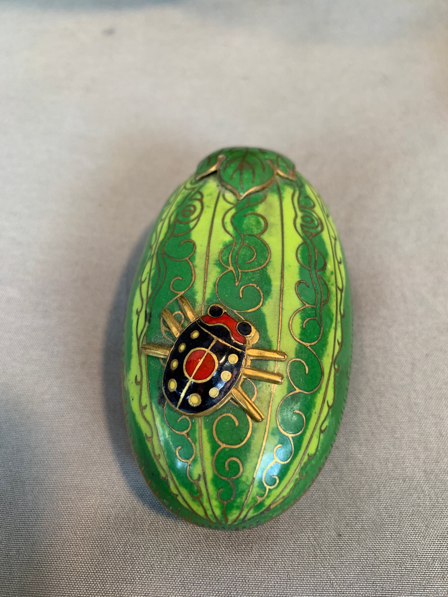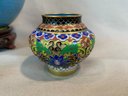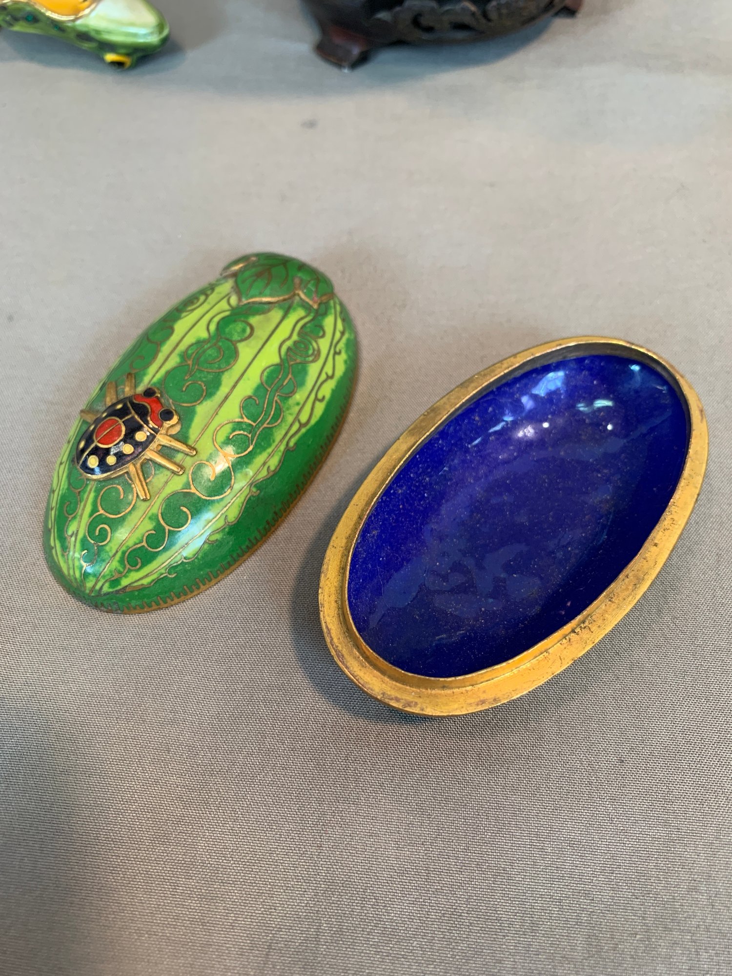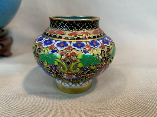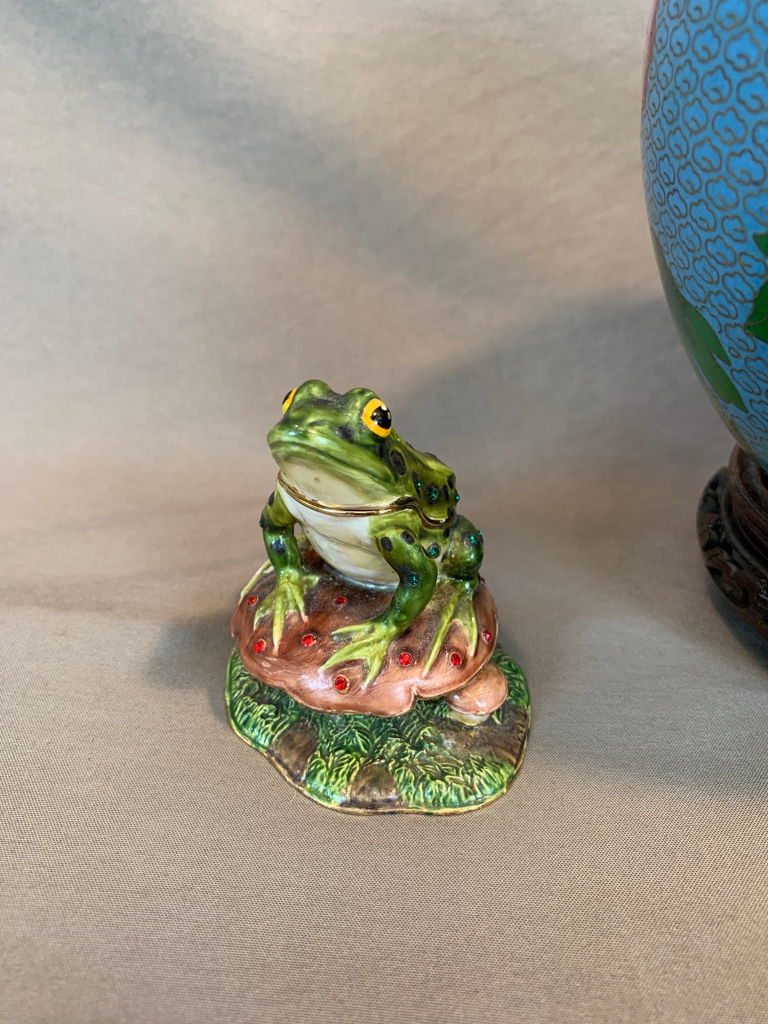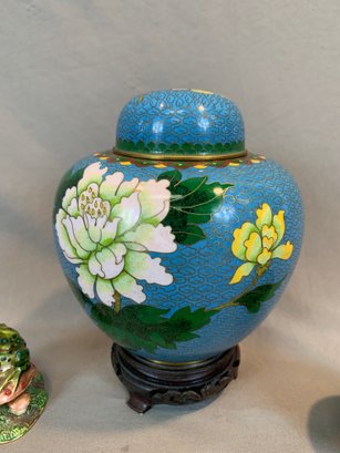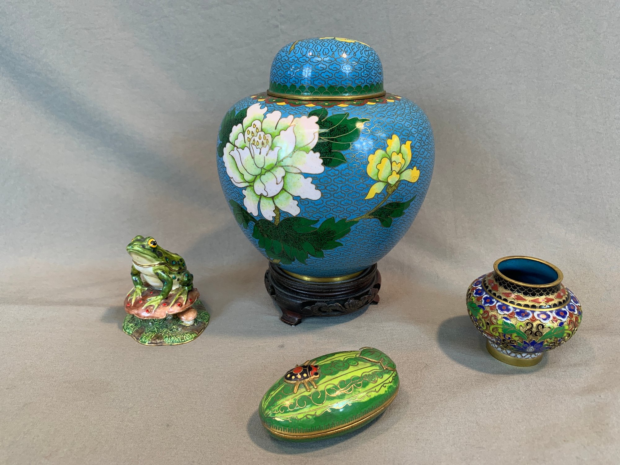 Including one covered ginger jar with peony decoration, one small cloisonne vase with multicolor decoration, an enamel box of a frog seated on a mushroom base, green cloisonné pea pod trinket box with ladybug motif.
