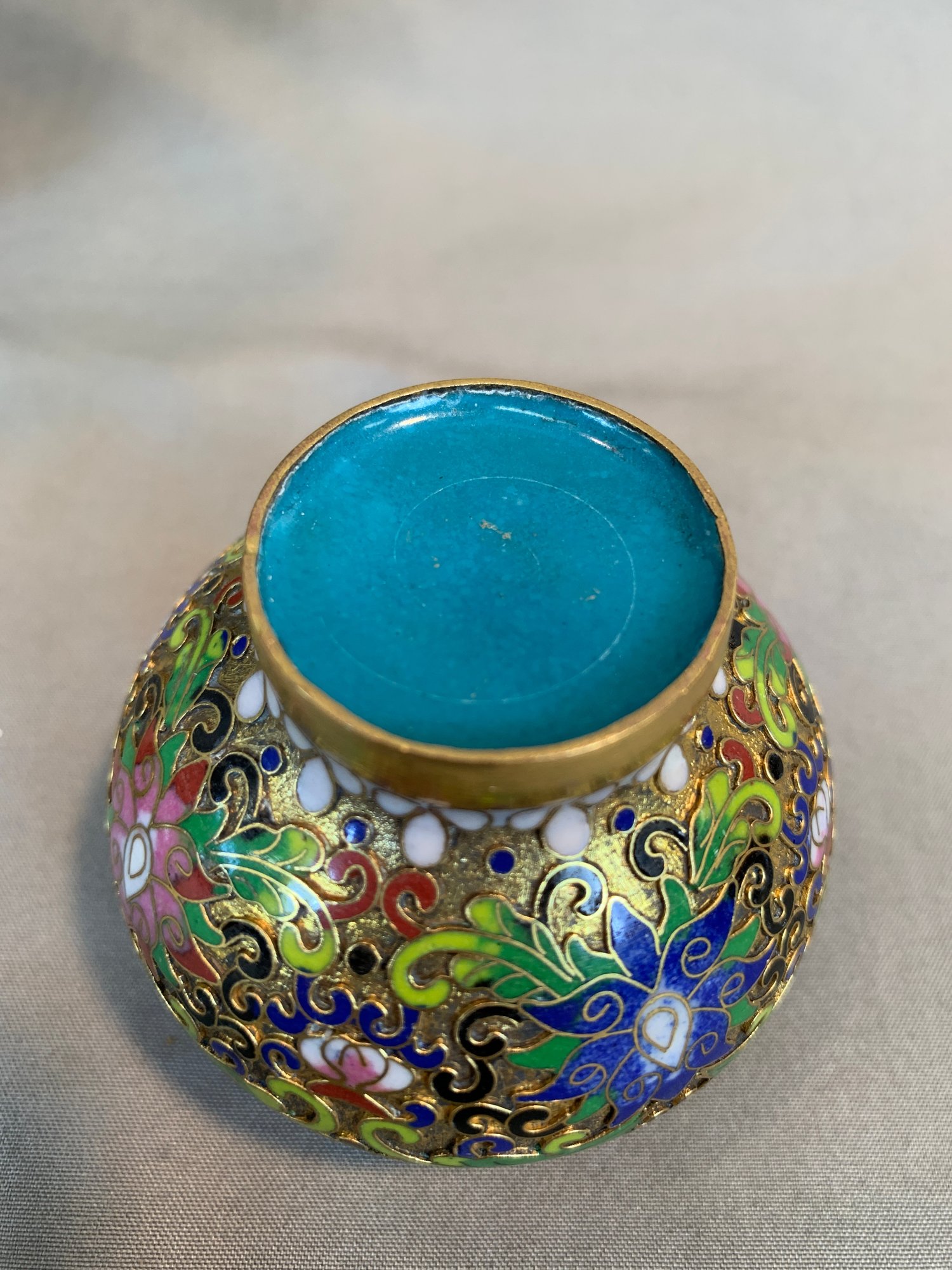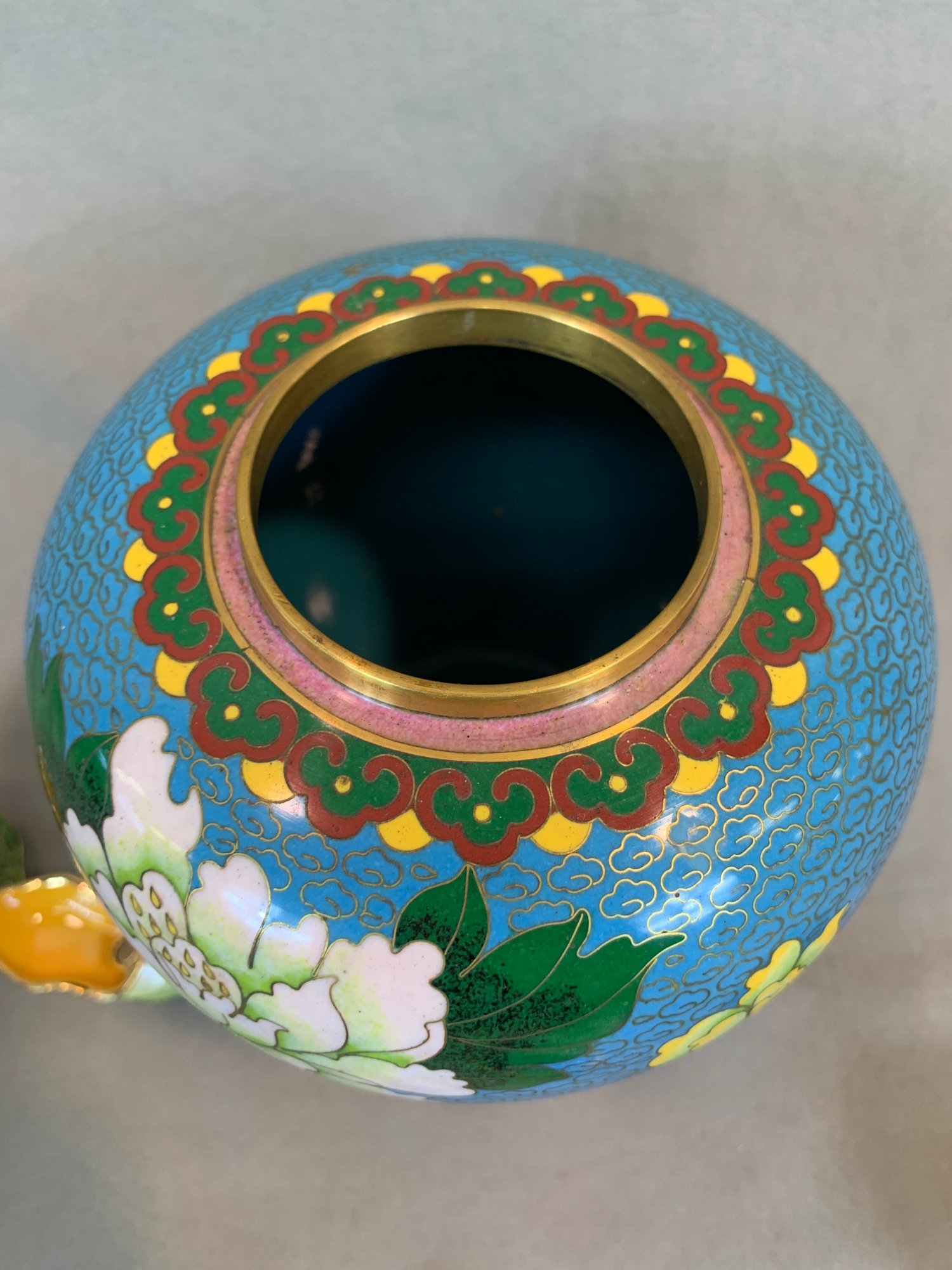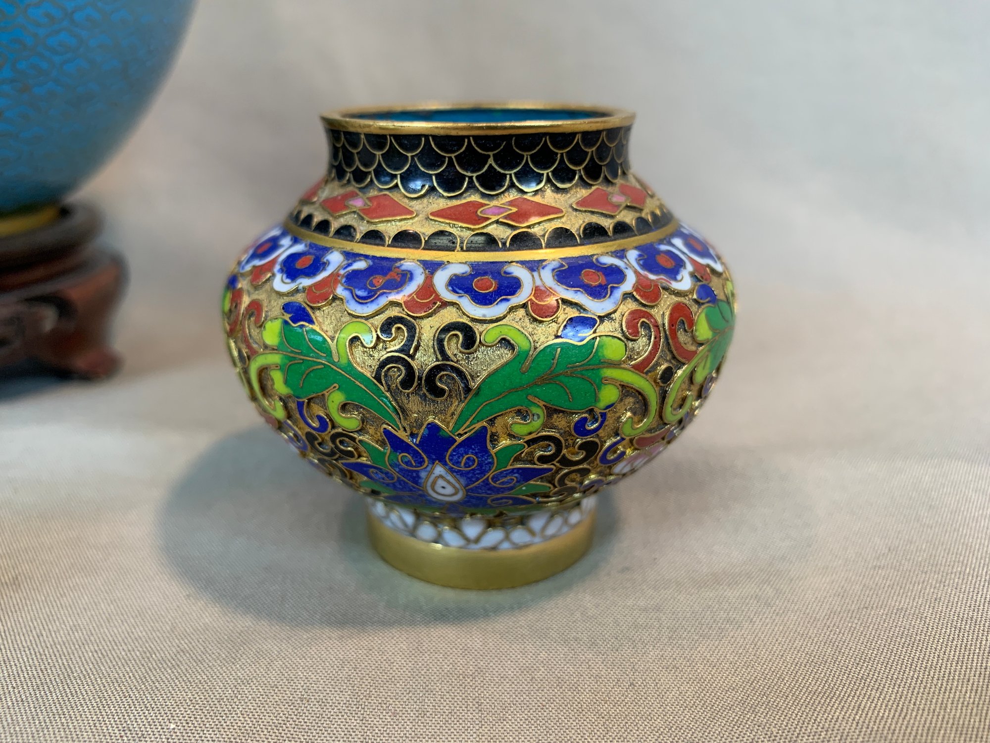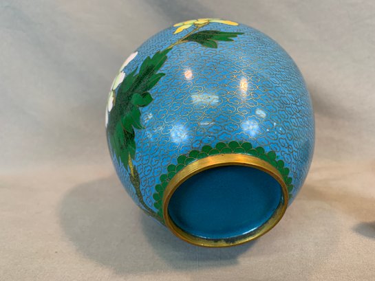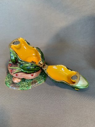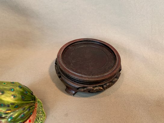 Including one covered ginger jar with peony decoration, one small cloisonne vase with multicolor decoration, an enamel box of a frog seated on a mushroom base, green cloisonné pea pod trinket box with ladybug motif.