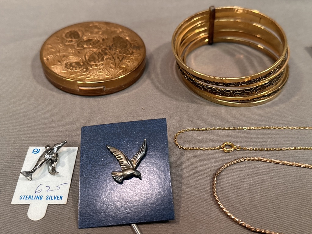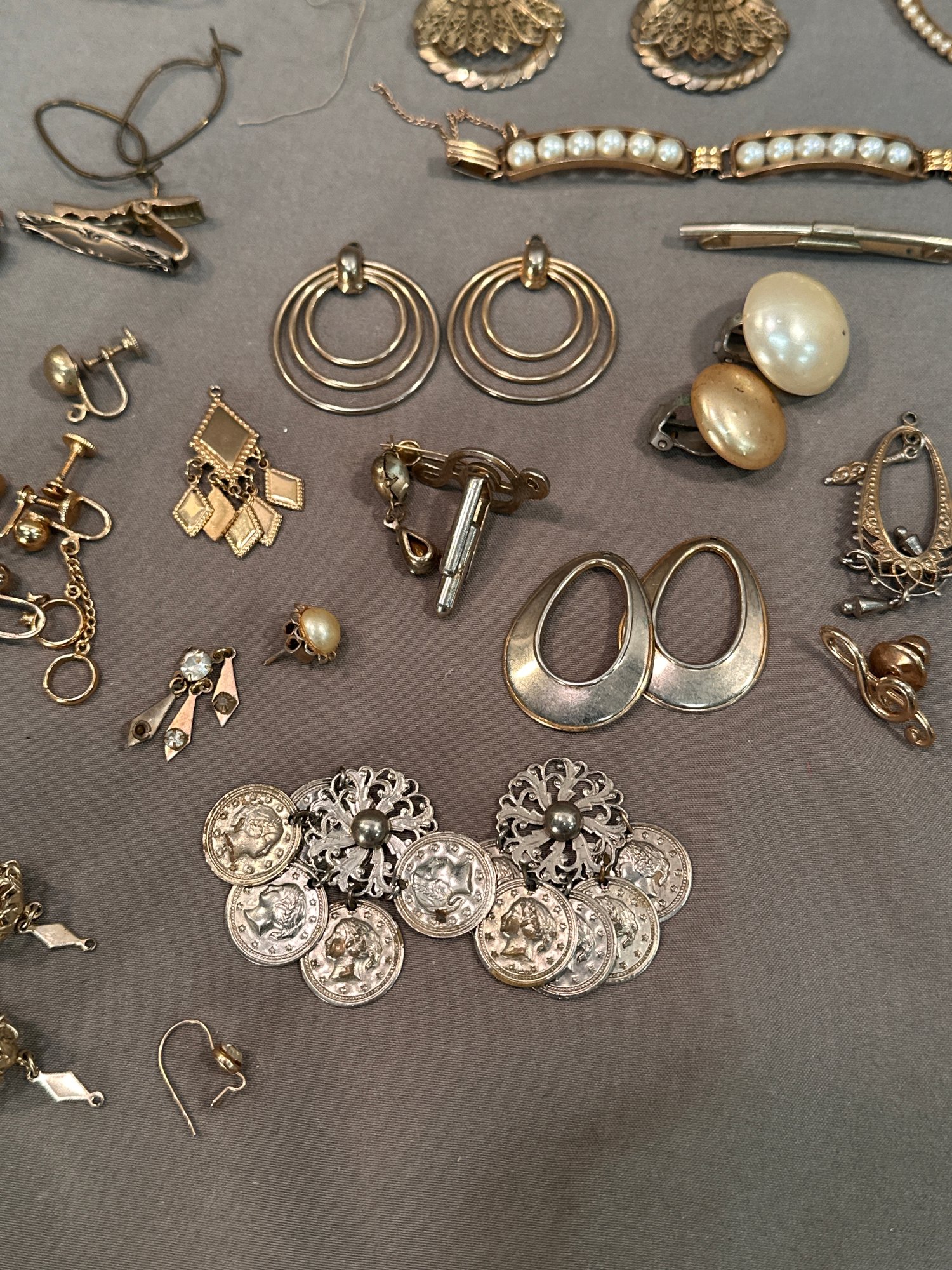 Including pierced and clip earrings, a gold filled pearl bracelet, a compact ,necklaces, various bracelets, cufflinks, charms.