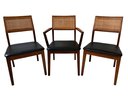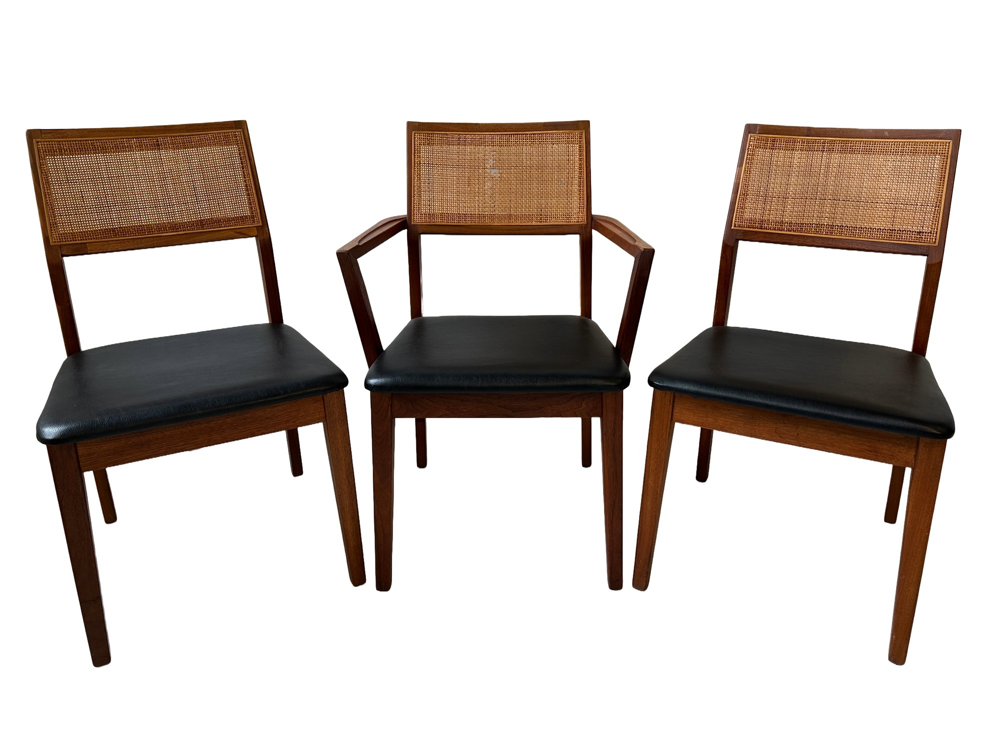 A set of three stylish caned and sculpted walnut chairs mixed with black vinyl seats. In the manner of Jack Cartwright. Labeled Hibriten Furniture Co.