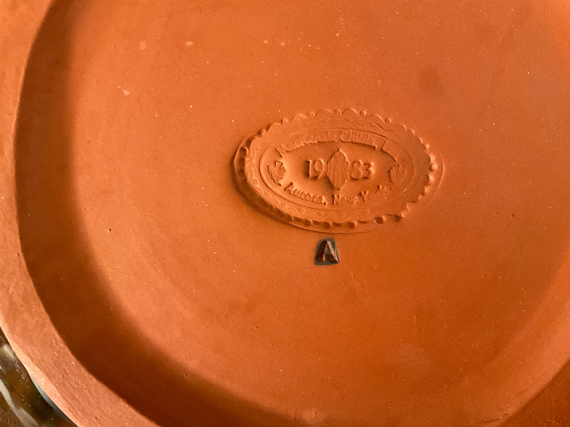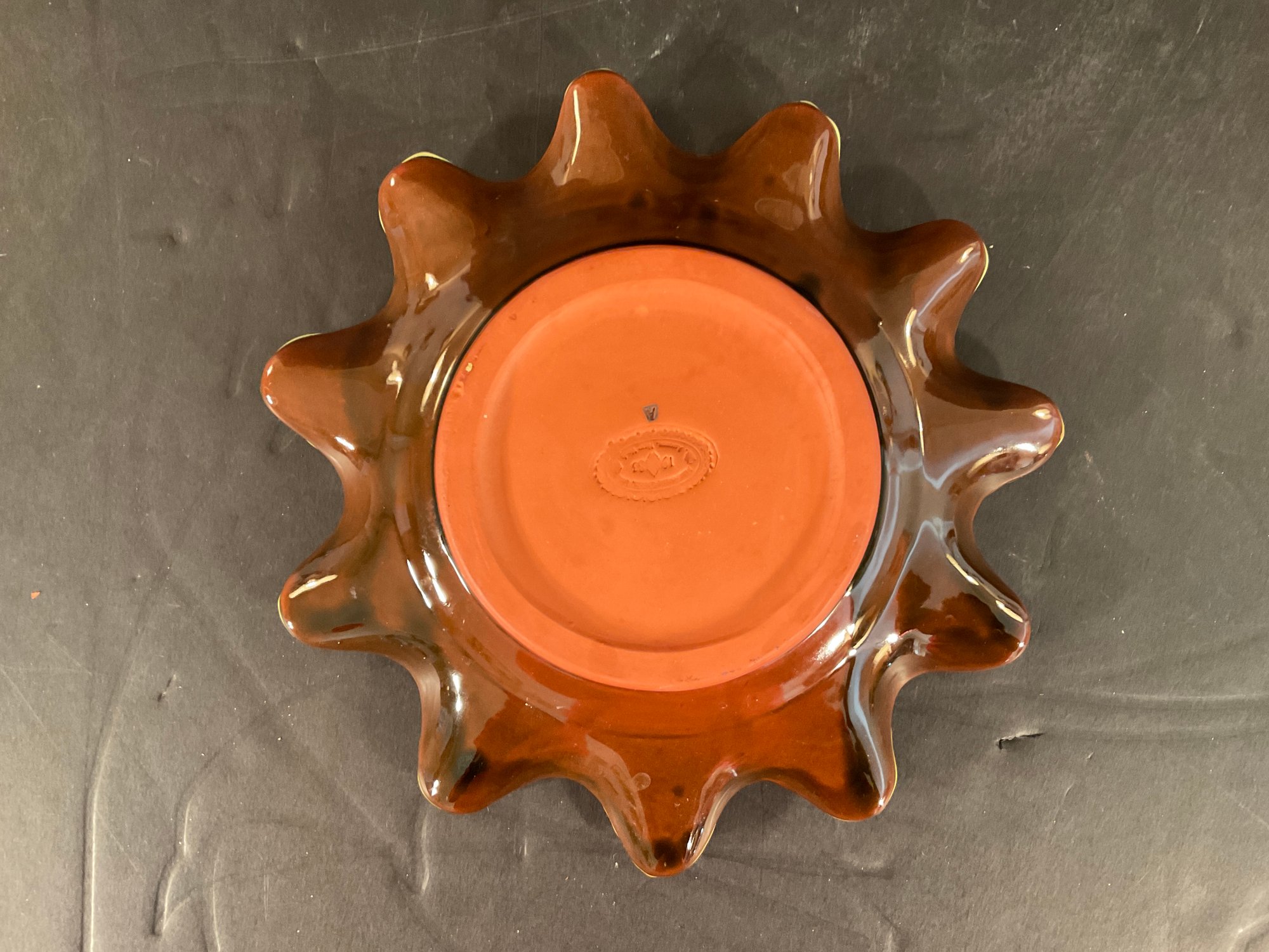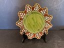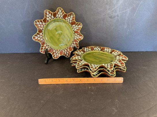 A lime green ceramic glaze with brown colored edging and rose petals applied atop the glaze. All plates have back stamps.
