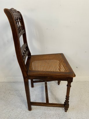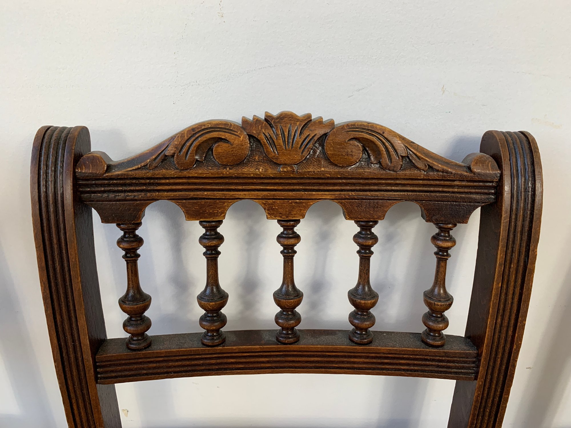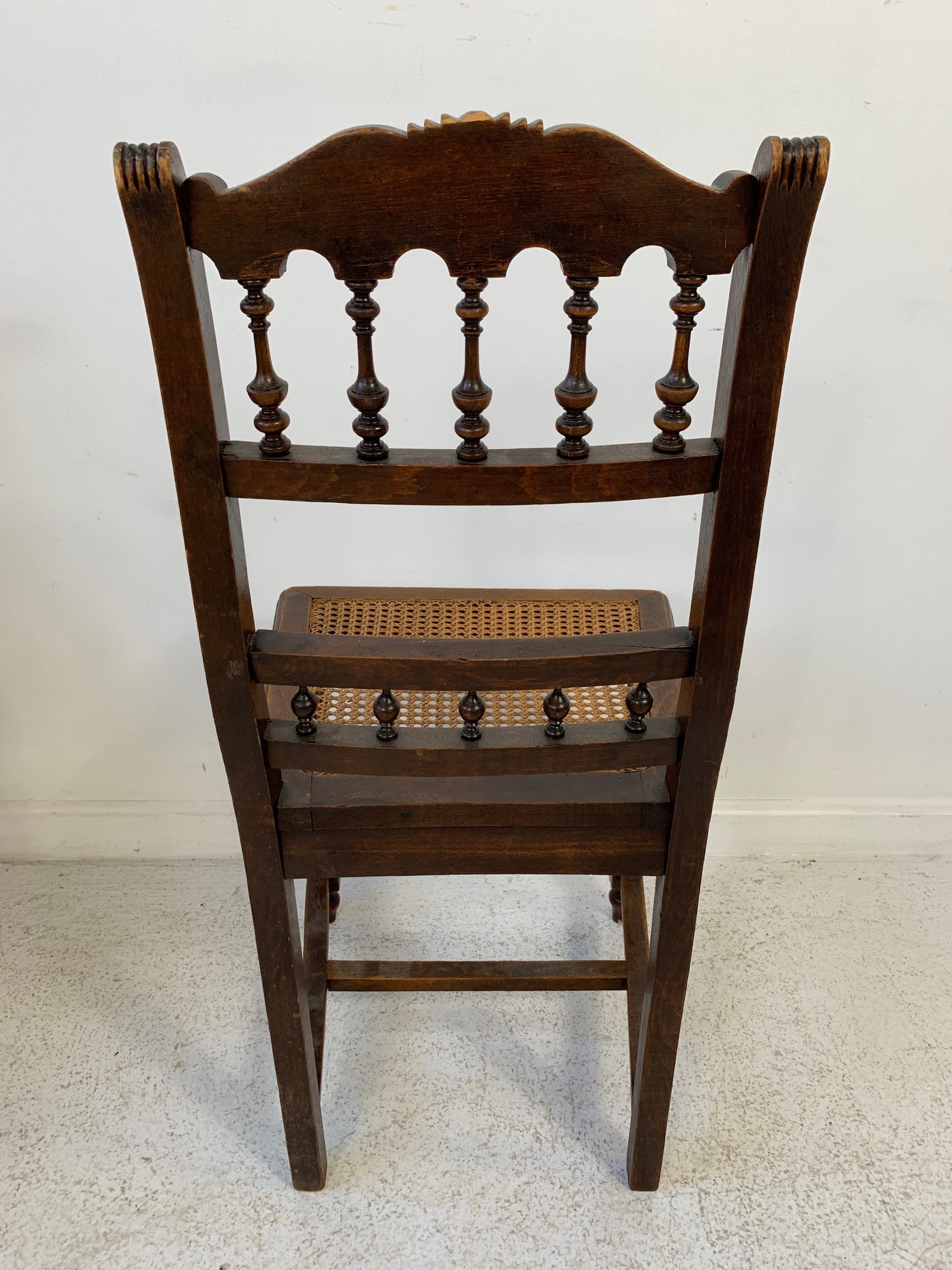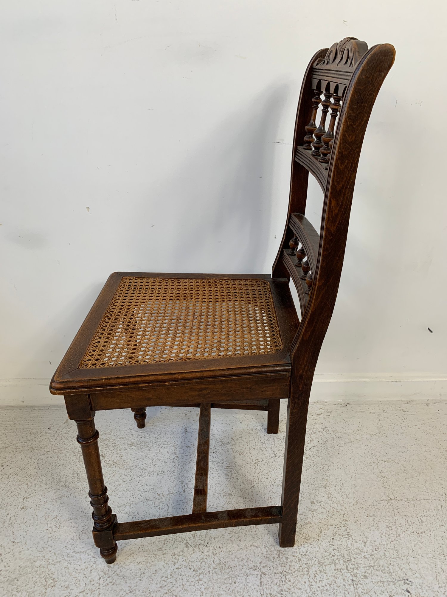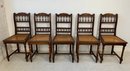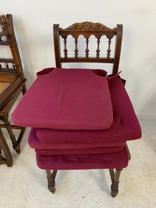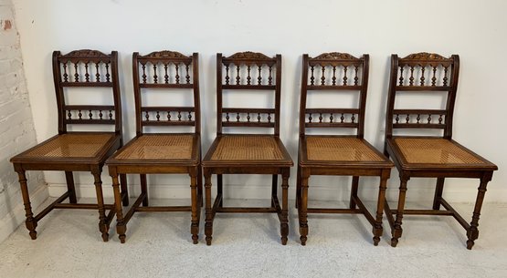A set of five matching Victorian oak side chairs, each with a carved cresting rail, turned spindle backs, caned seats, turned legs and stretchers. Comes with burgundy fabric seat cushions. Late 19th century.