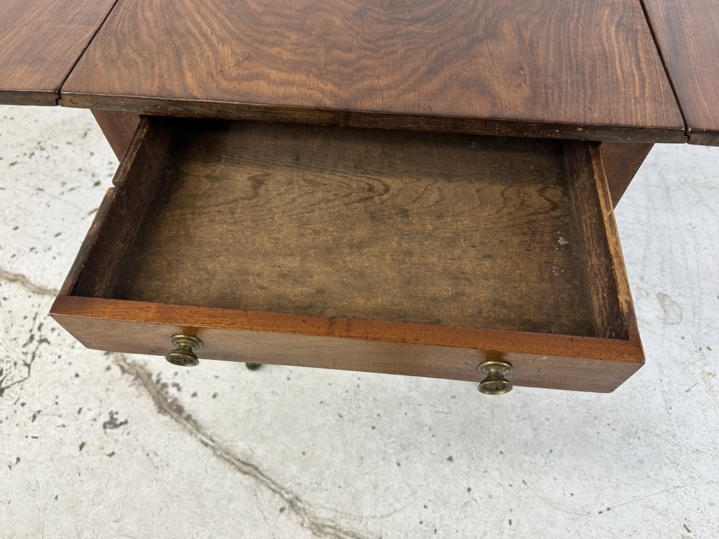 An American antique Sheraton mahogany pembroke drop leaf table. Featuring one drawer with shaped leaves and tapered reeded legs on brass ball feet. Circa 1800-1820s