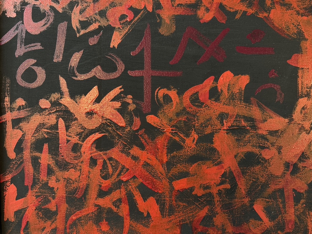 An abstract oil on canvas with red paint on a black canvas with symbols across the composition, signed on reverse Brainard.