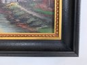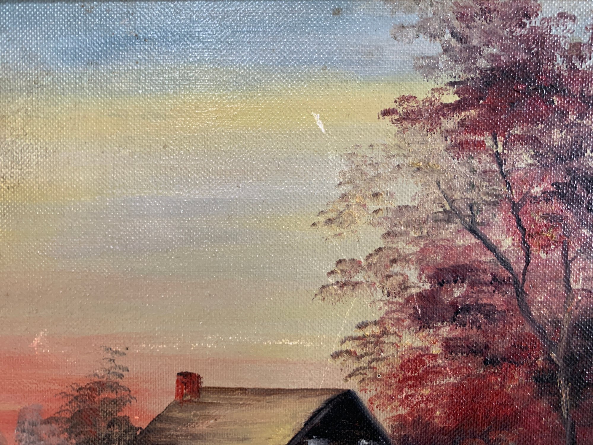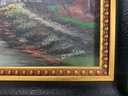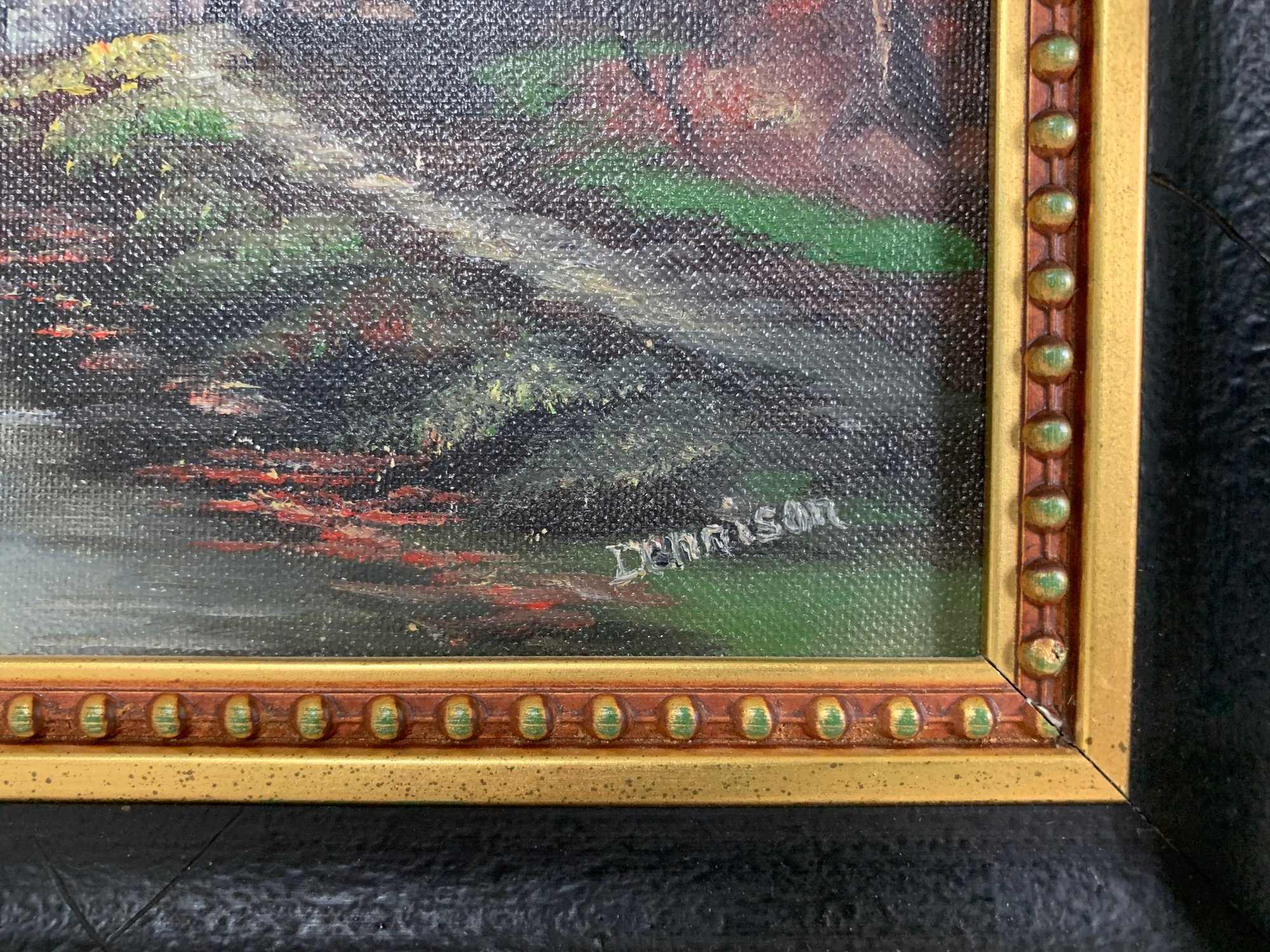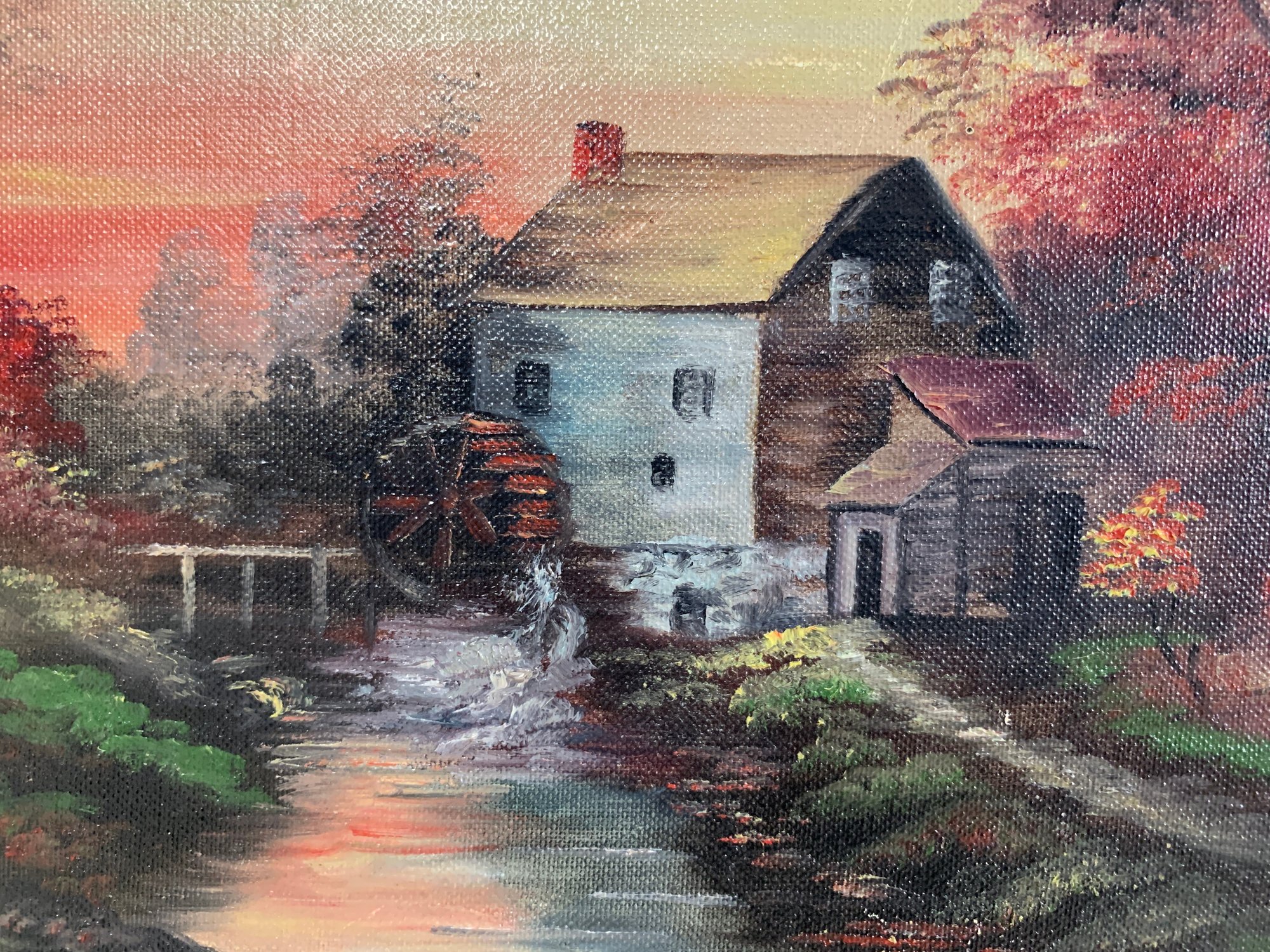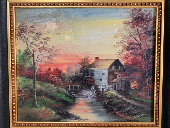 Acrylic on board, signed Dennison depicting a country landscape with a mill house adjacent to a river. There is area of rubbing upper left