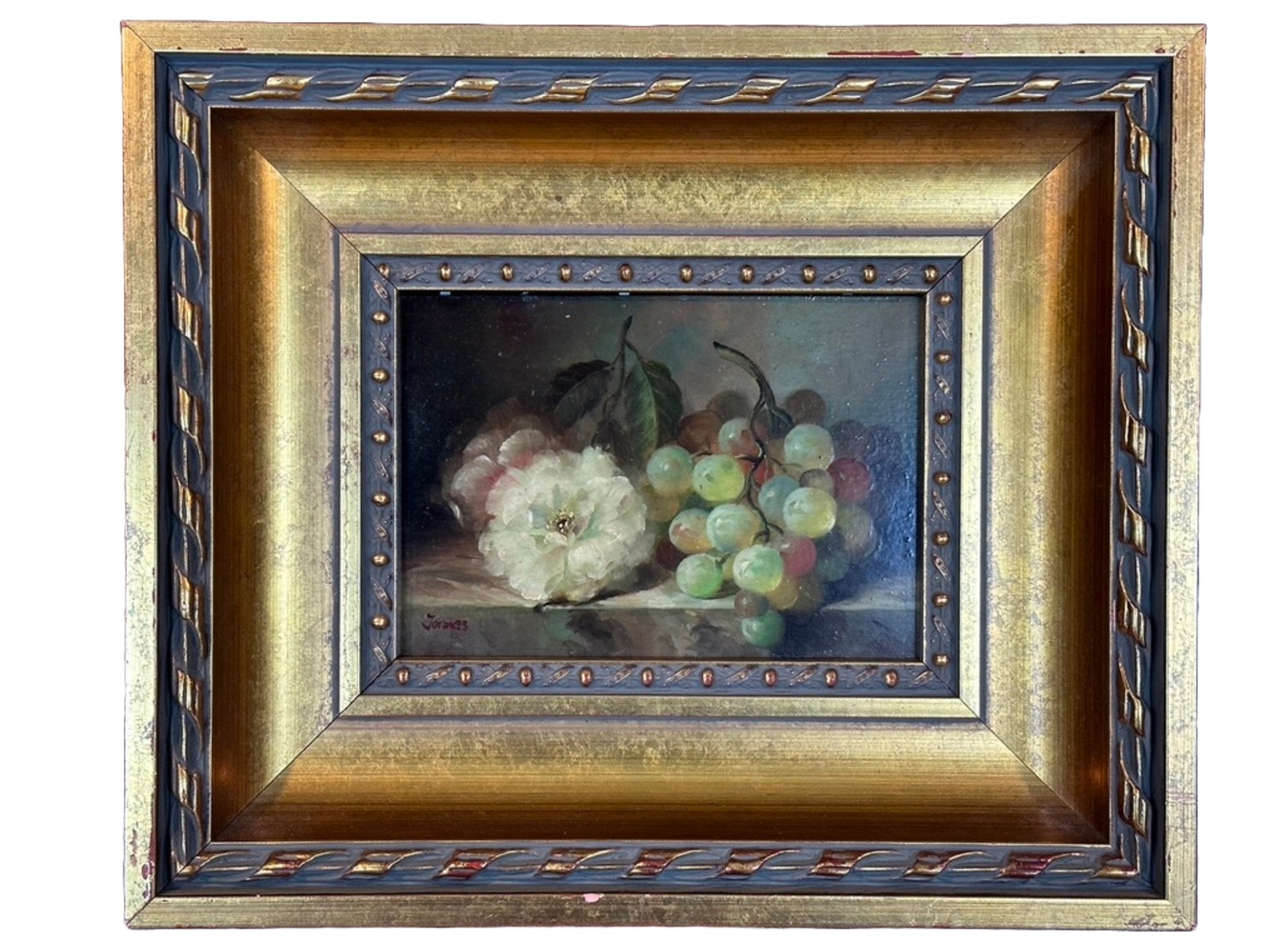 Depicting a still life scene of grapes and white flowers. Signed lower left.
