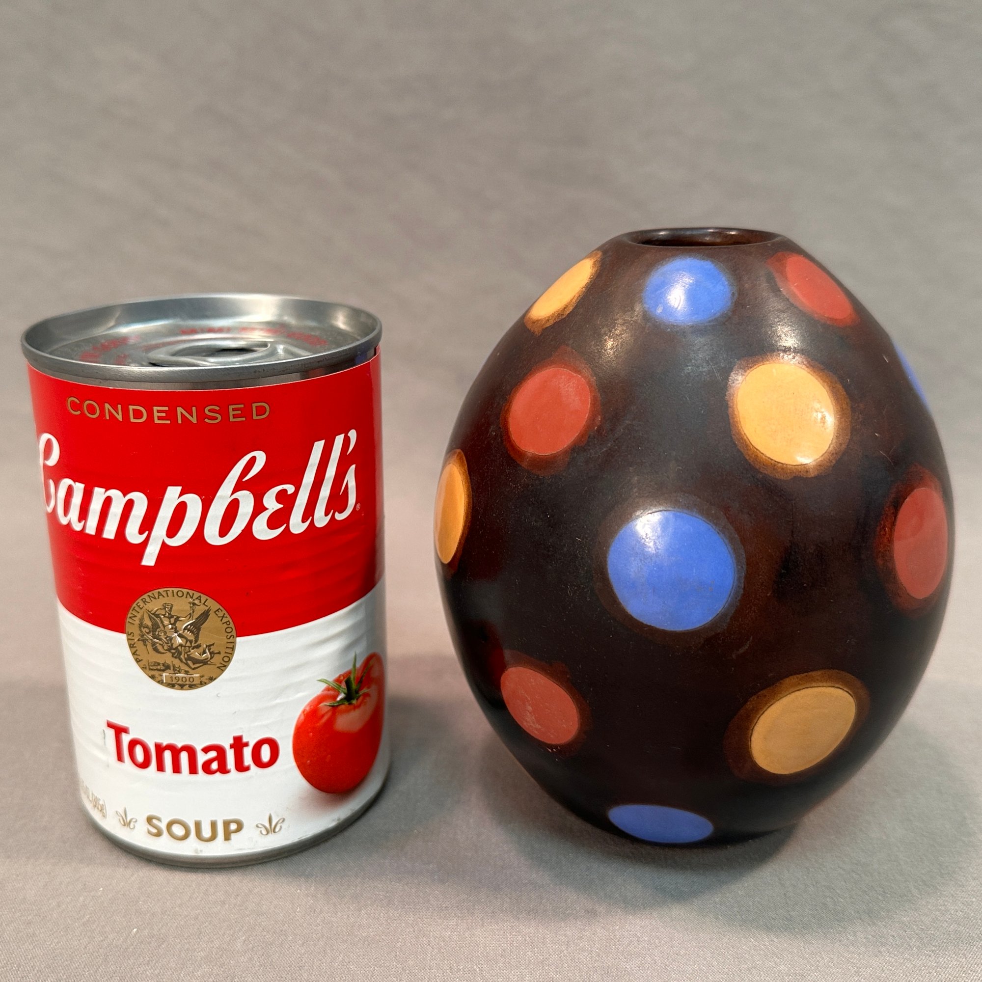 Signed on bottom, brown background with blue, yellow and red polka dots.