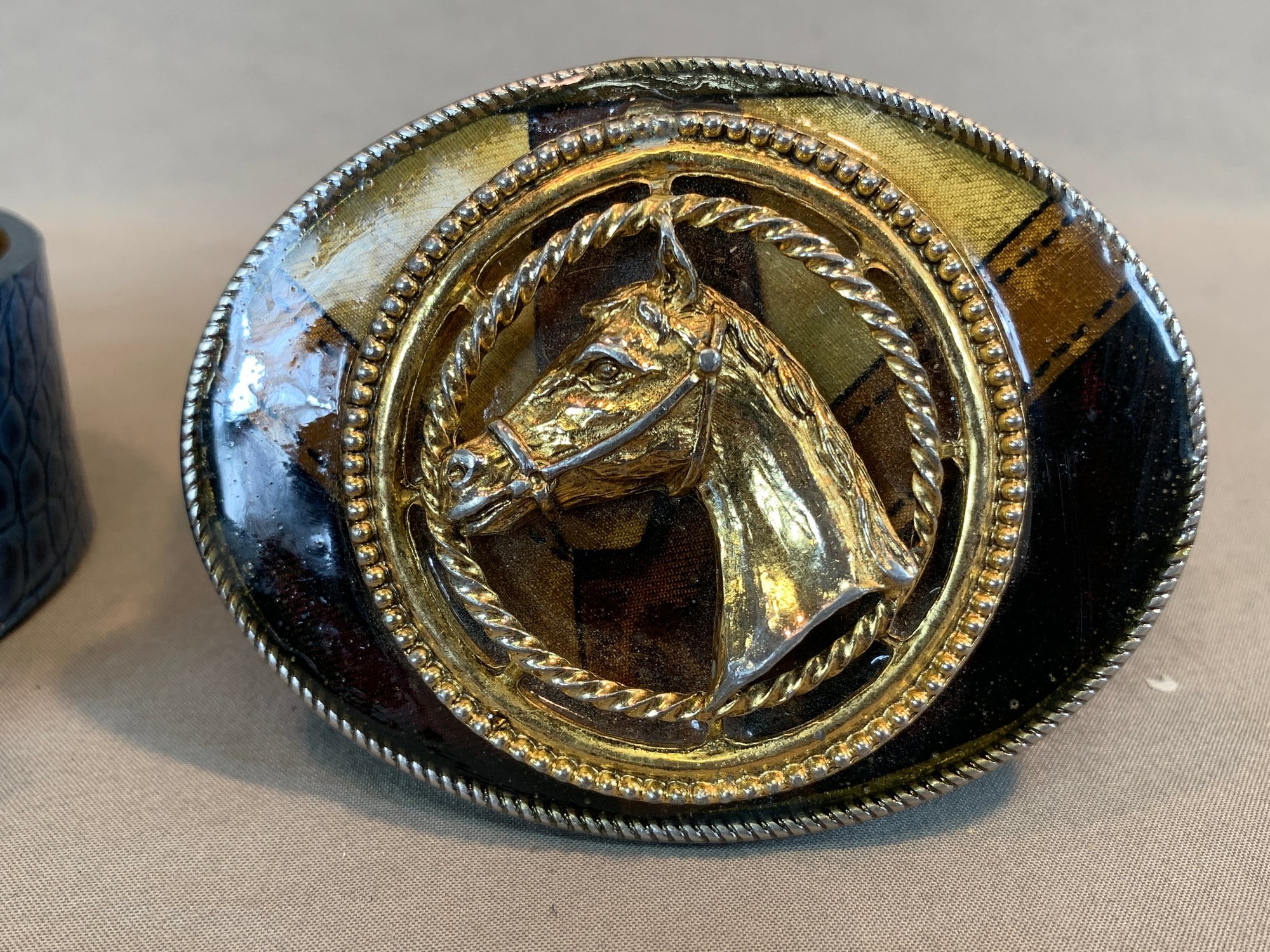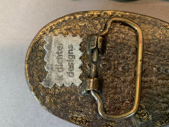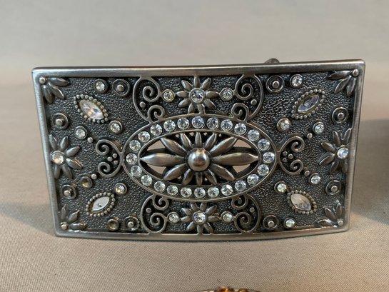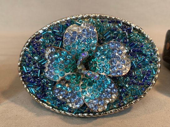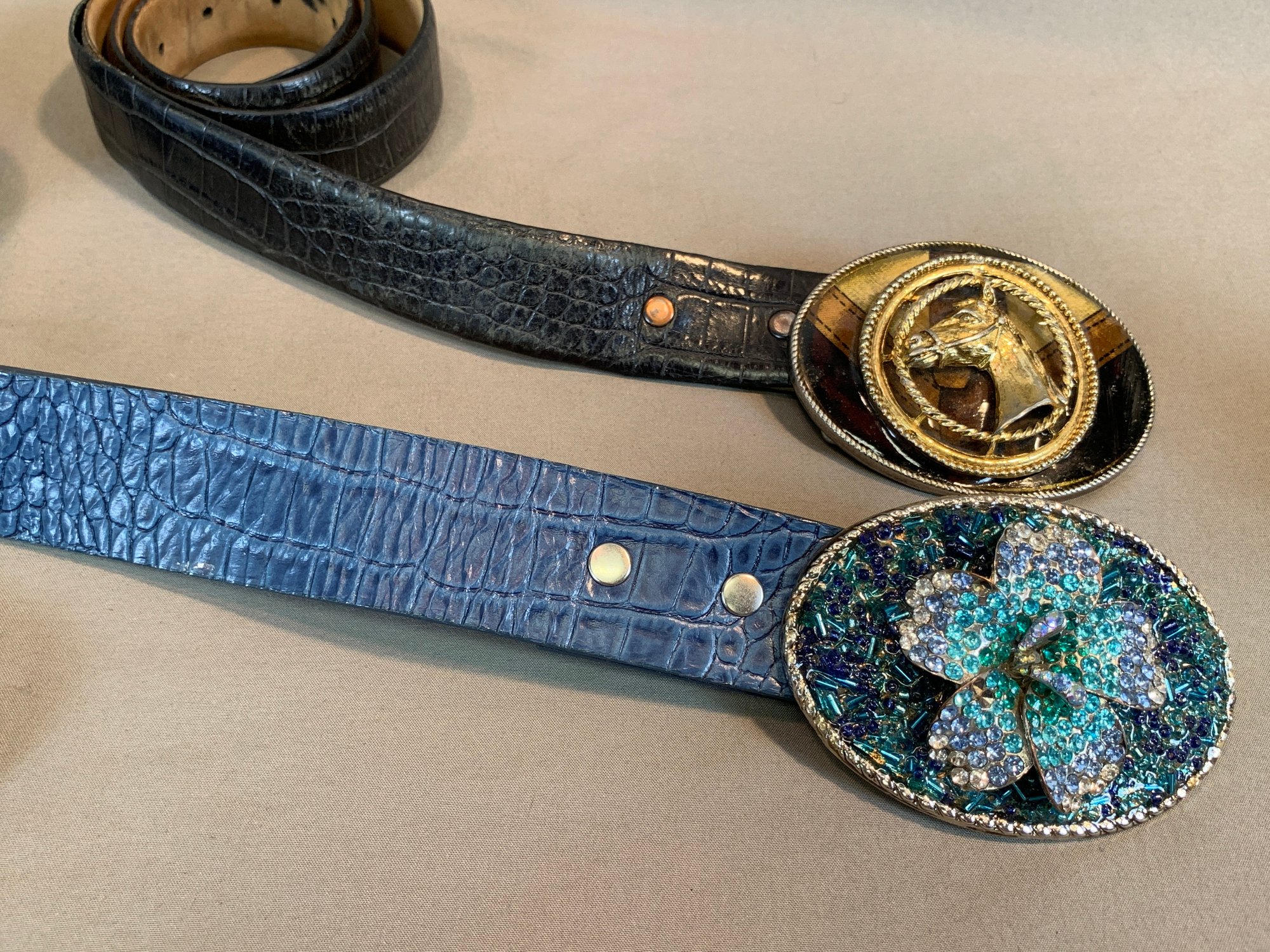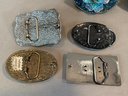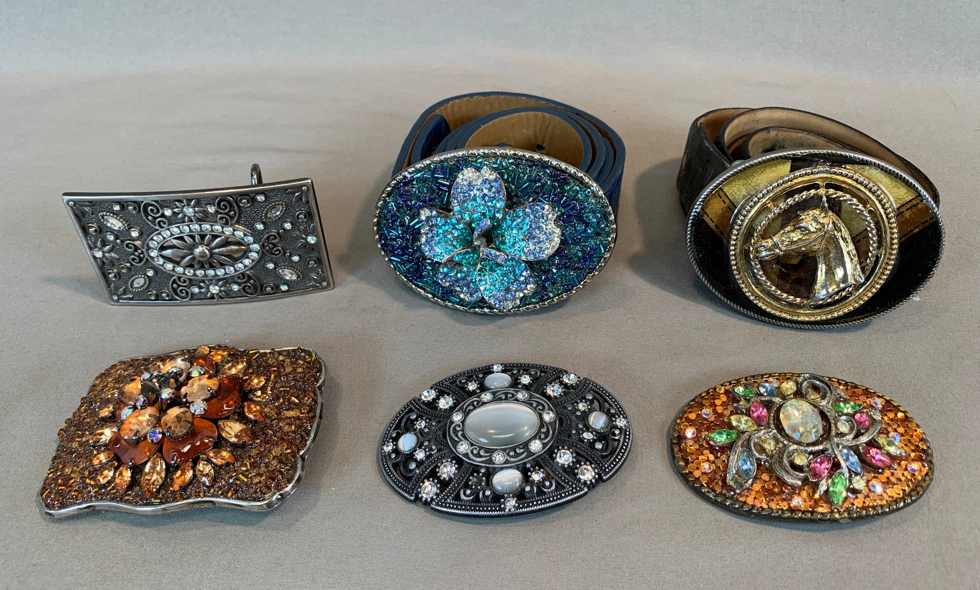 Three belt buckles by noted American artisan Karen Ditcher, each featuring her micro-bead ground with layered crystal embellishment: a blue seed bead butterfly buckle on blue leather belt, an amber and topaz crystal cluster buckle, and a multicolor crystal oval buckle. Only one with label. Together with three additional decorative rhinestone belt buckles including a western horsehead example on reptile-look belt.