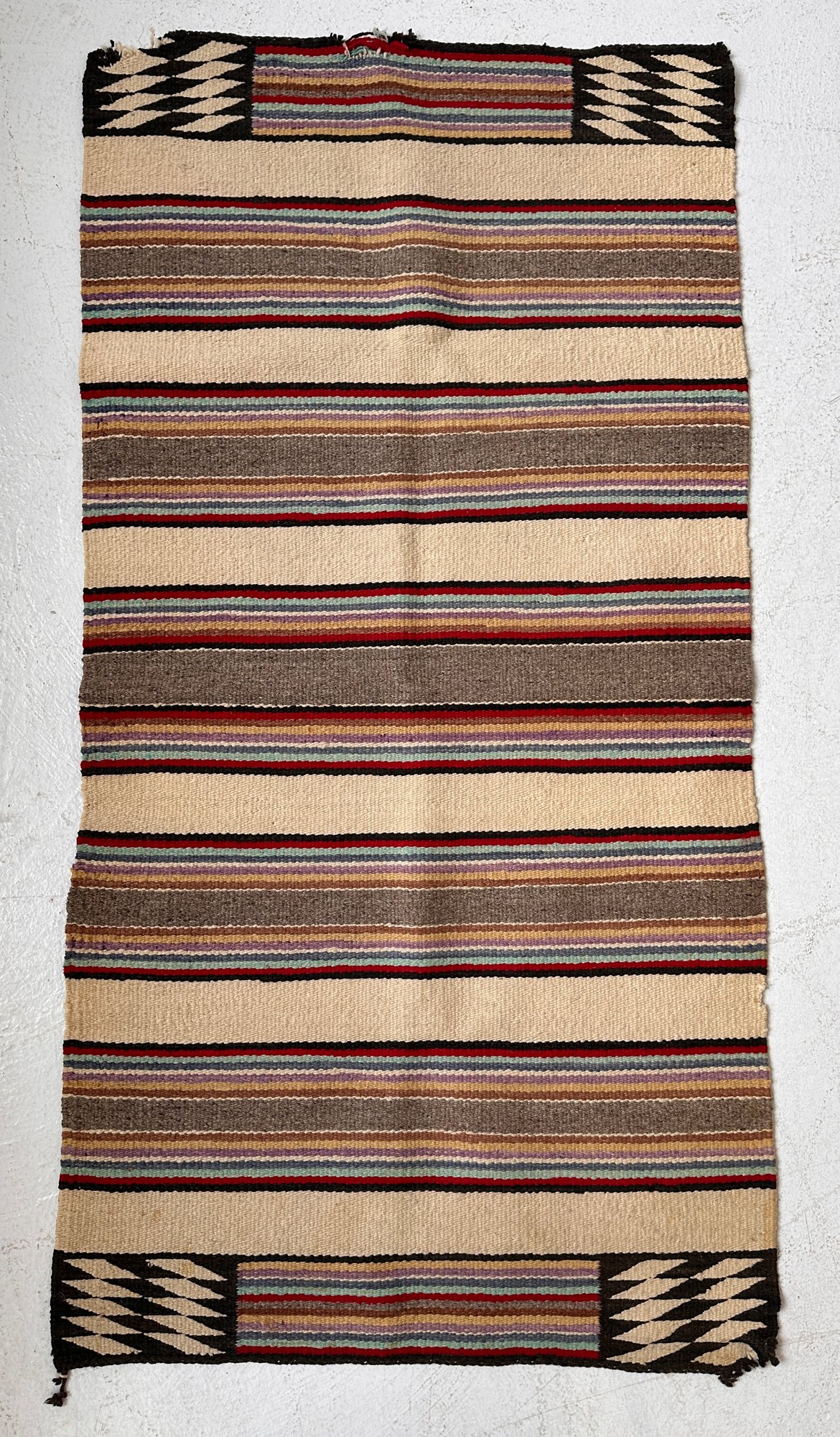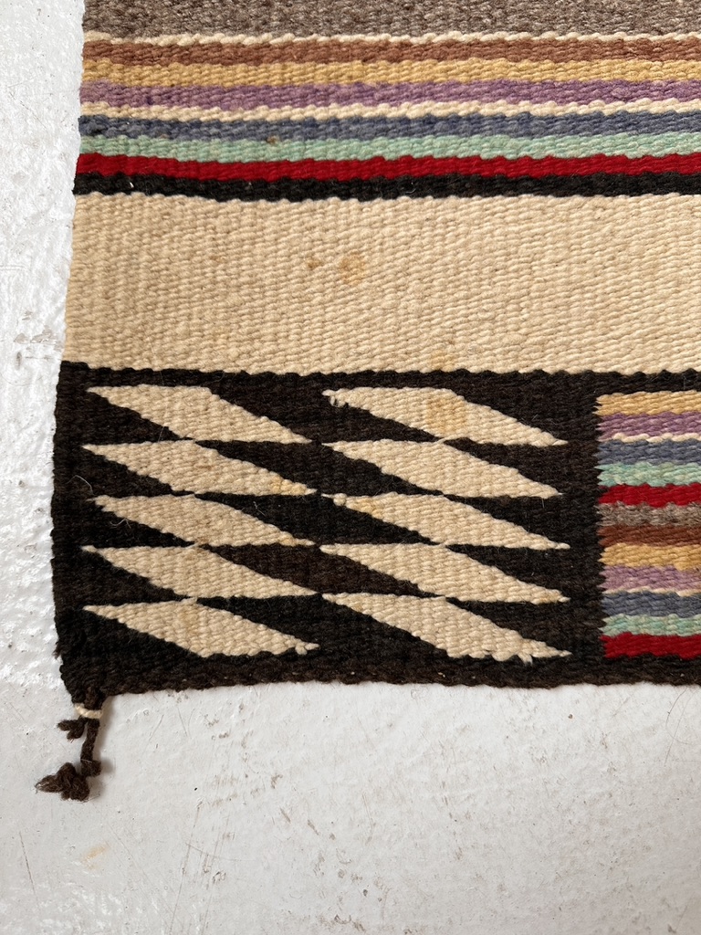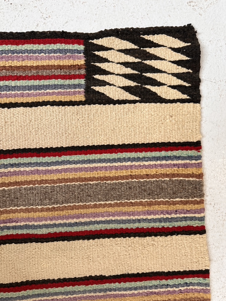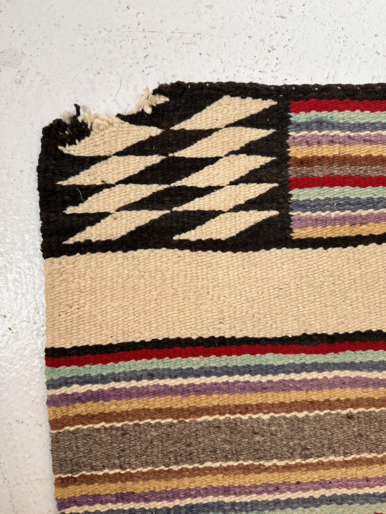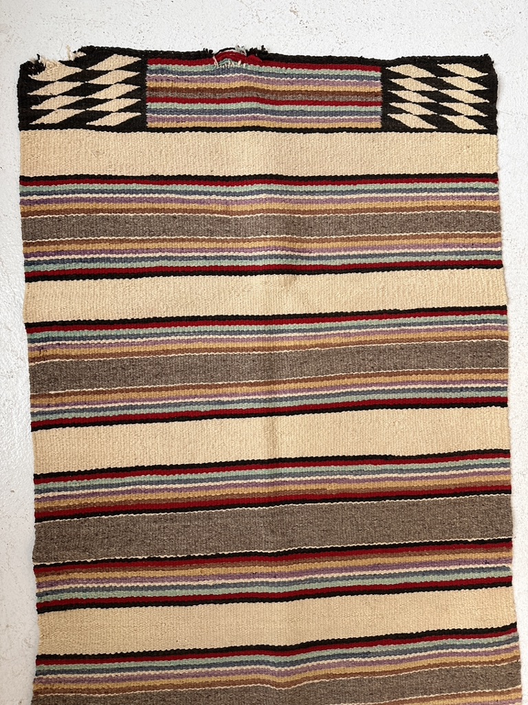 A vintage striped motif with multi color accents. Navajo style but likely Mexican copy.