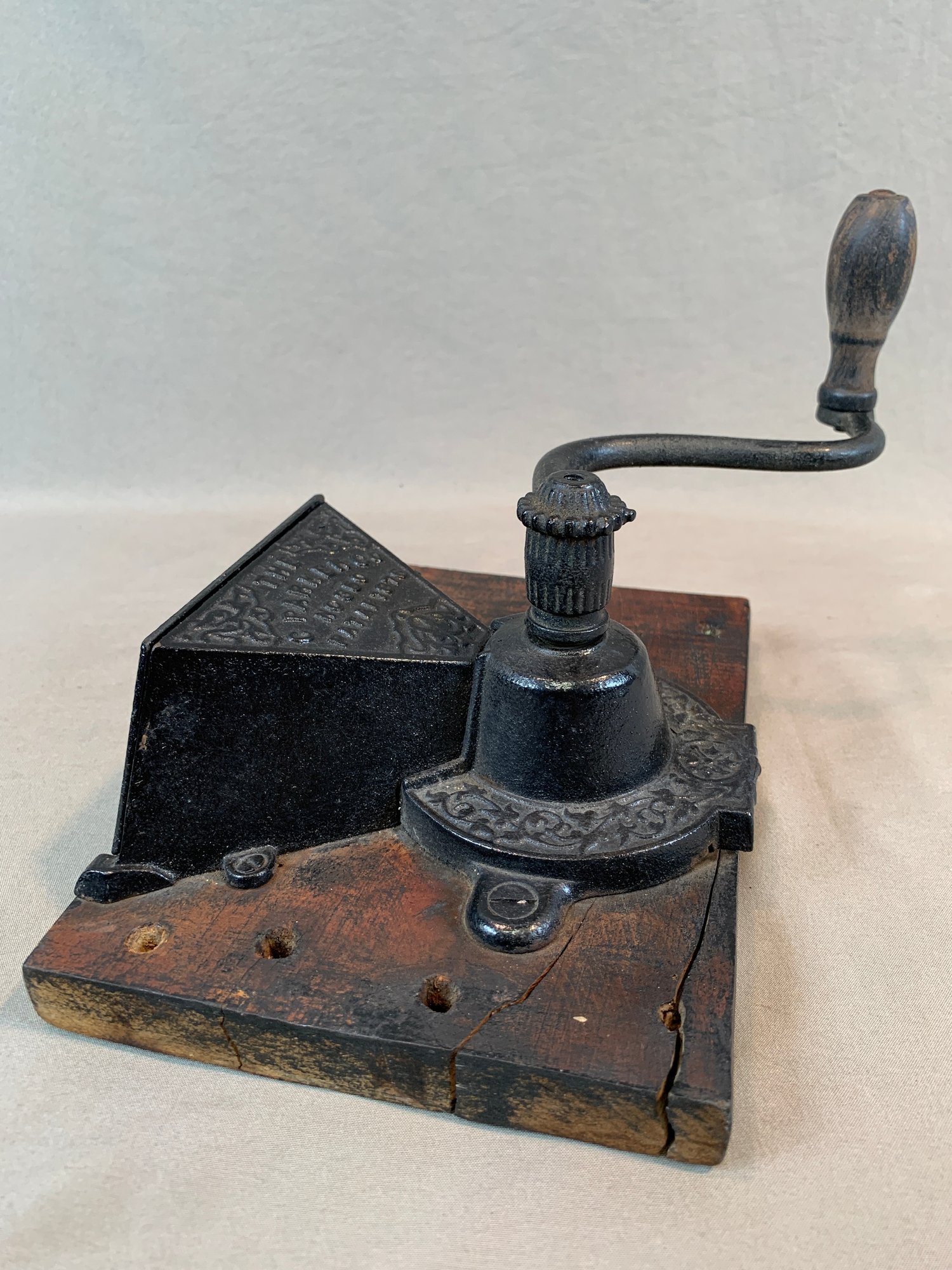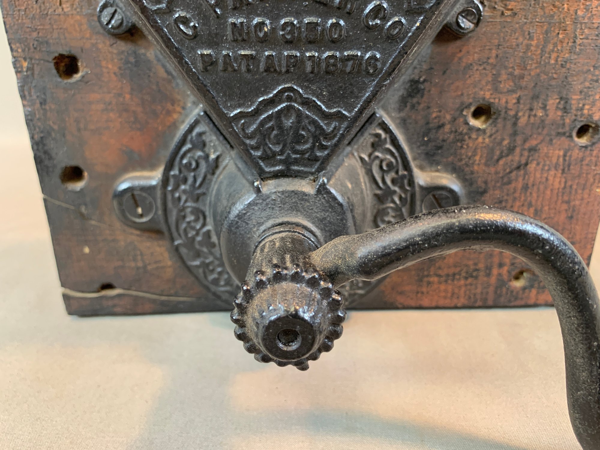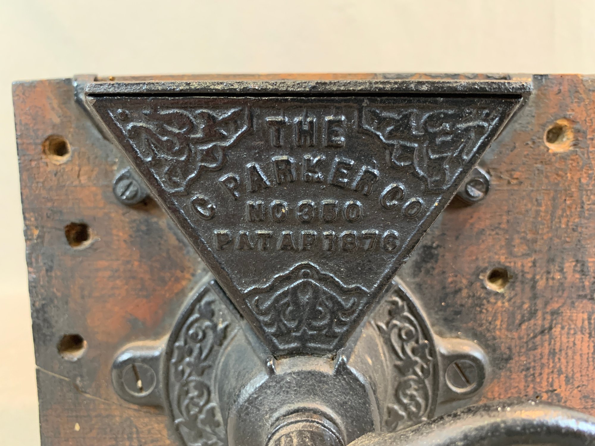 An antique cast iron wall-mount coffee grinder by The Parker Co., No. 350, patented 1876. Features ornate embossed cast iron mechanism with triangular hopper plate, curved iron crank arm with turned wooden handle, and original wooden mounting board.