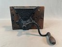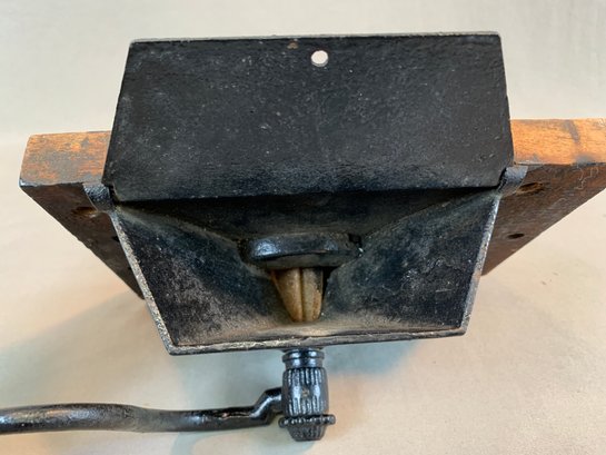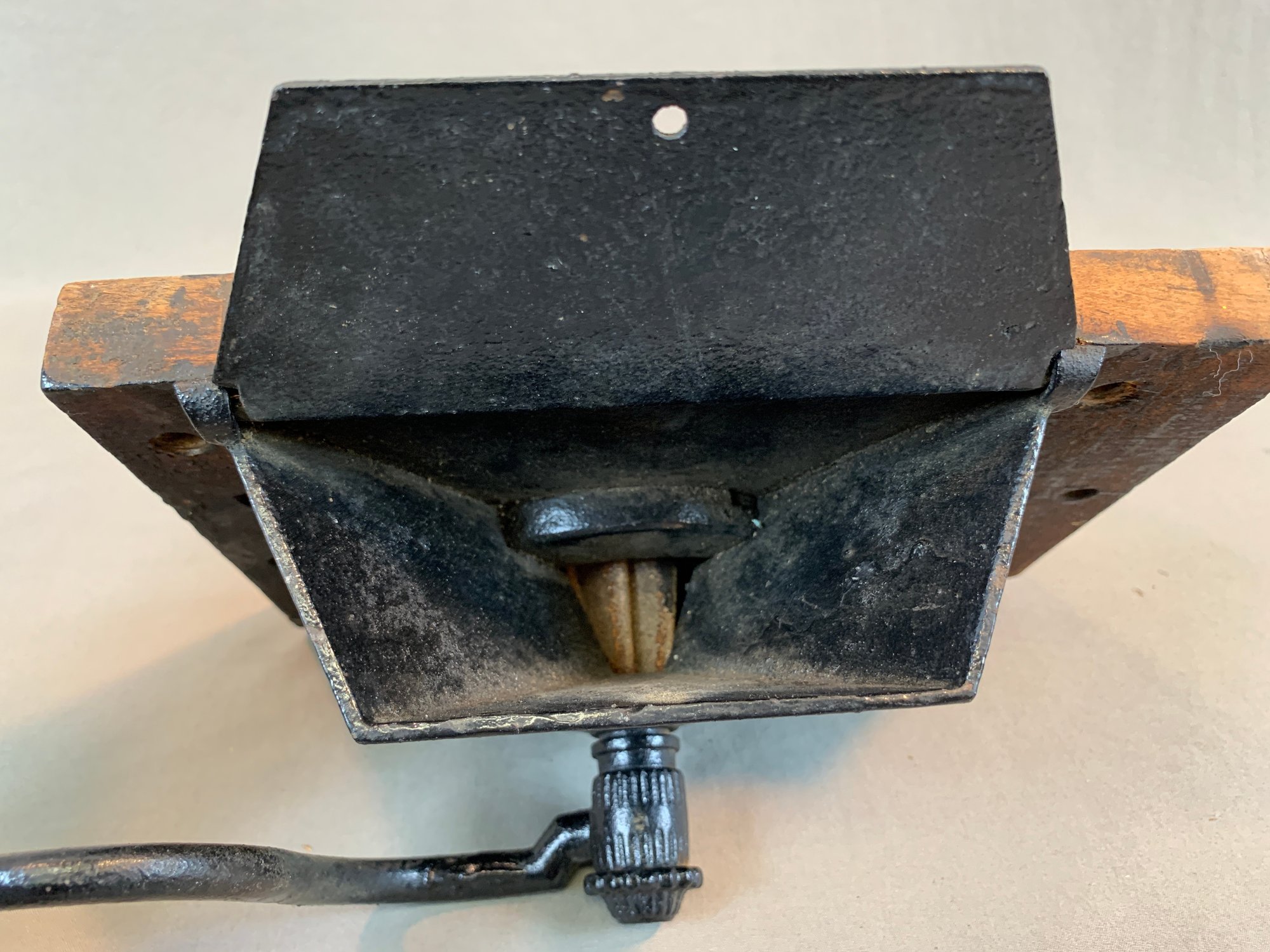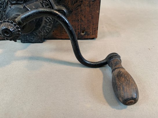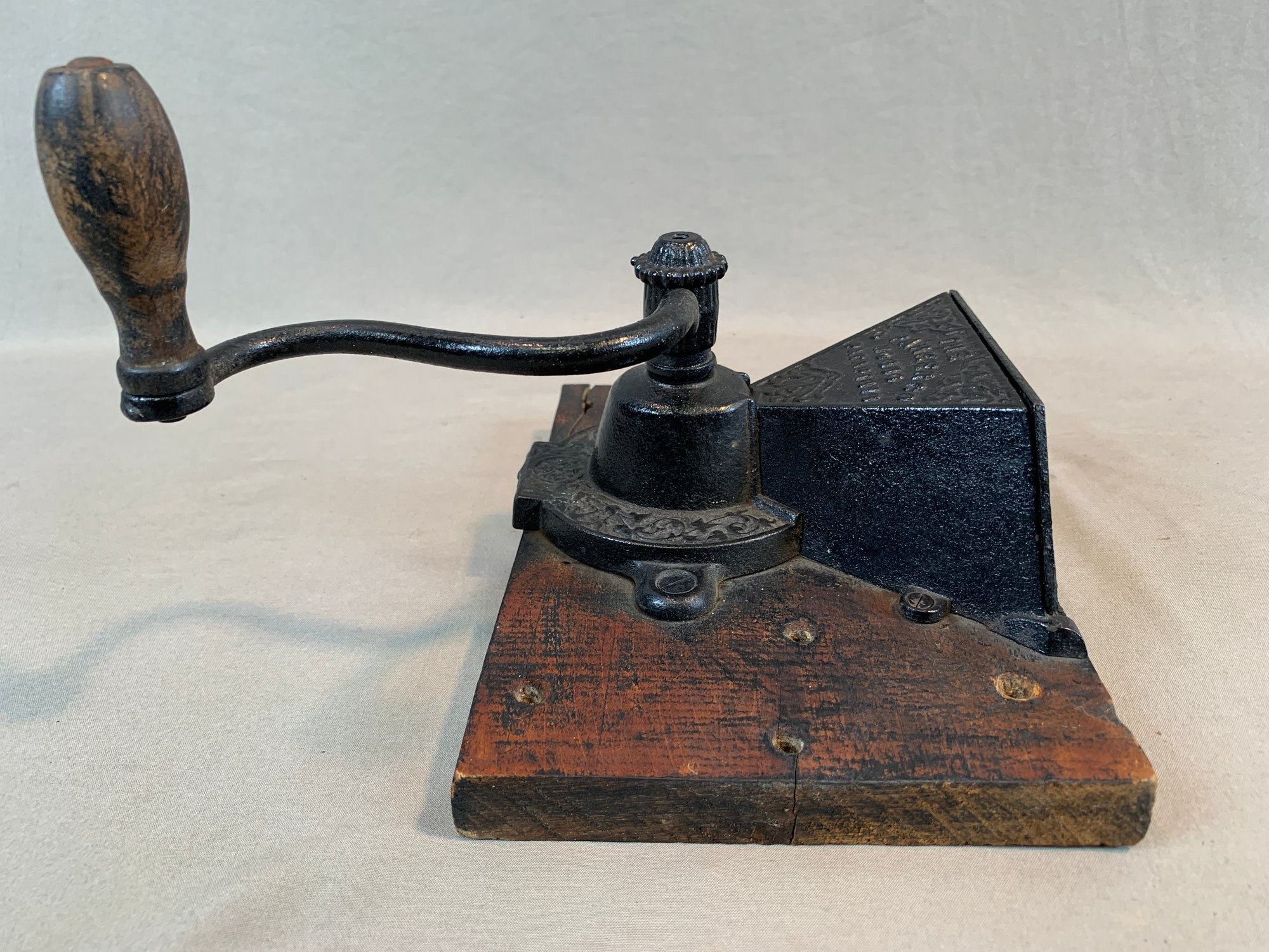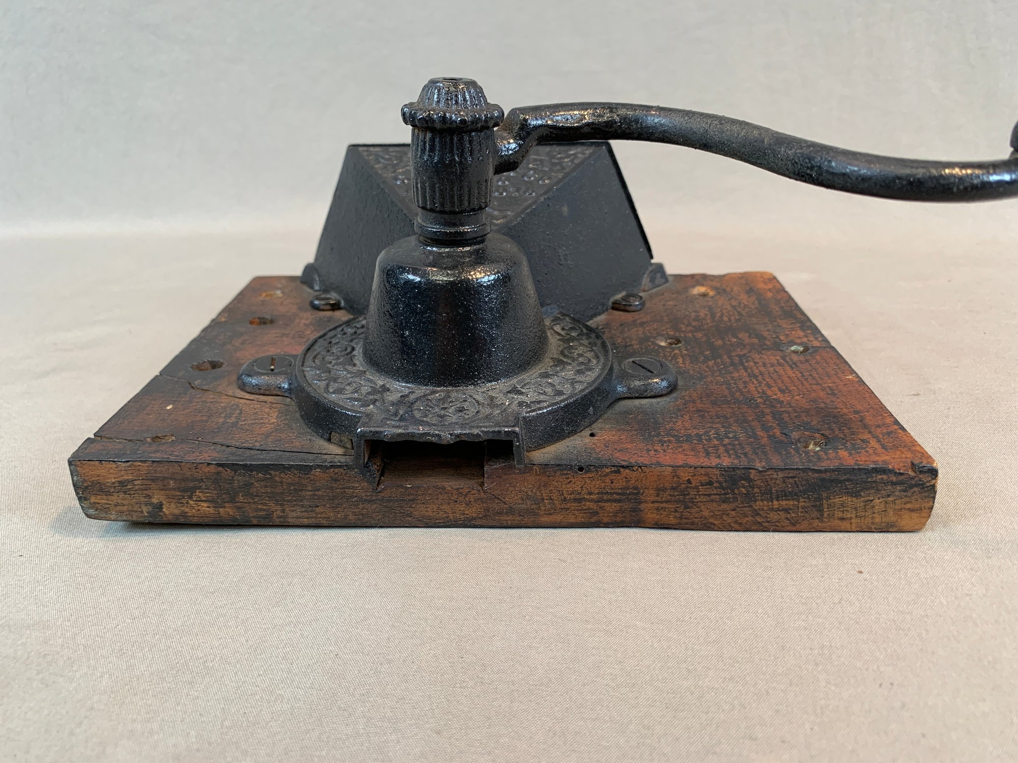 An antique cast iron wall-mount coffee grinder by The Parker Co., No. 350, patented 1876. Features ornate embossed cast iron mechanism with triangular hopper plate, curved iron crank arm with turned wooden handle, and original wooden mounting board.