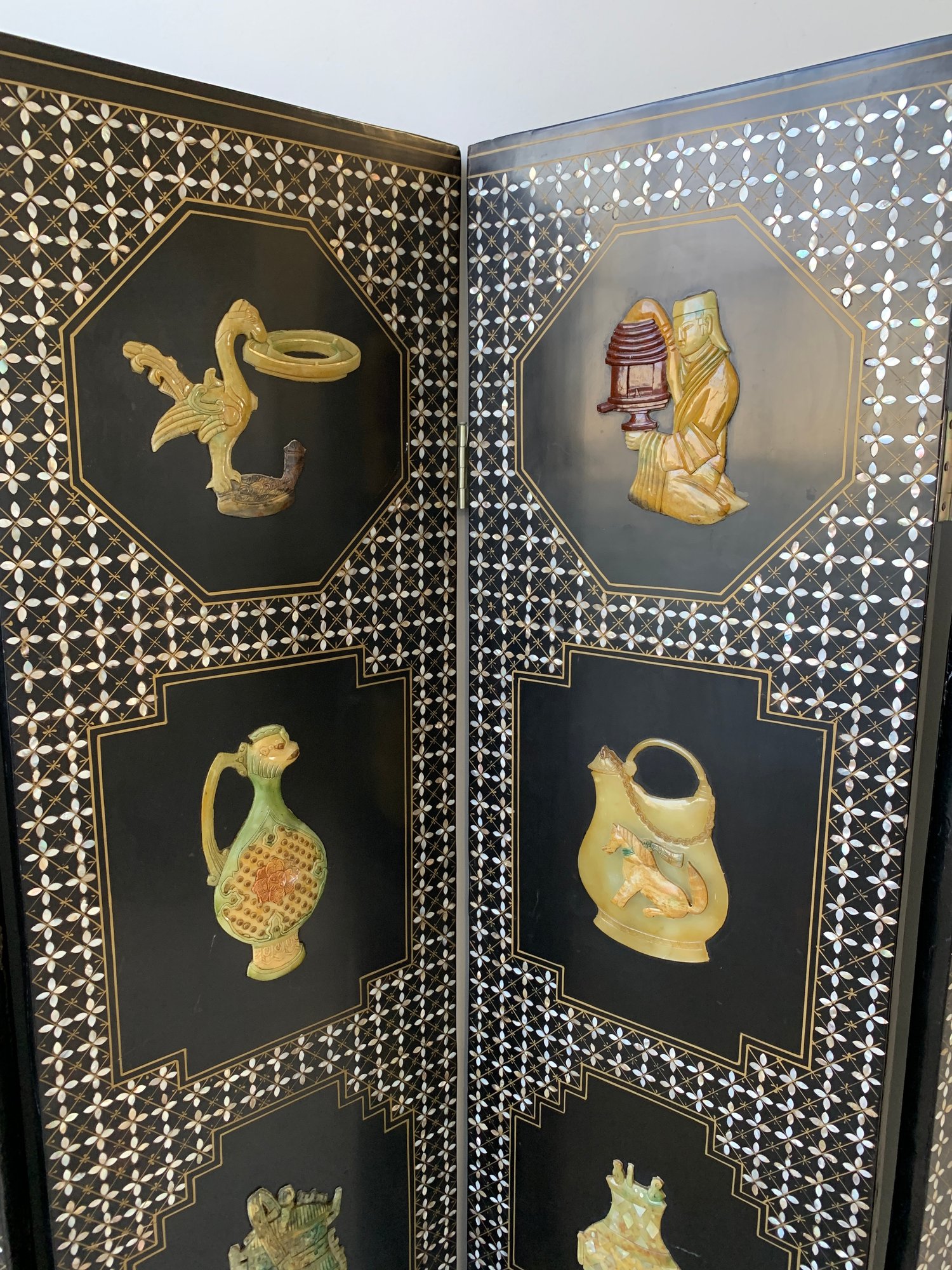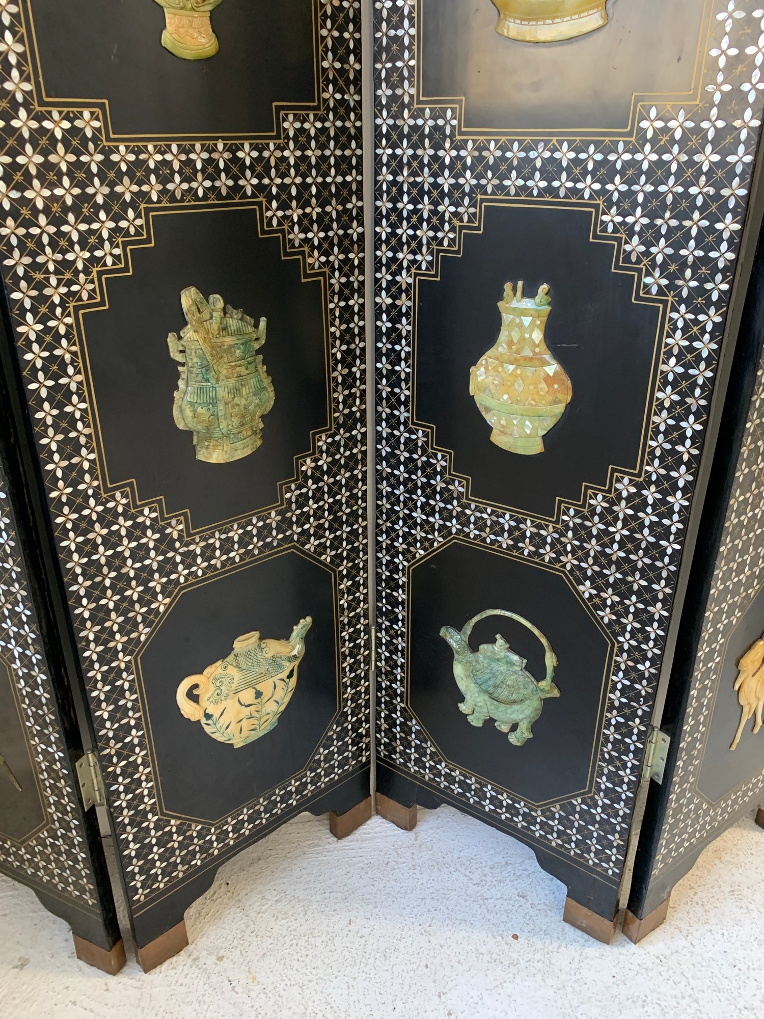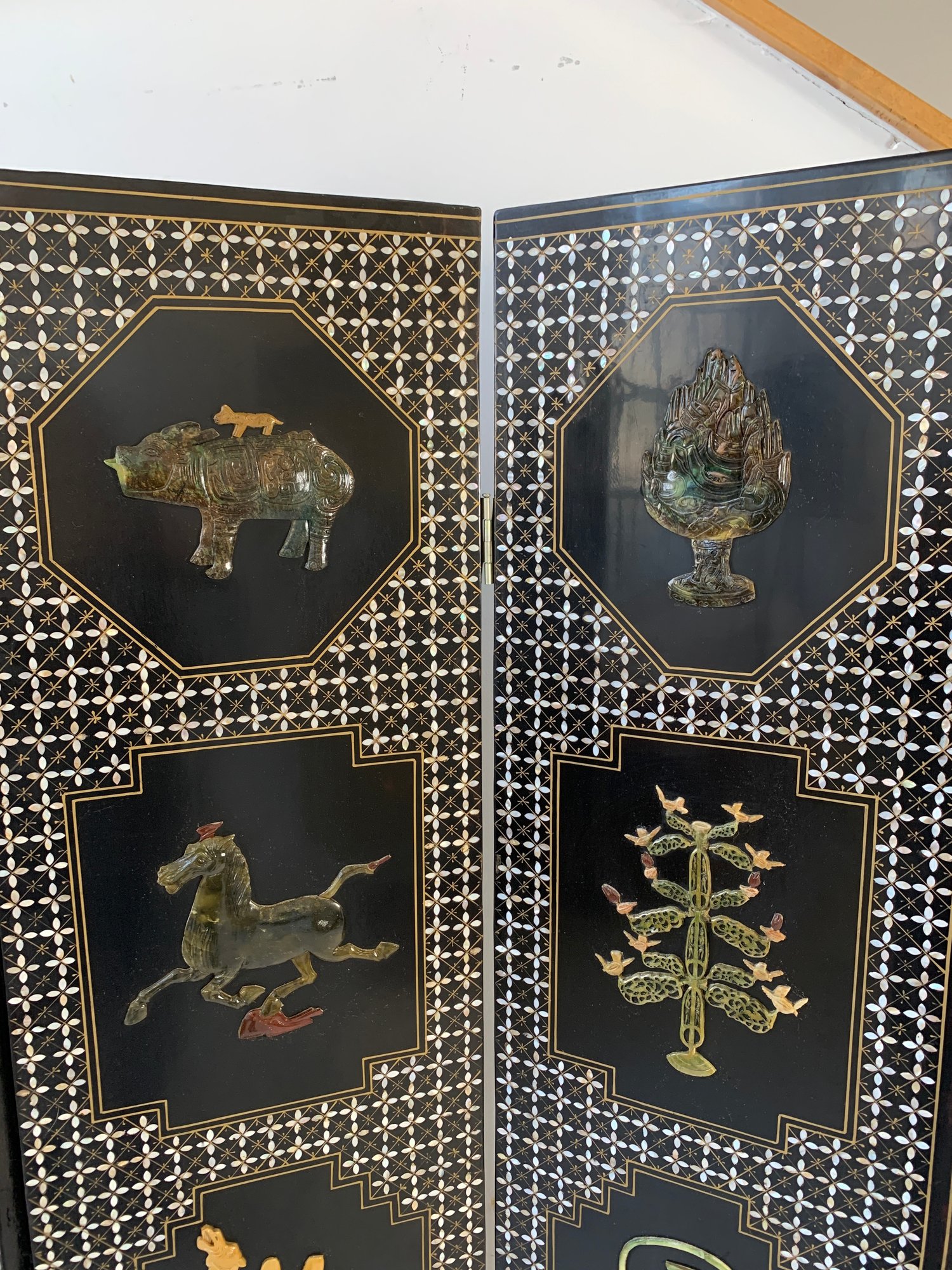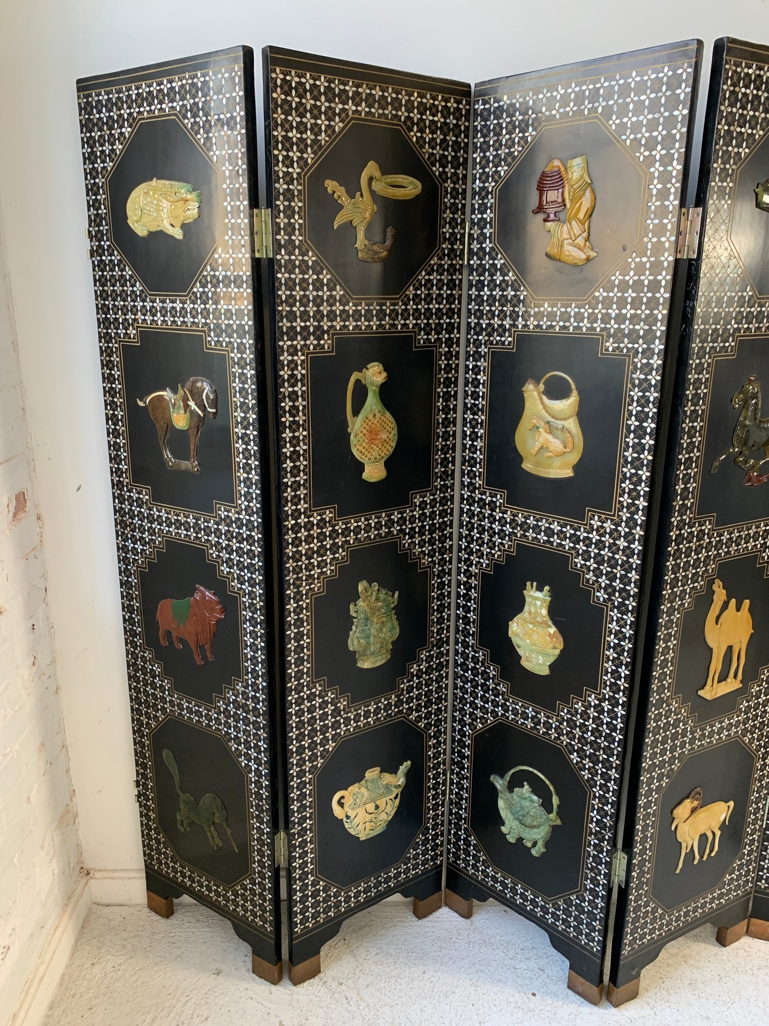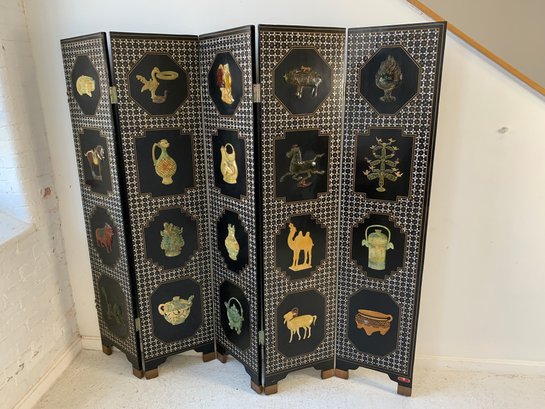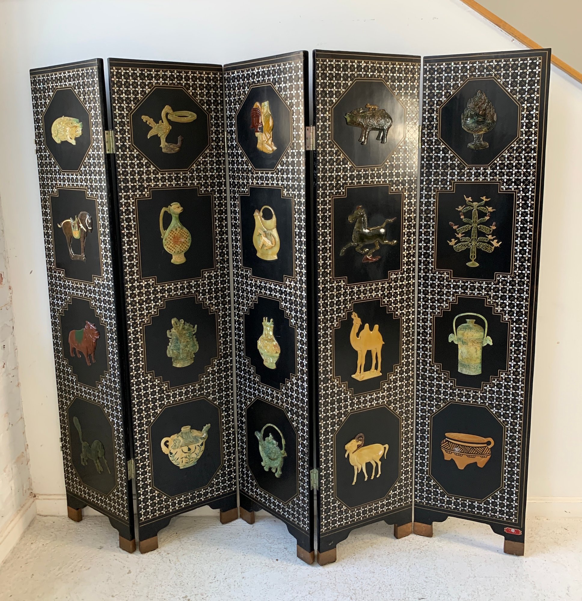 A five-panel folding screen with black lacquered grounds inlaid with mother of pearl in a repeating floral mosaic pattern, each panel applied with hand-carved hardstone figures depicting ancient Chinese artifacts, animals and figures. The reverse decorated in gold on black lacquer with mythological roundels. Brass capped feet. Tianshui, China maker's label on reverse.
