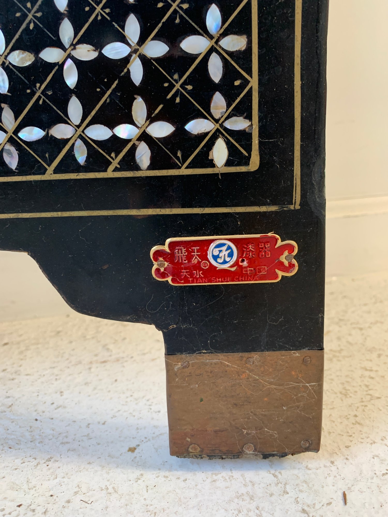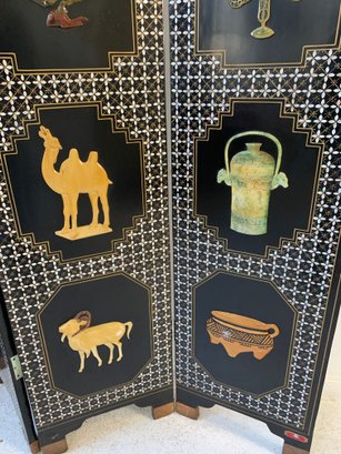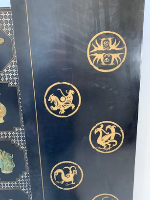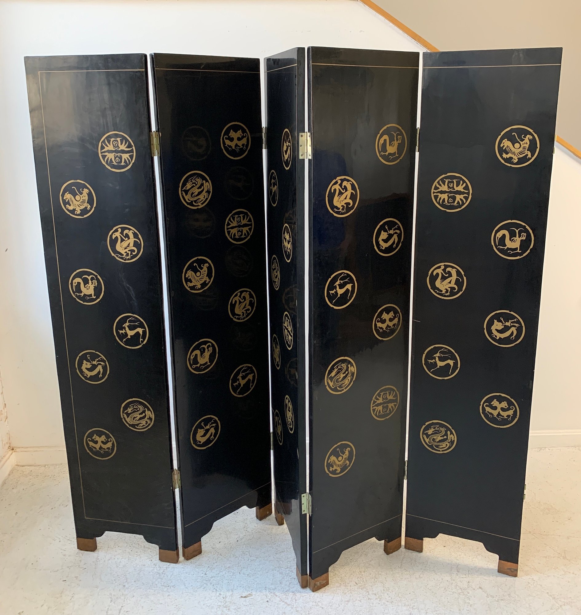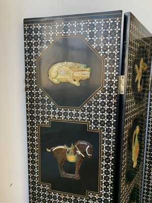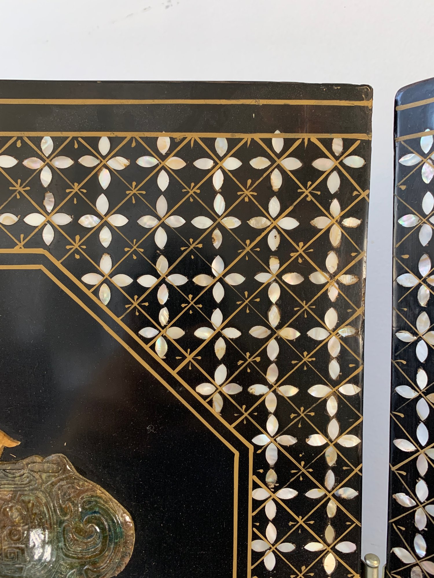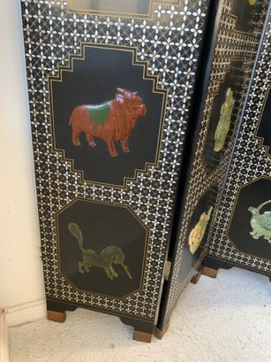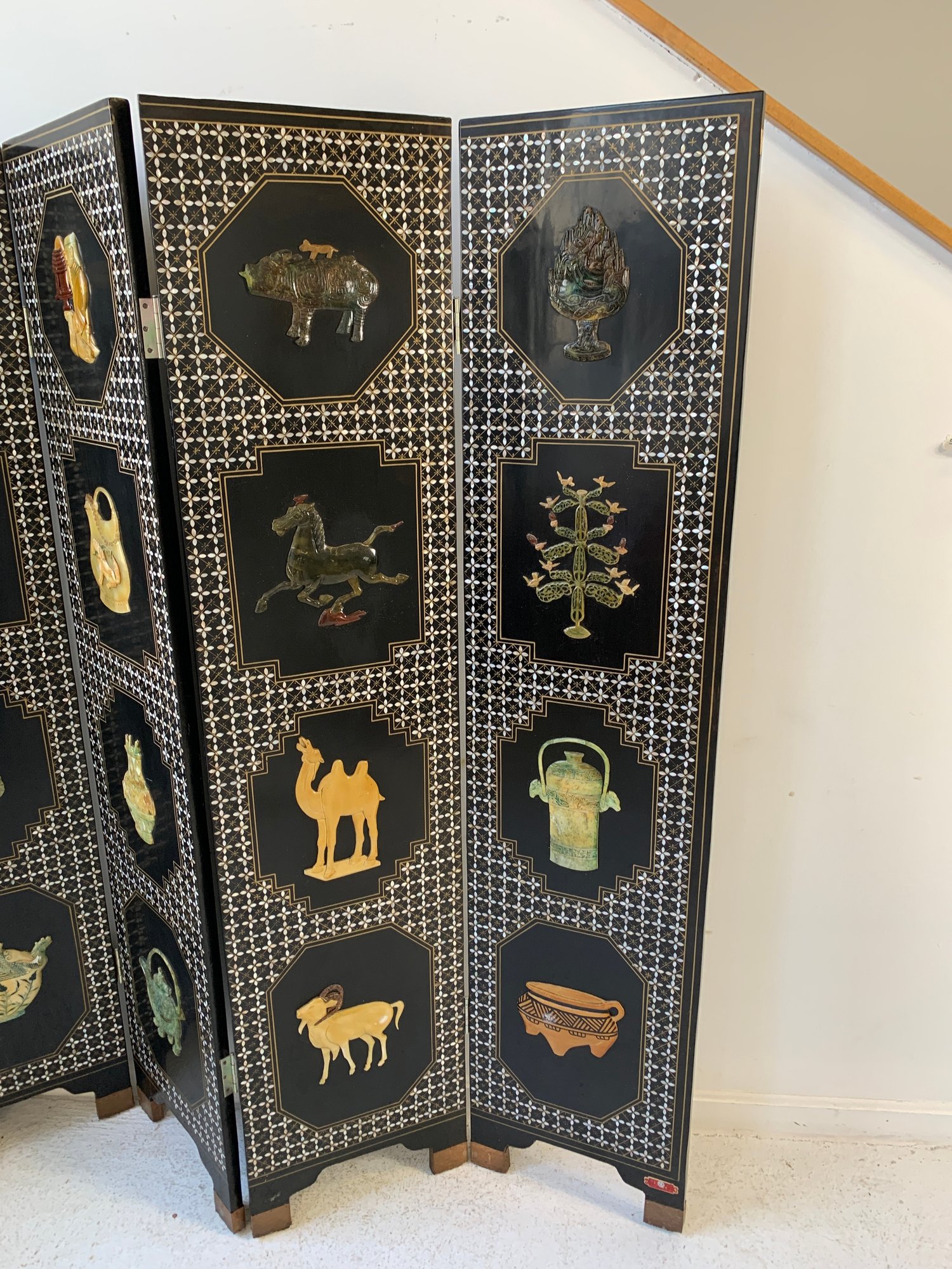 A five-panel folding screen with black lacquered grounds inlaid with mother of pearl in a repeating floral mosaic pattern, each panel applied with hand-carved hardstone figures depicting ancient Chinese artifacts, animals and figures. The reverse decorated in gold on black lacquer with mythological roundels. Brass capped feet. Tianshui, China maker's label on reverse.