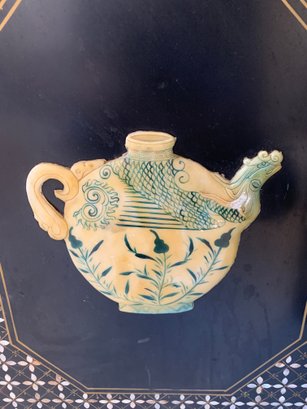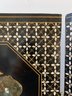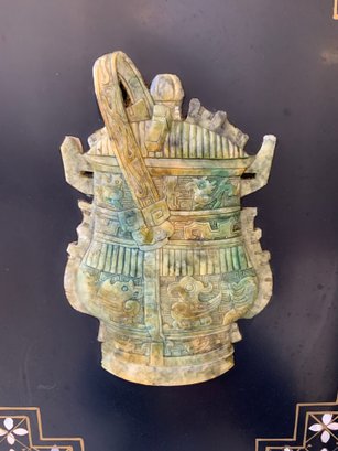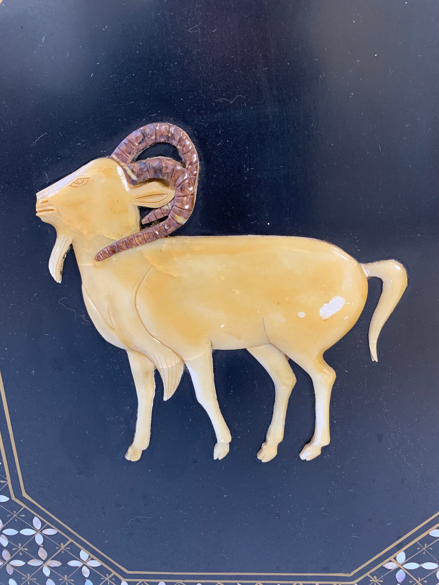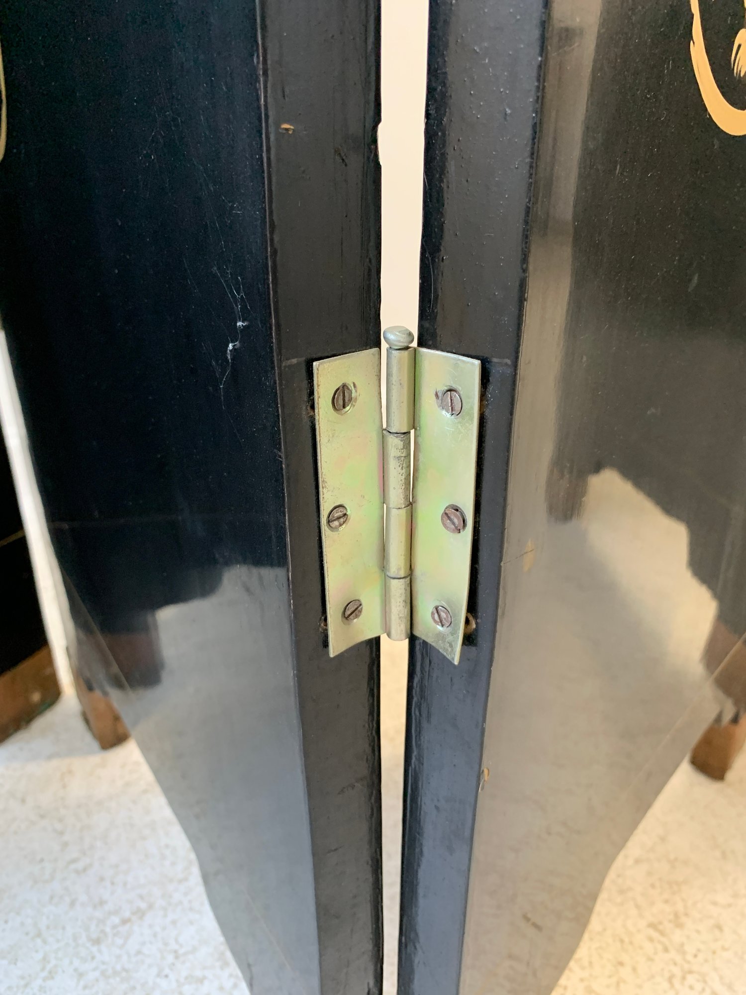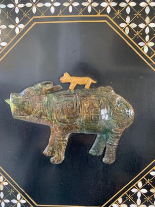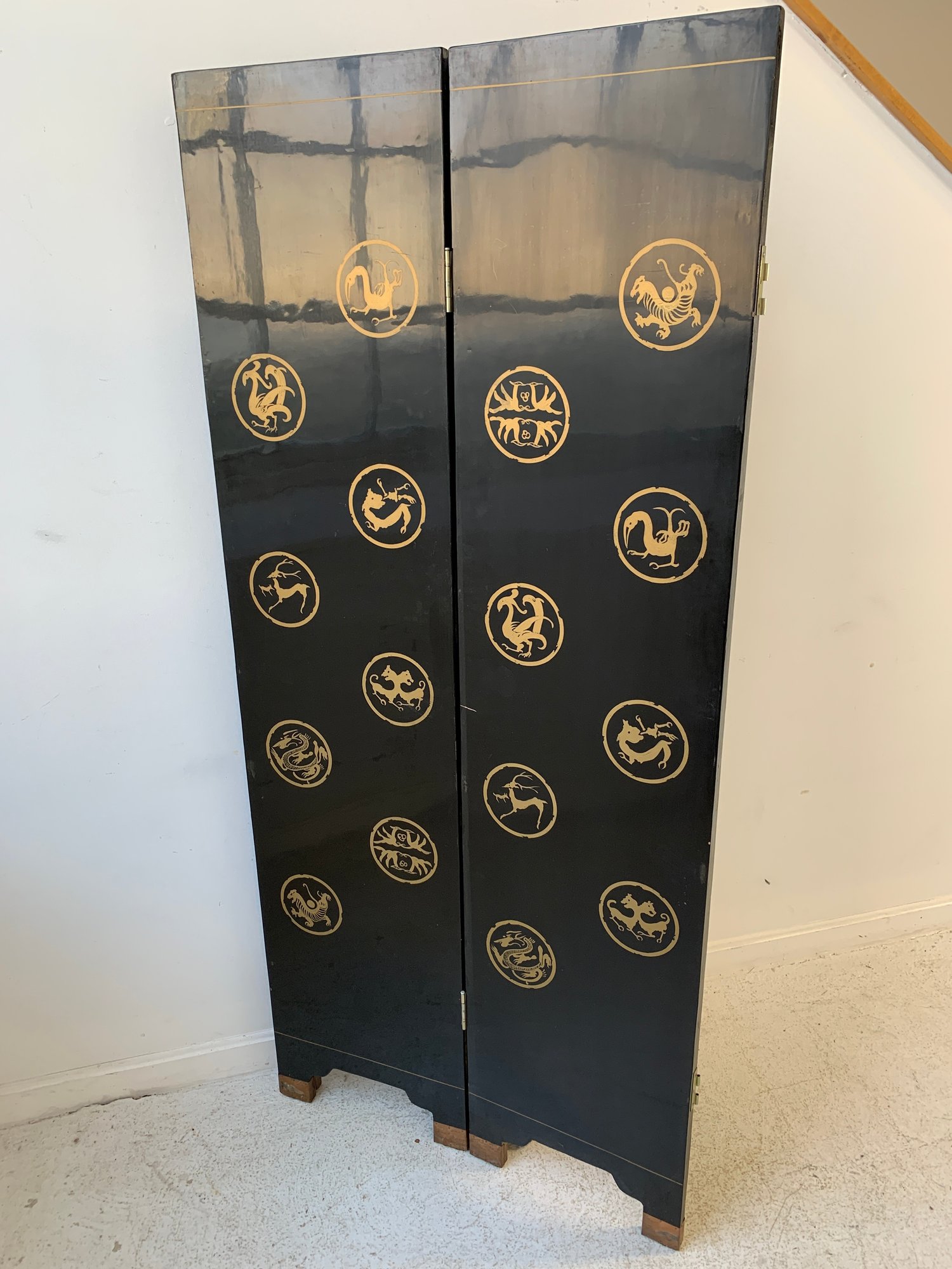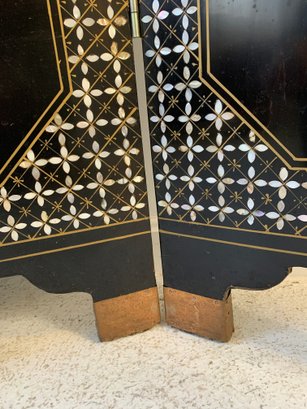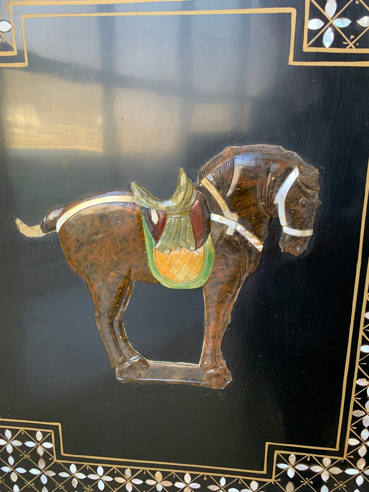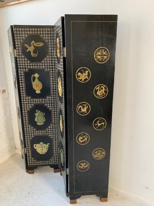 A five-panel folding screen with black lacquered grounds inlaid with mother of pearl in a repeating floral mosaic pattern, each panel applied with hand-carved hardstone figures depicting ancient Chinese artifacts, animals and figures. The reverse decorated in gold on black lacquer with mythological roundels. Brass capped feet. Tianshui, China maker's label on reverse.