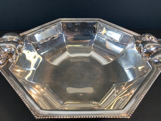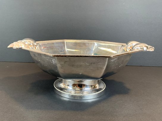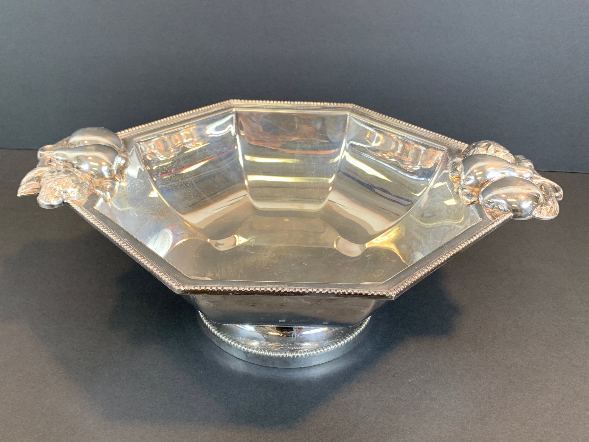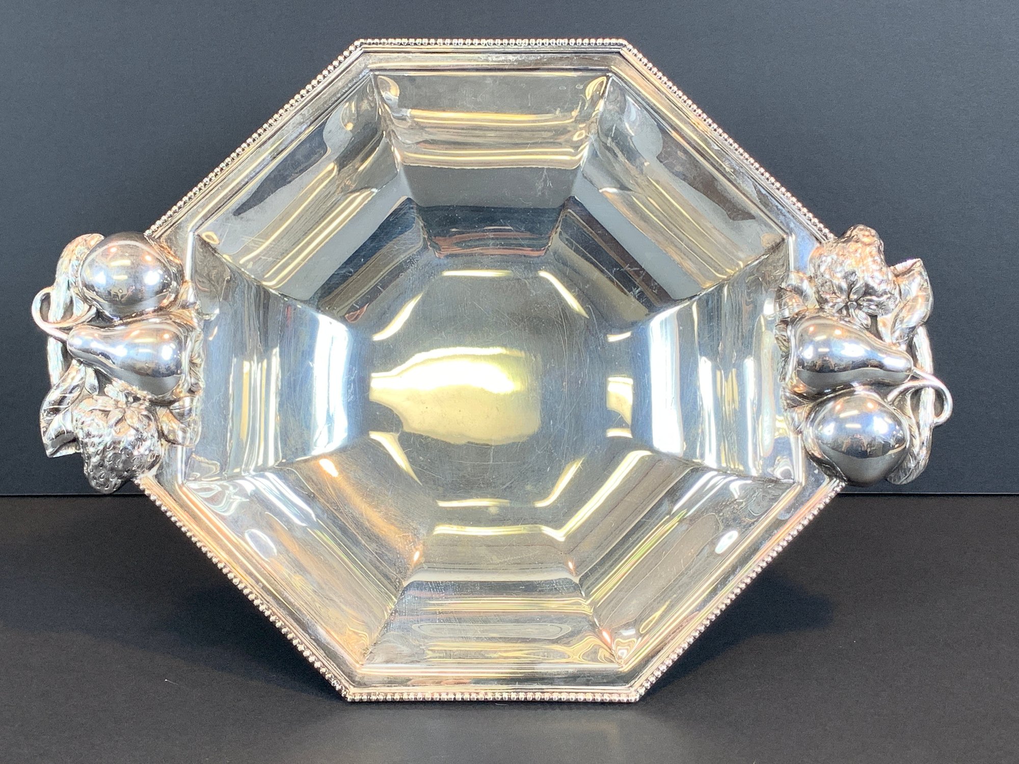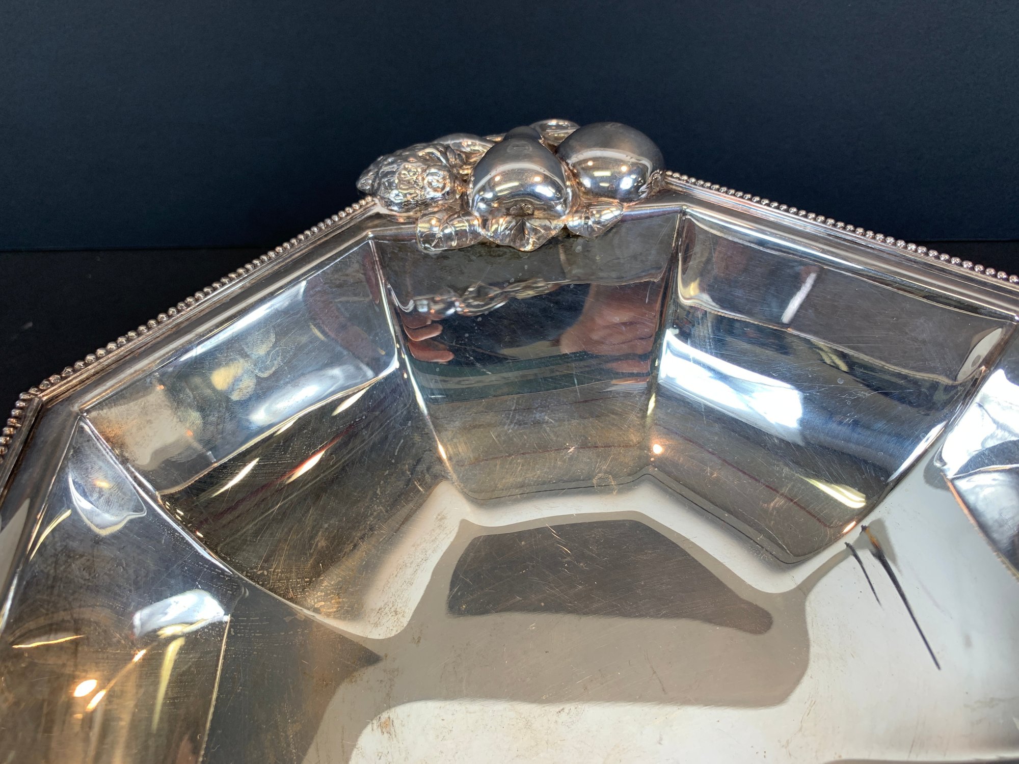 Topazio "Cazenovia Abroad" two-handled silver plate pedestal bowl, made in Portugal. Octagonal form with beaded rim and ornate fruit cluster handles, finished in a bright polished silver plate. A elegant and decorative centerpiece piece. Marked on the underside.