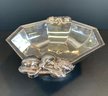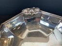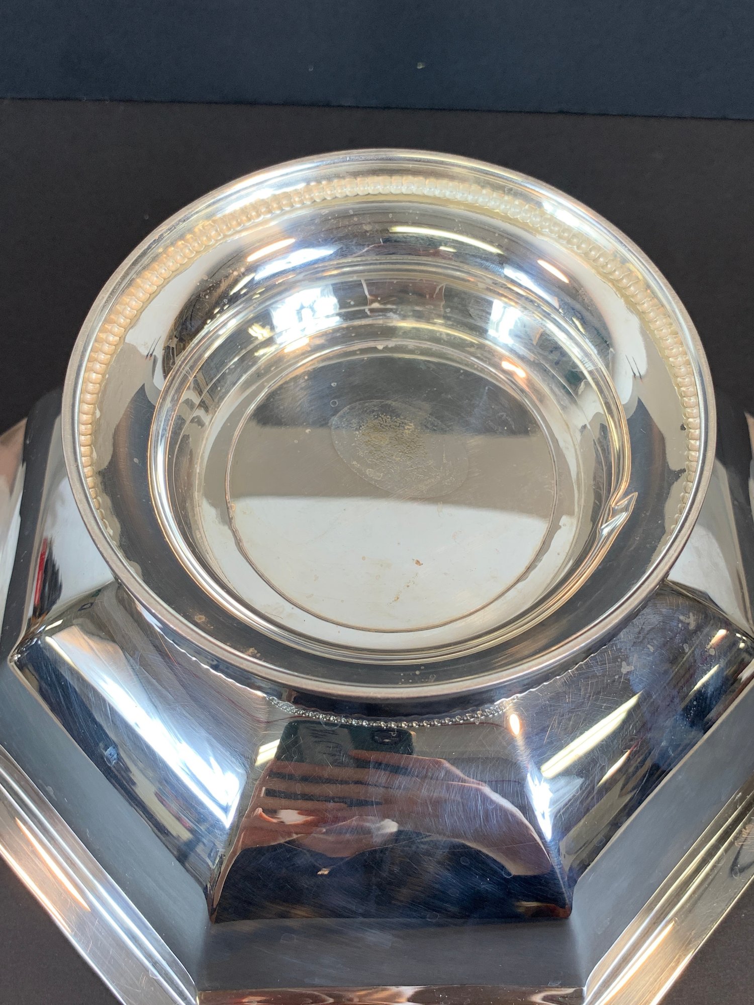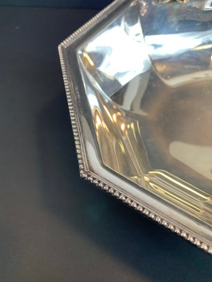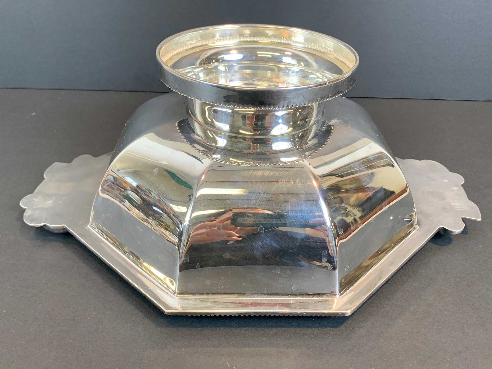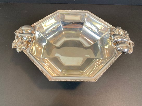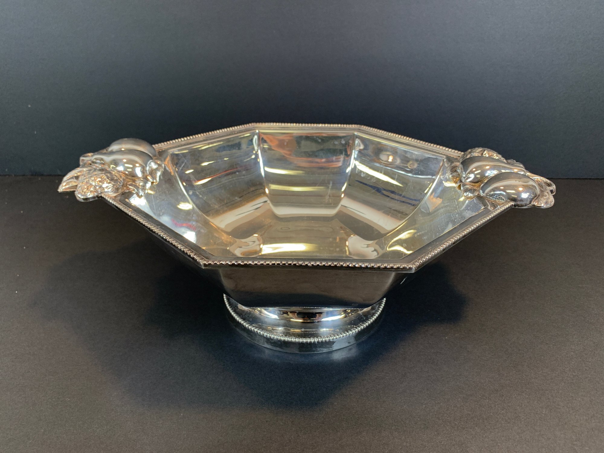 Topazio "Cazenovia Abroad" two-handled silver plate pedestal bowl, made in Portugal. Octagonal form with beaded rim and ornate fruit cluster handles, finished in a bright polished silver plate. A elegant and decorative centerpiece piece. Marked on the underside.