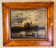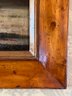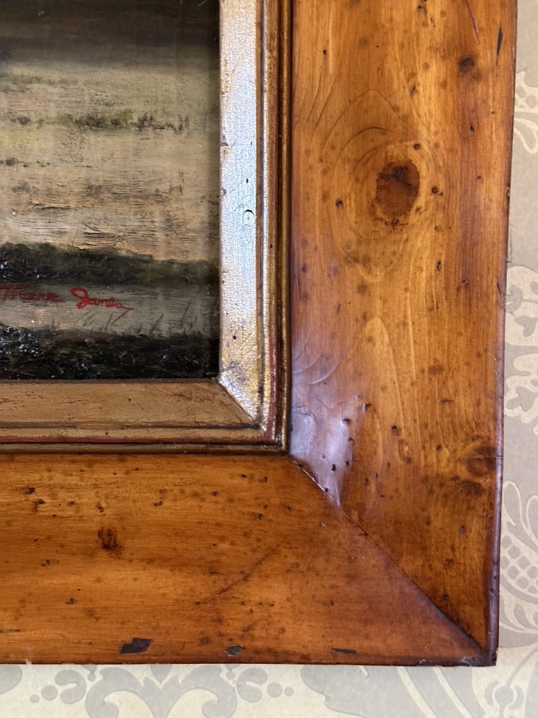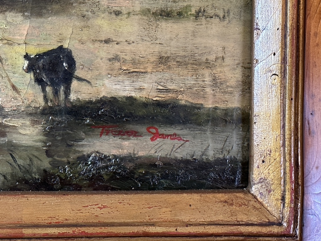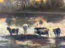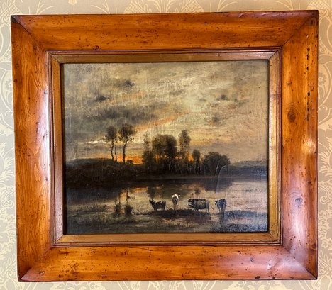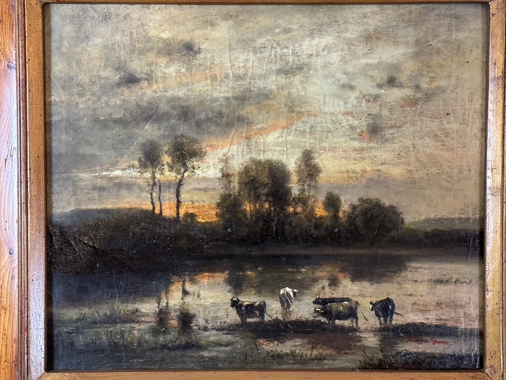 Depicting a luminous dusk landscape scene with cows bathing in the river. Signed lower right. In architectural pine frame.