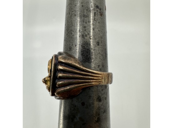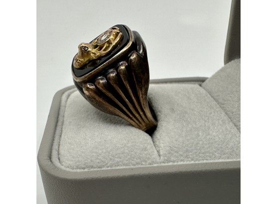 Featuring a sterling silver ring with onyx gemstone topped by 10k gold BPOE elk decoration. Size 10.75