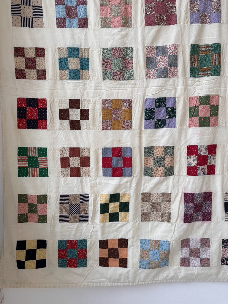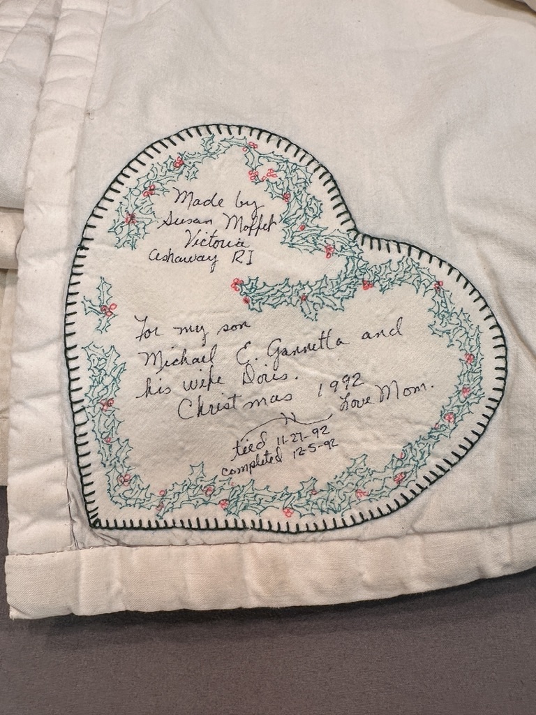 This beautiful vintage 9 Patch quilt is a unique, signed piece featuring a heart-shaped patch on the back, marking it as a thoughtful, gifted presentation. Signed by Susan Moffet in Victoria and dated circa 1992, this quilt carries both history and charm.