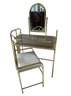 A Hollywood Regency/Art Deco style gold tone metal and glass top vanity with 2 glass shelves, adjustable mirror, and chair.