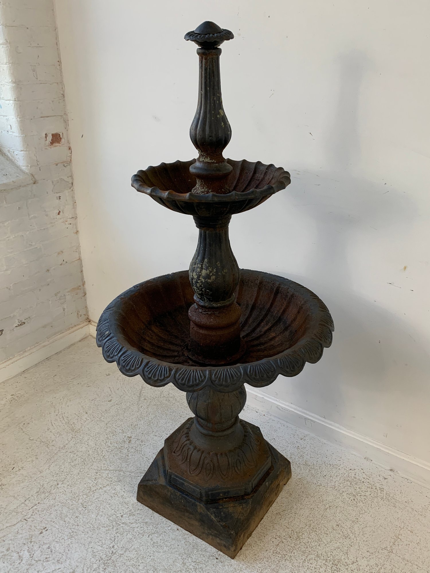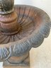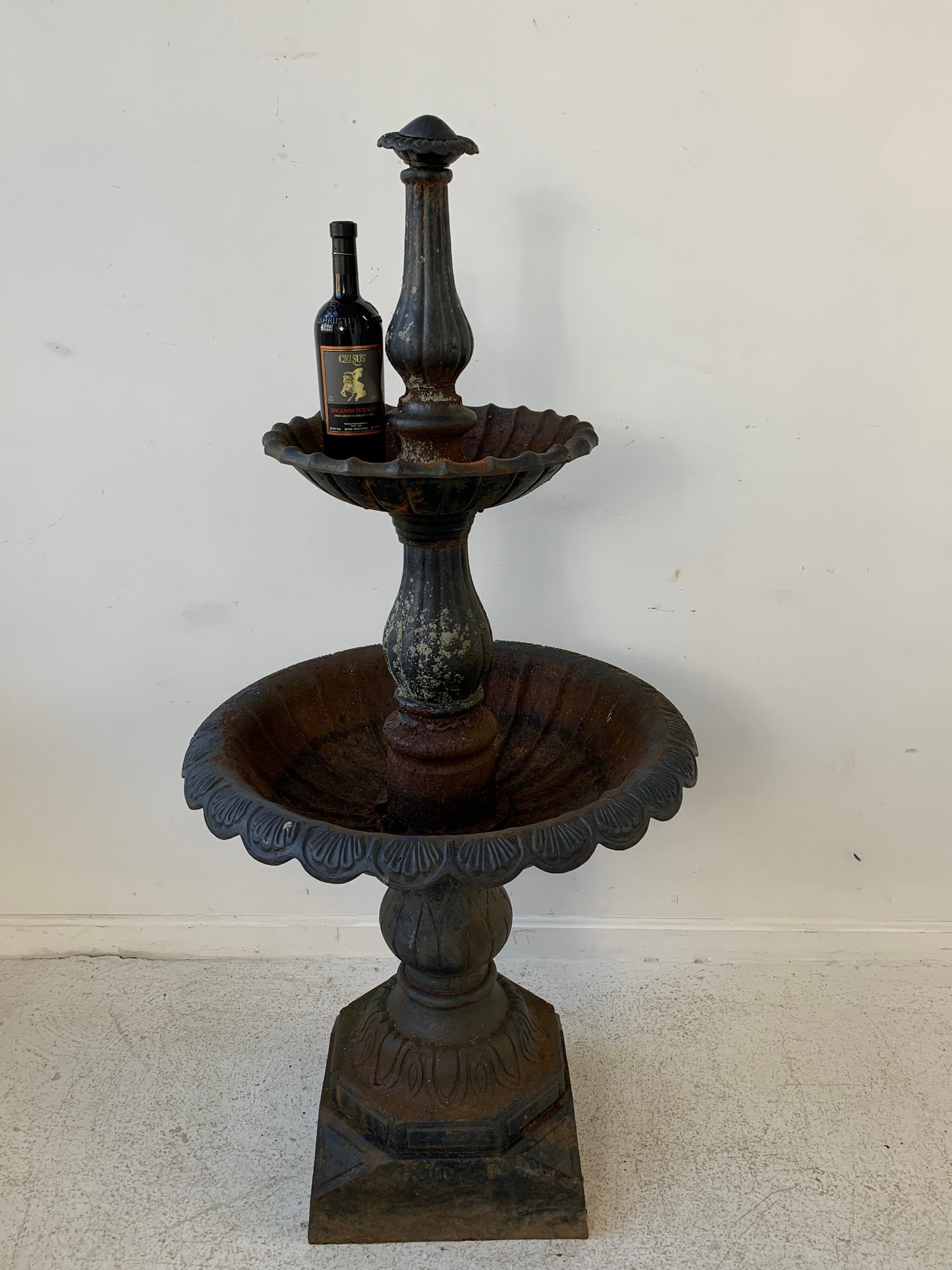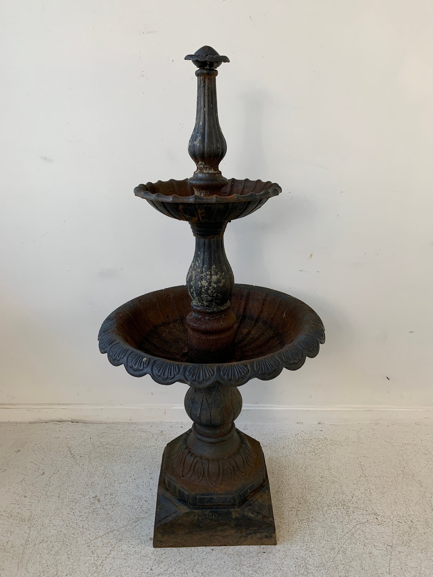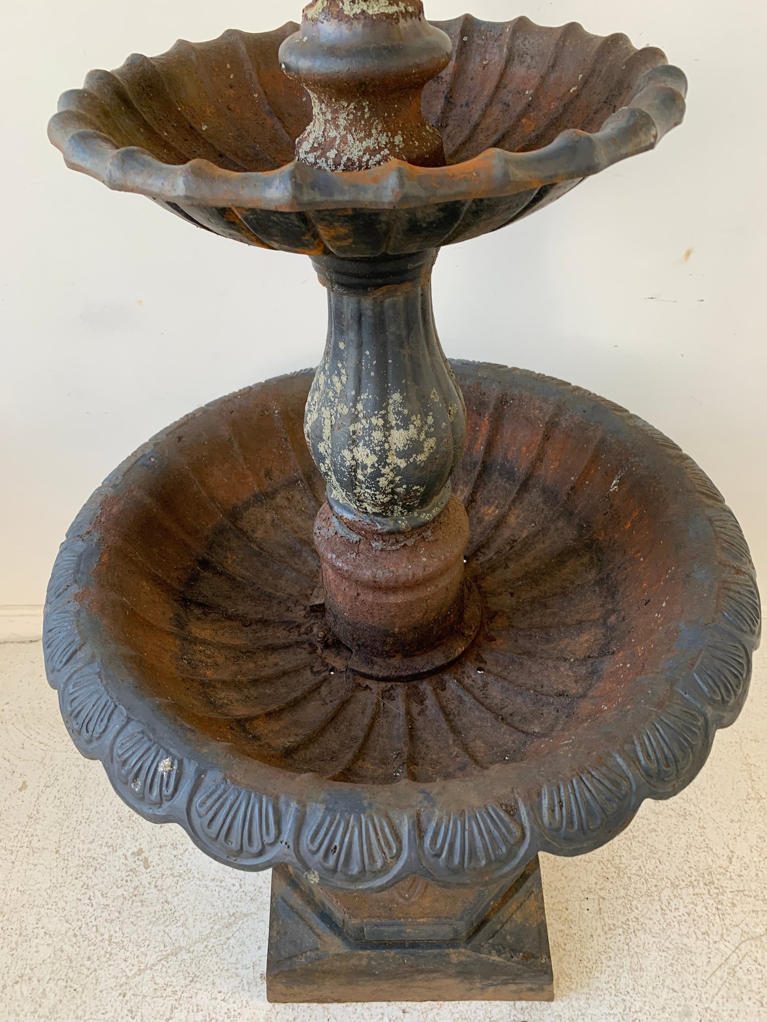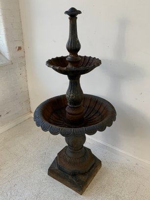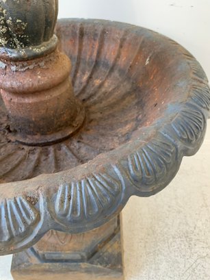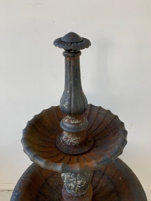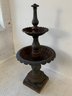 A two-tier cast iron garden fountain with scalloped basins, turned baluster columns, and a stepped octagonal base. Disassembles into three sections for transport.