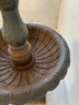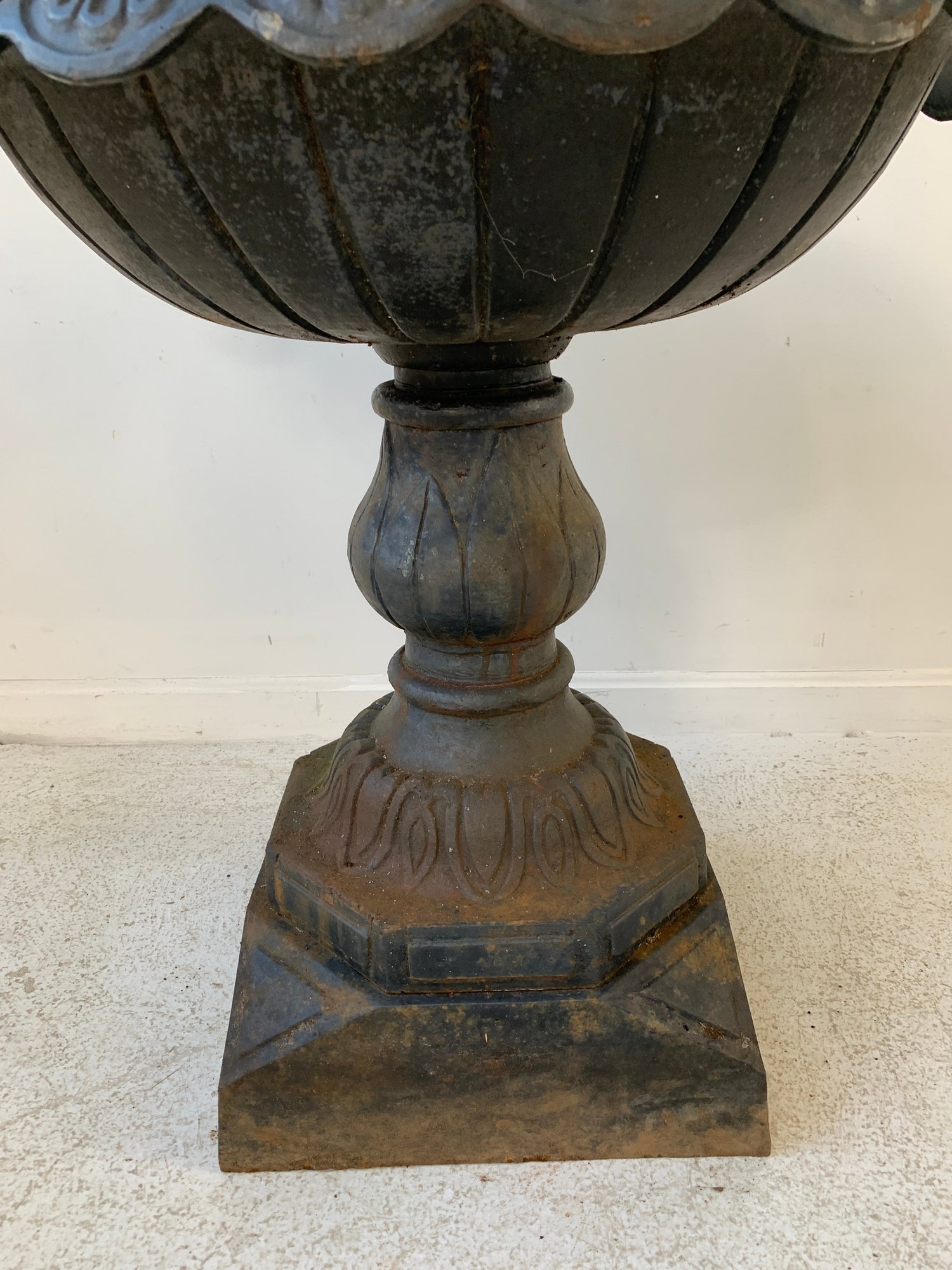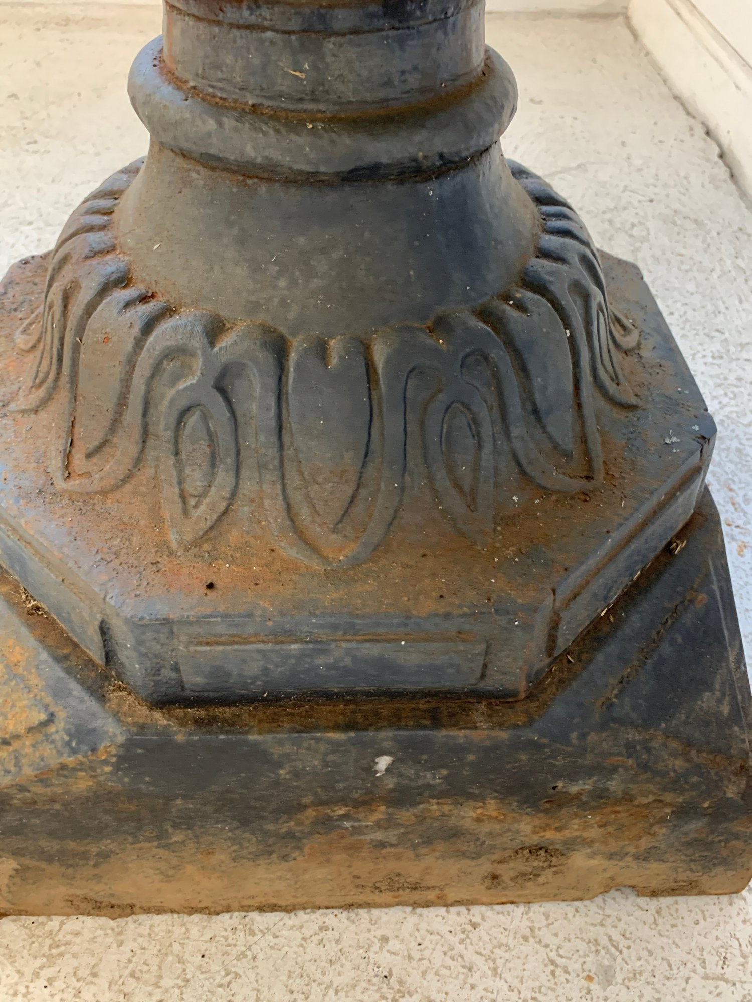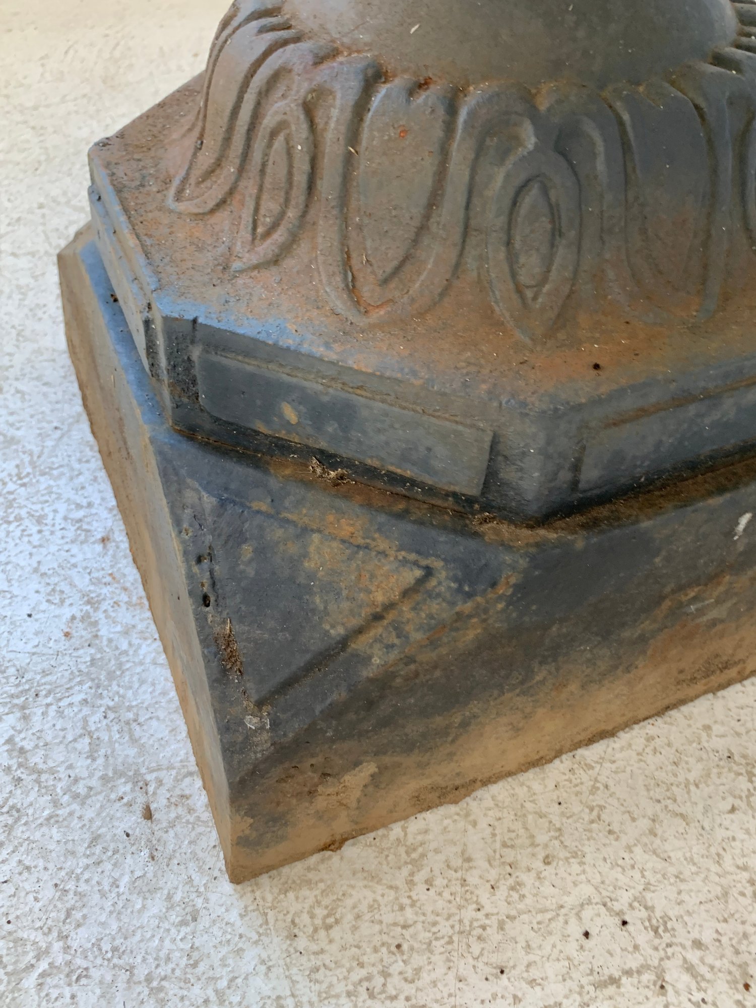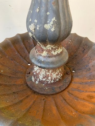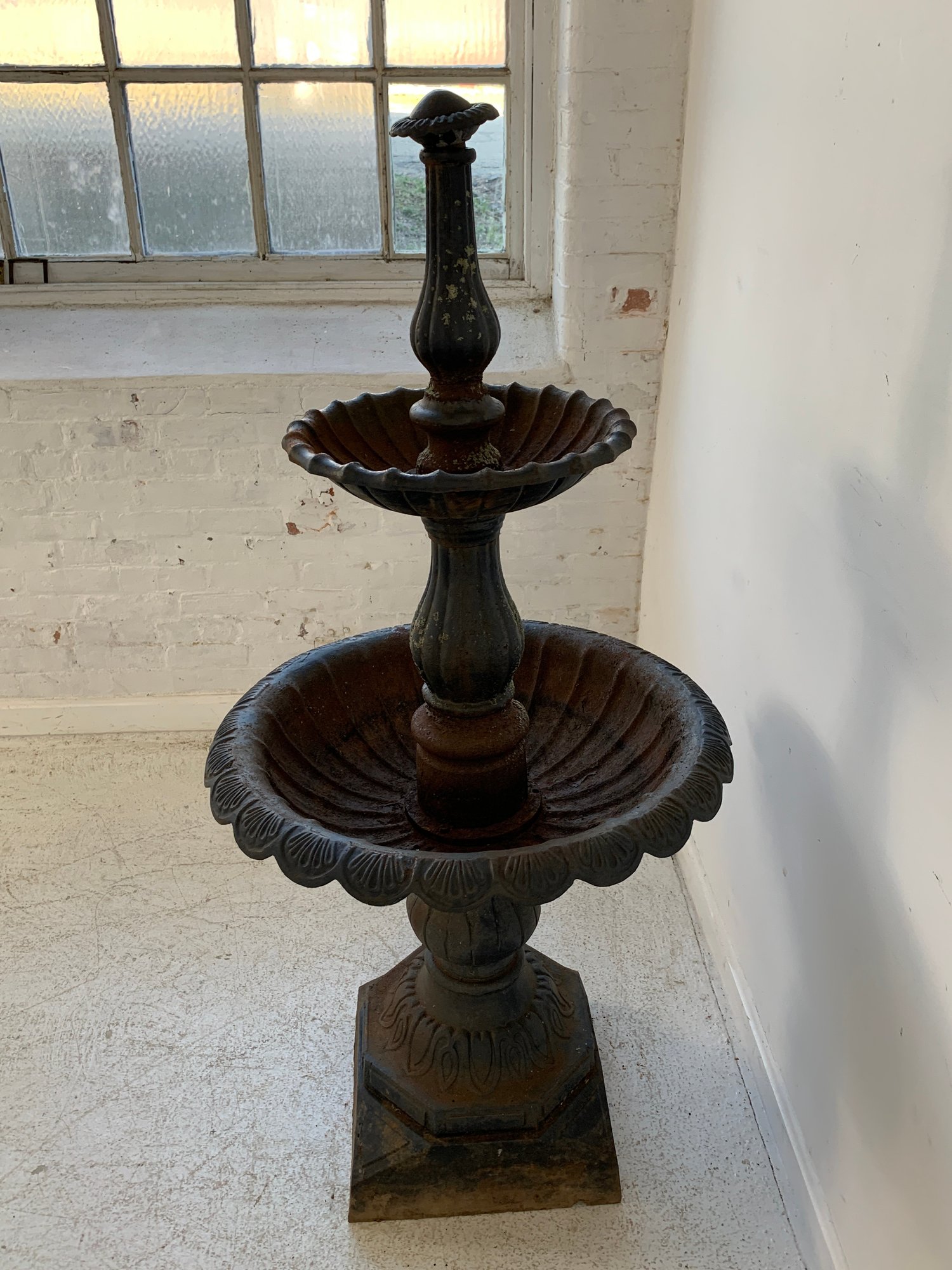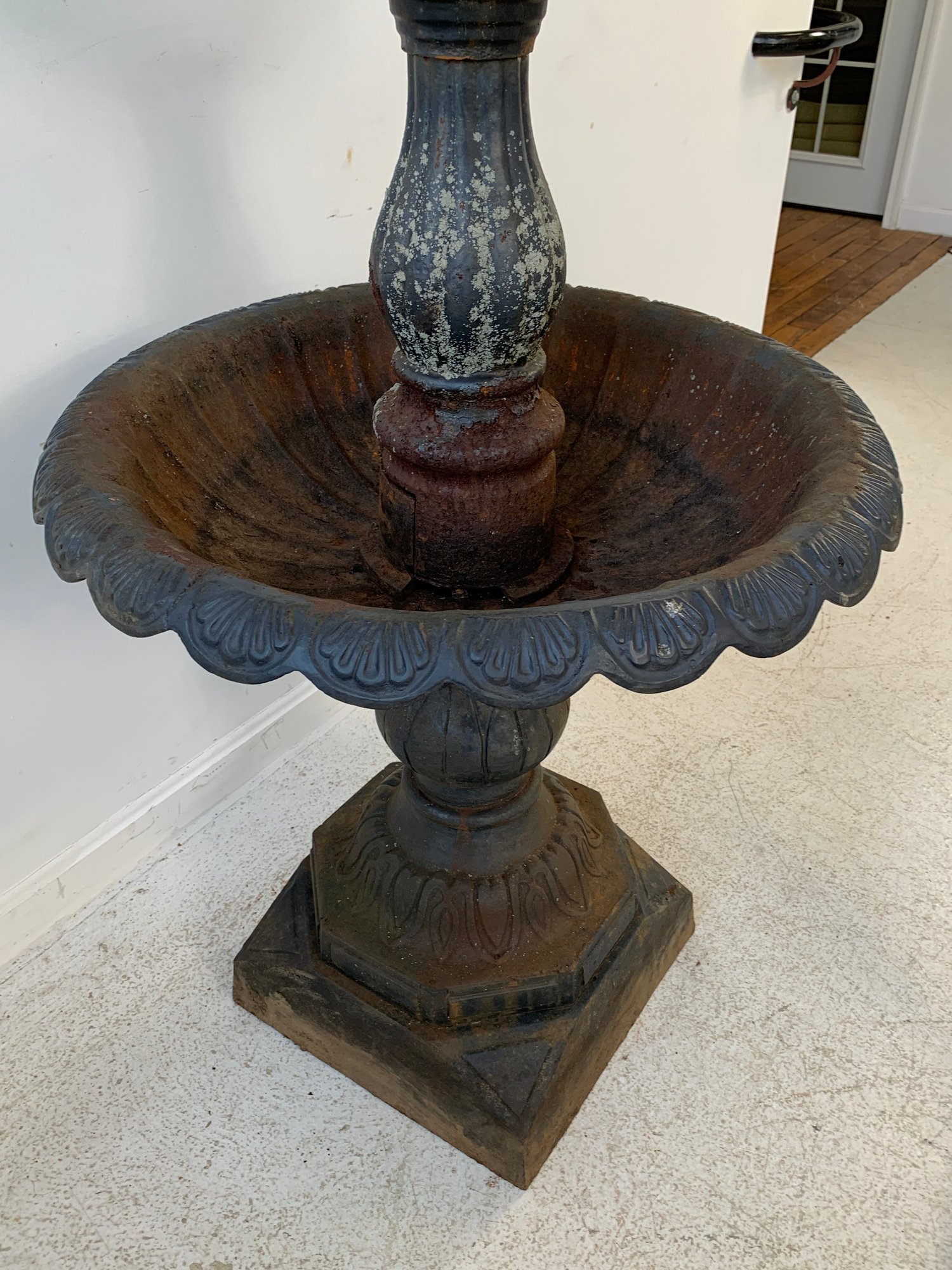 A two-tier cast iron garden fountain with scalloped basins, turned baluster columns, and a stepped octagonal base. Disassembles into three sections for transport.