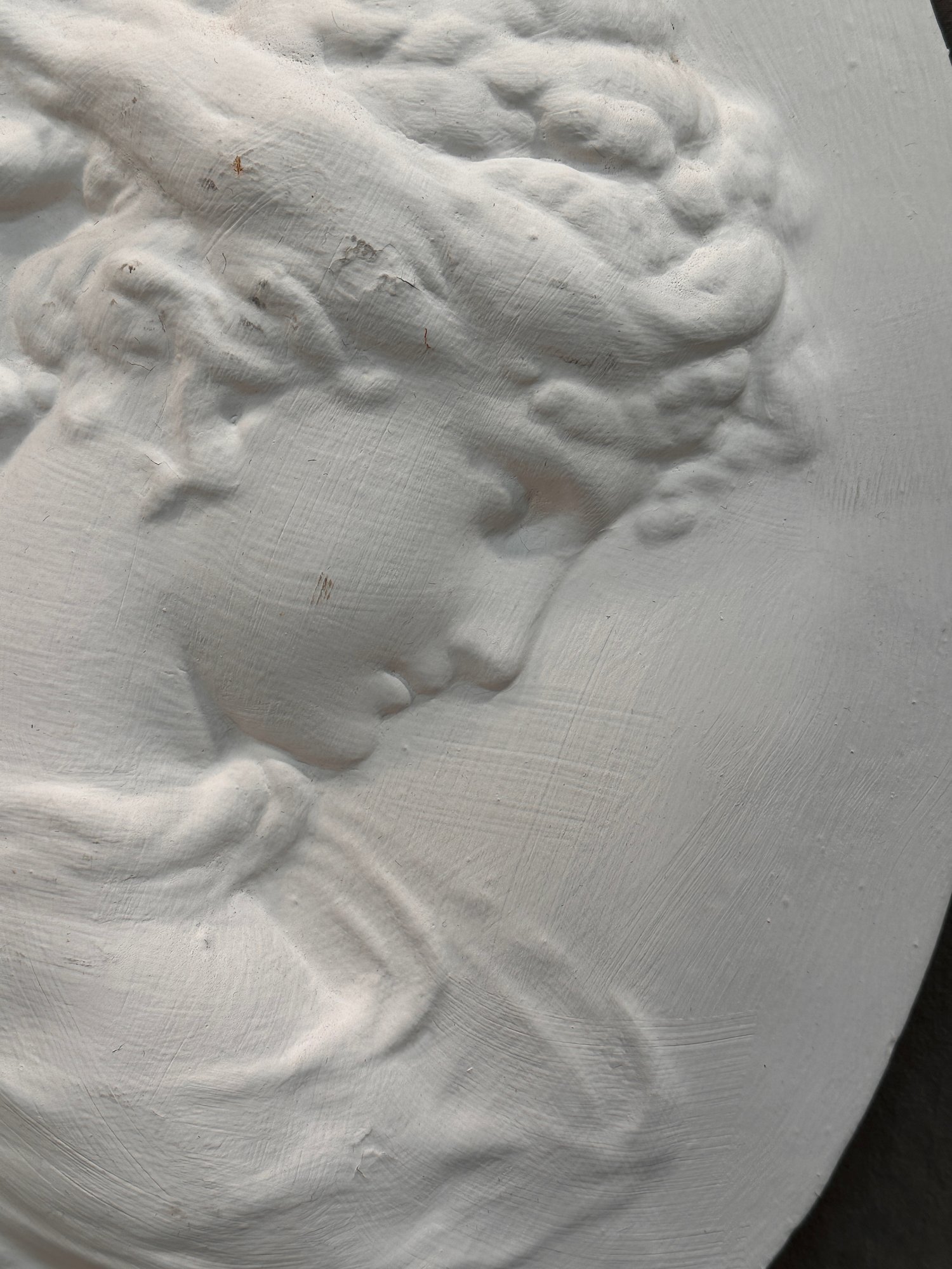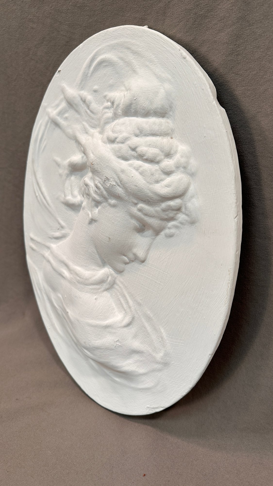 A white oval shaped ceramic cameo bas-relief wall hanging or plaque.