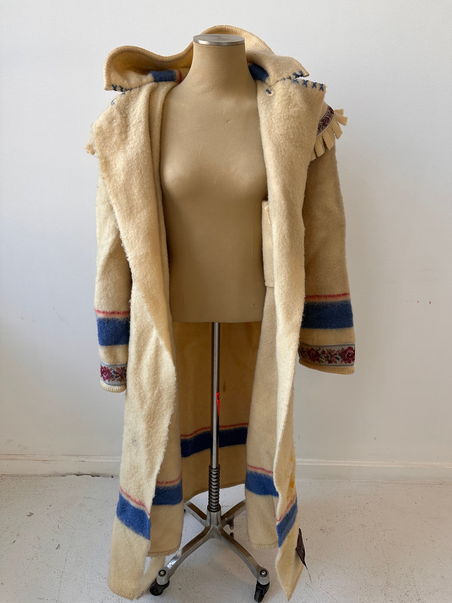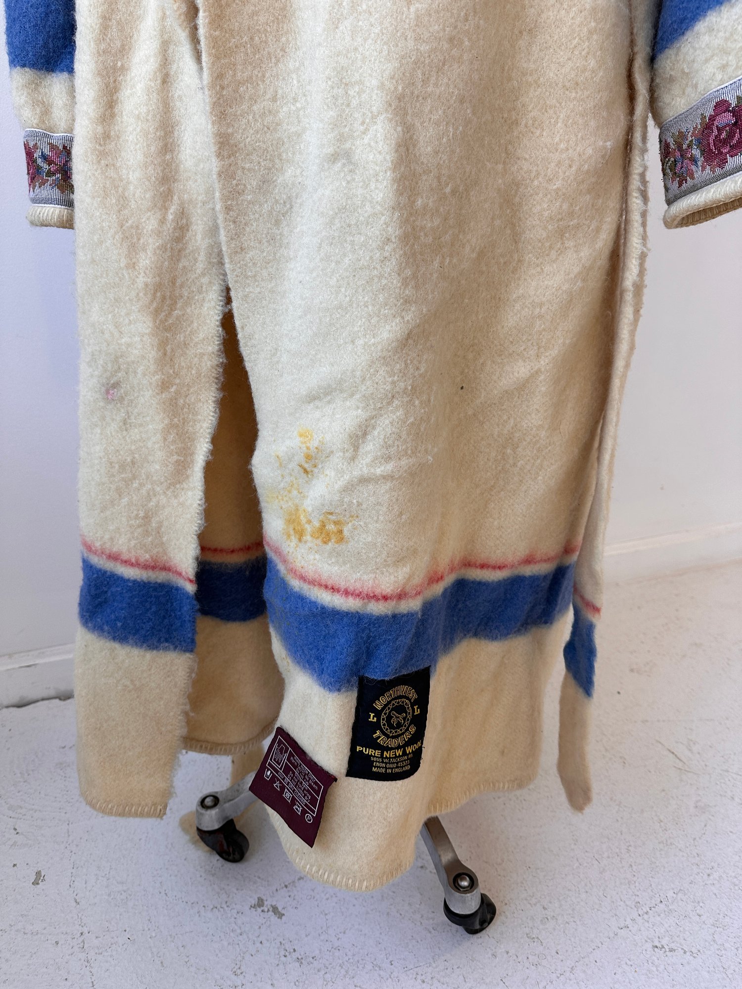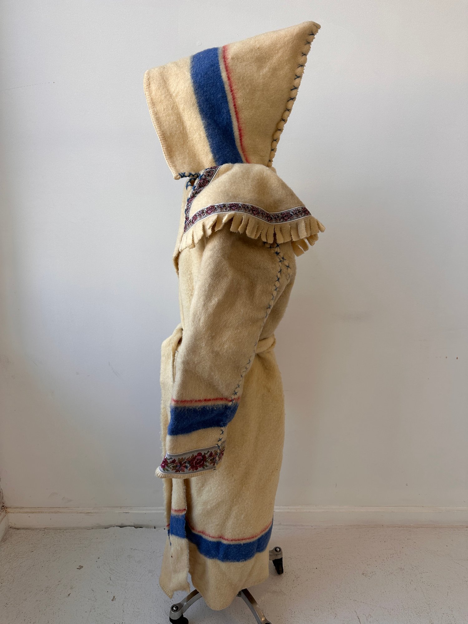 A vintage Early's of Whitney Northwest Traders wool capote blanket coat with a pointed hood. Showing original labels. C. 1970's. Made in England.