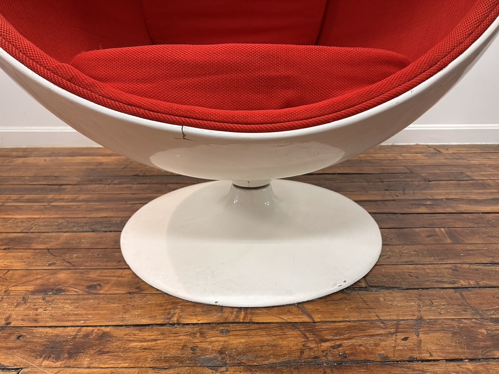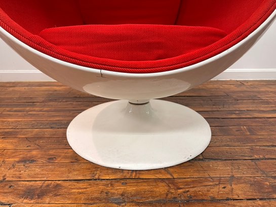 A vintage Eero Aarnio fiberglass ball swivel chair in red fabric upholstery. Full size, circa 1990's.