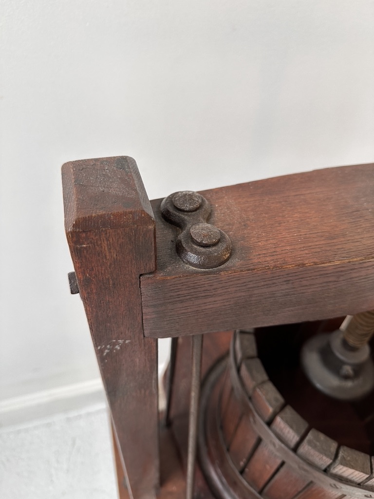 A vintage wine press made of oak and iron. Original owners purchased in France and brought back. C. second half 20th century.
