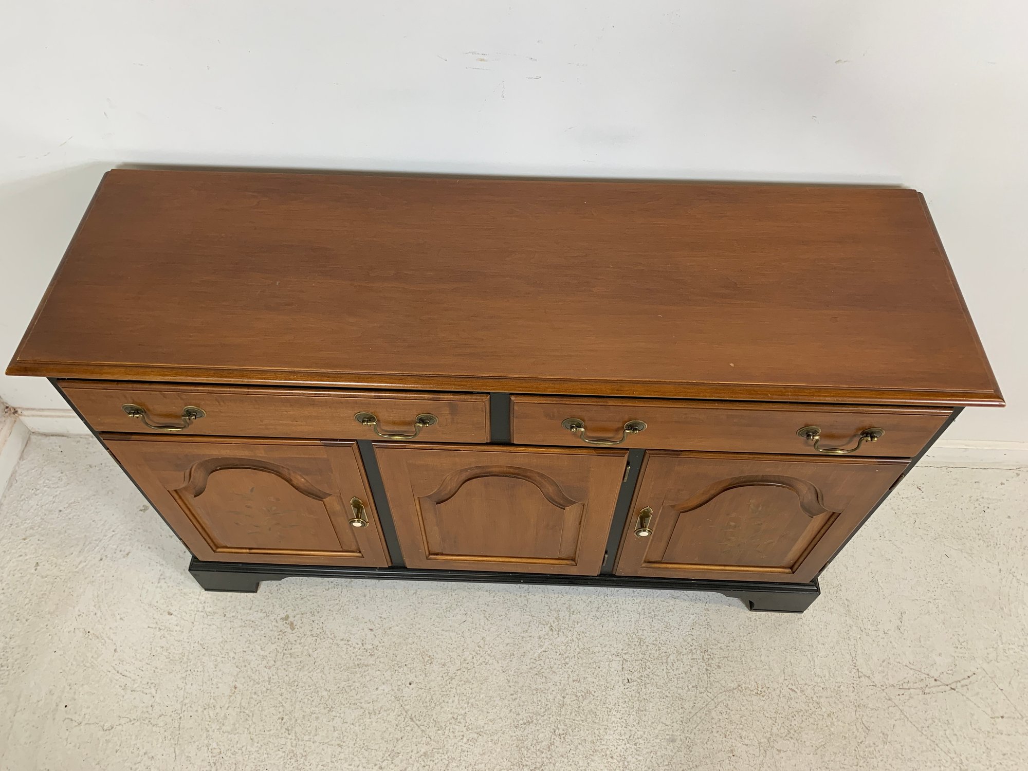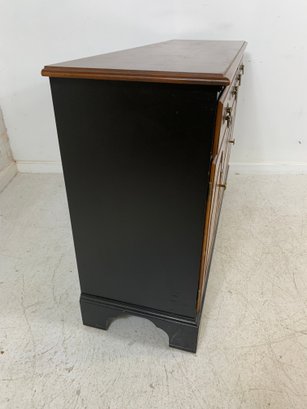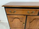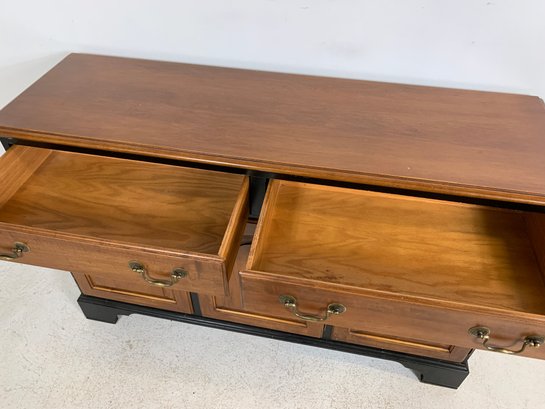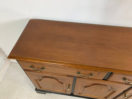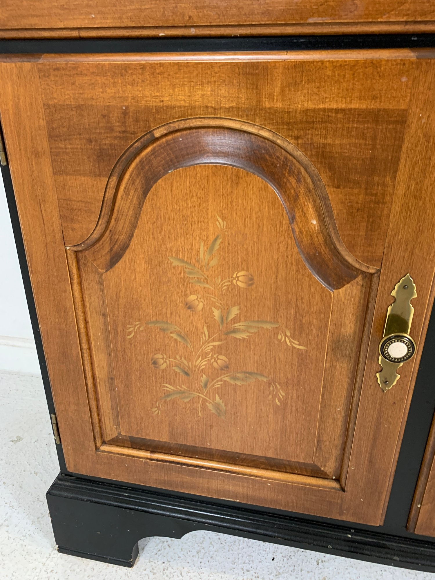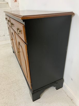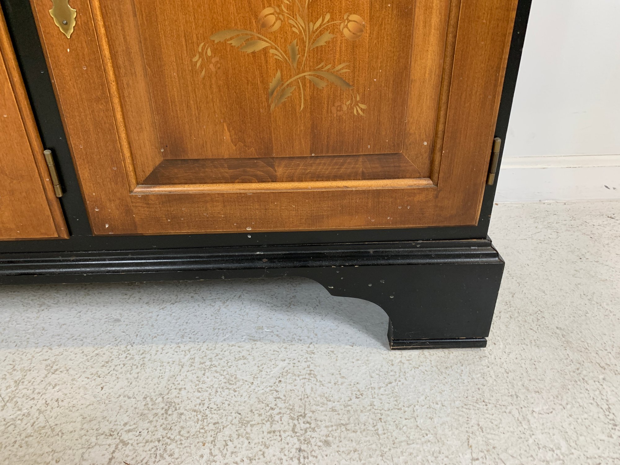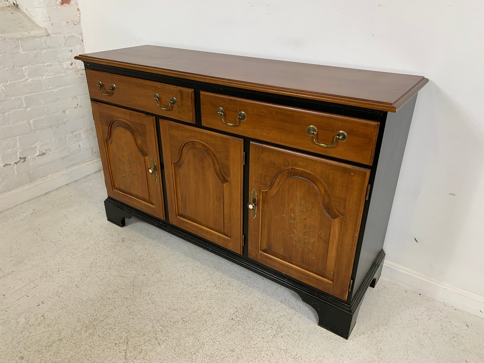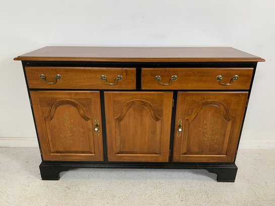 A Hitchcock cherry and ebonized sideboard featuring two drawers with brass bail pulls over three arched panel cabinet doors with stenciled floral decoration and brass latch hardware, raised on bracket feet. Hitchcock label on interior drawer.