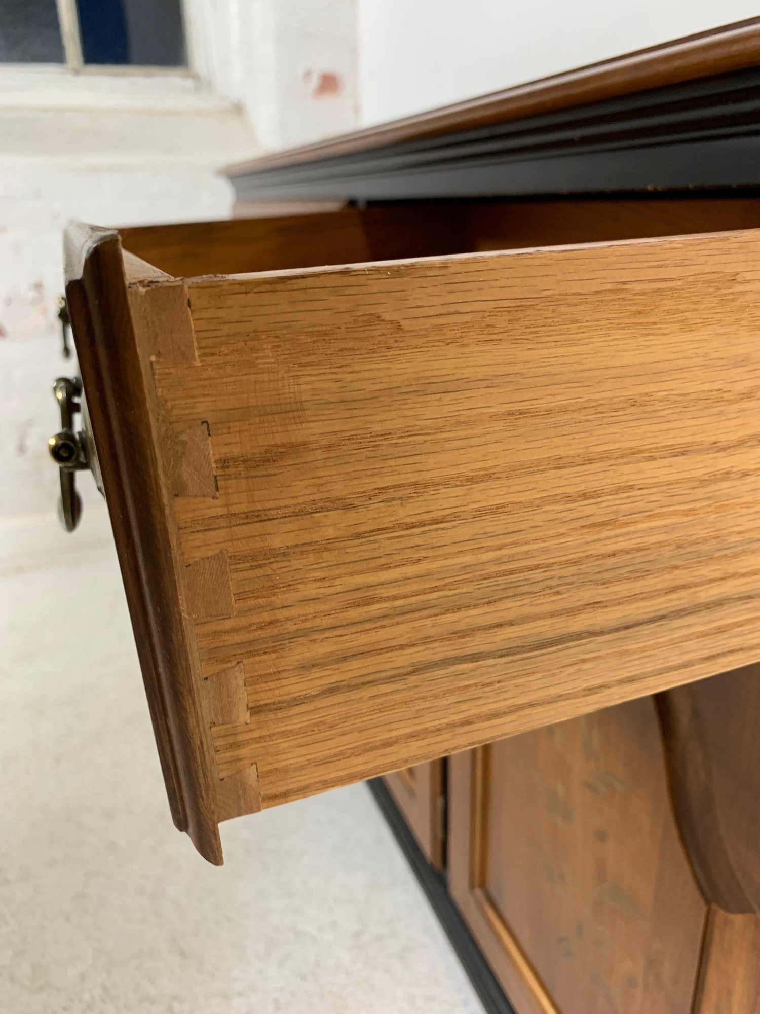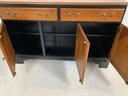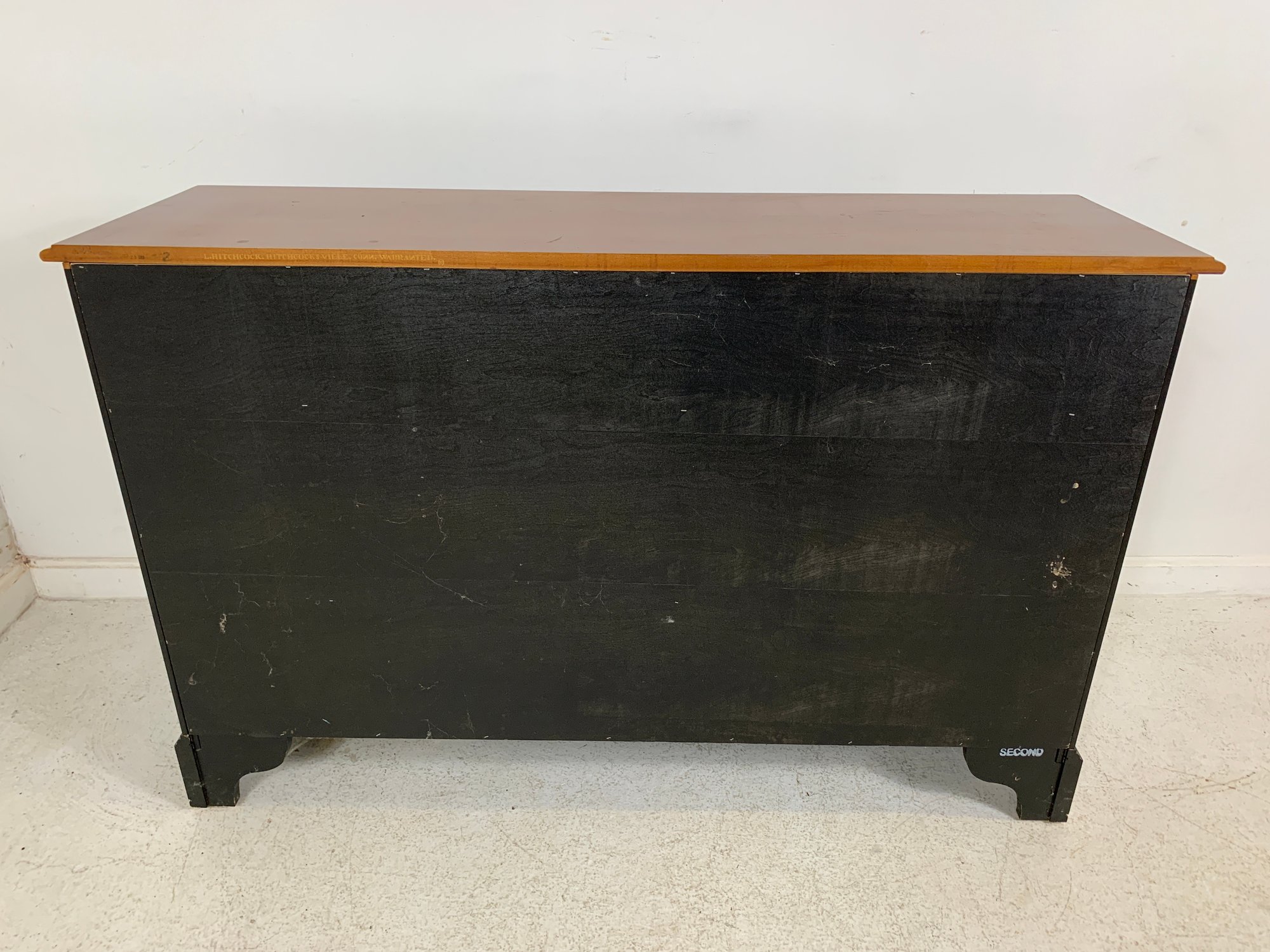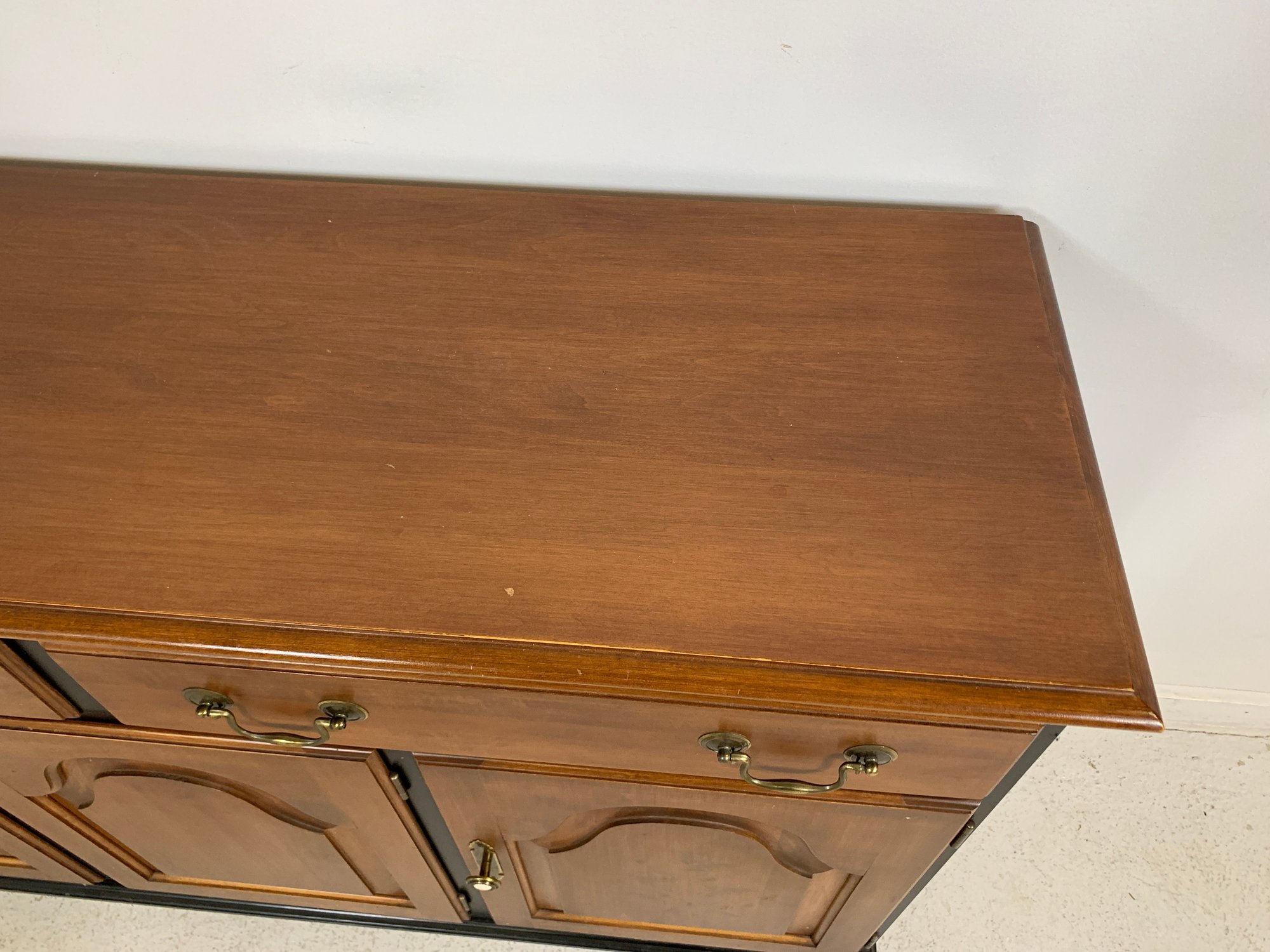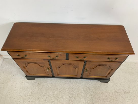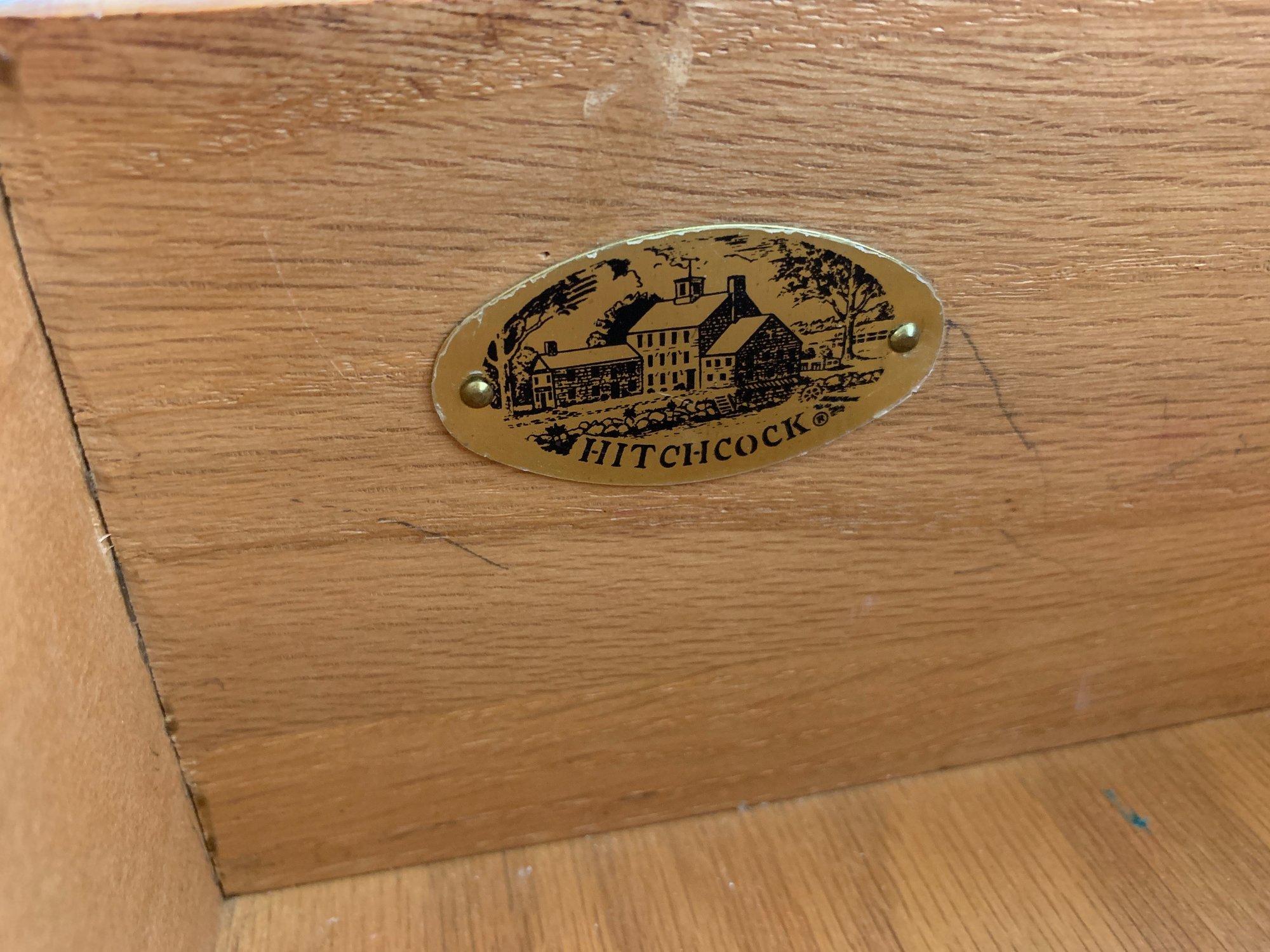 A Hitchcock cherry and ebonized sideboard featuring two drawers with brass bail pulls over three arched panel cabinet doors with stenciled floral decoration and brass latch hardware, raised on bracket feet. Hitchcock label on interior drawer.