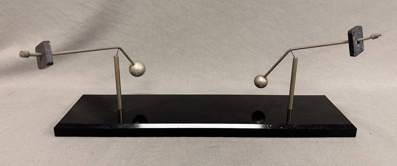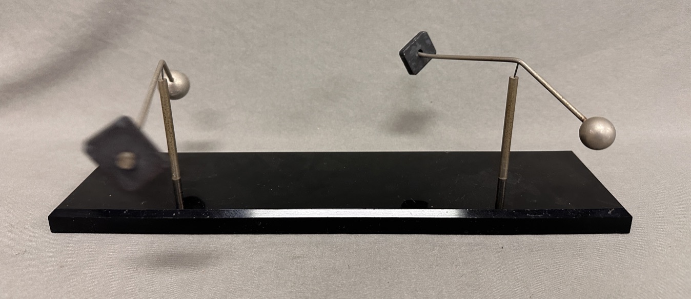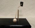 A 3 part kinetic sculpture with 2 metal rectangular pieces and 2 round balls on 2 branches, on black plexi base. Presents lovely movement.