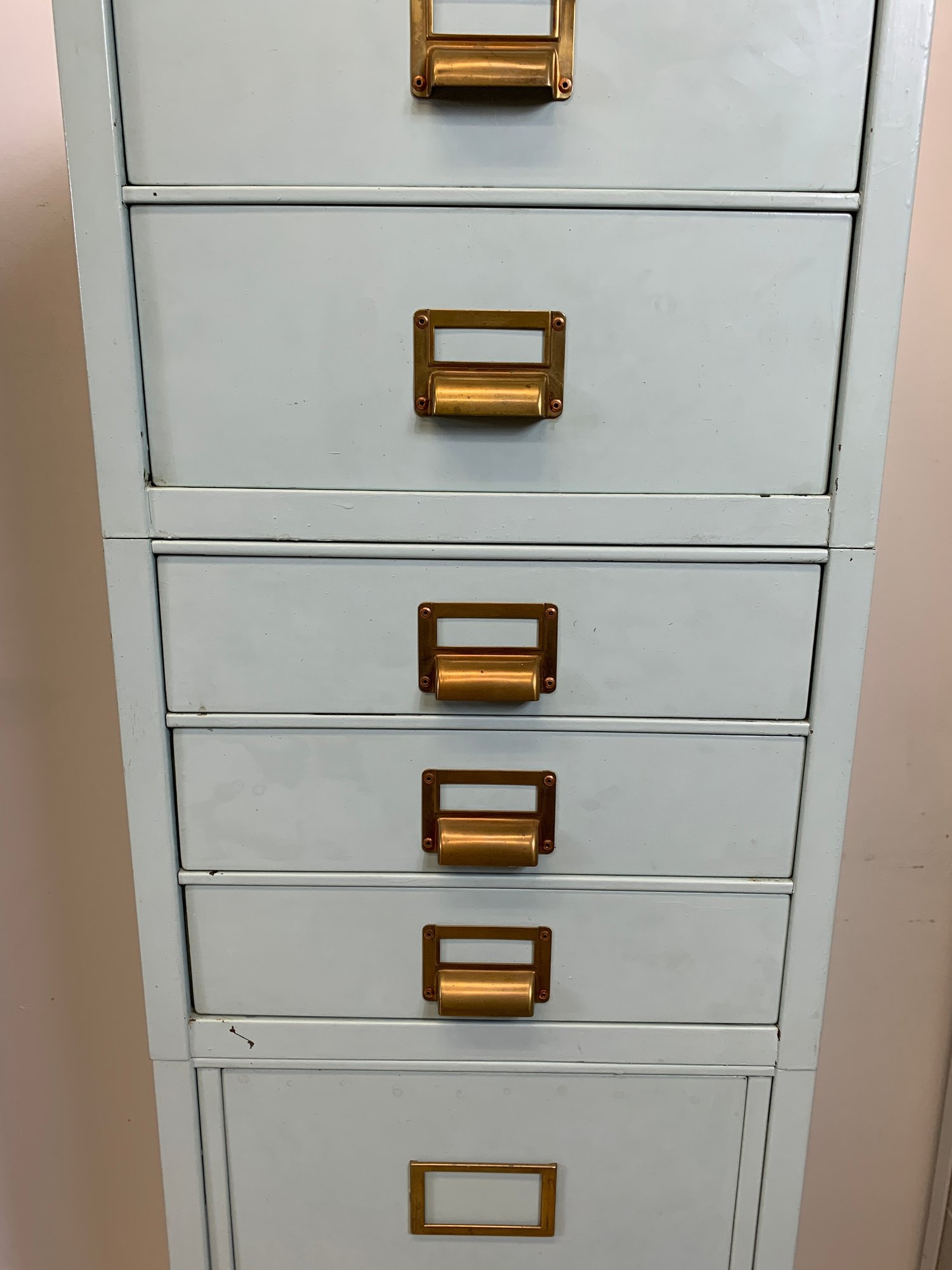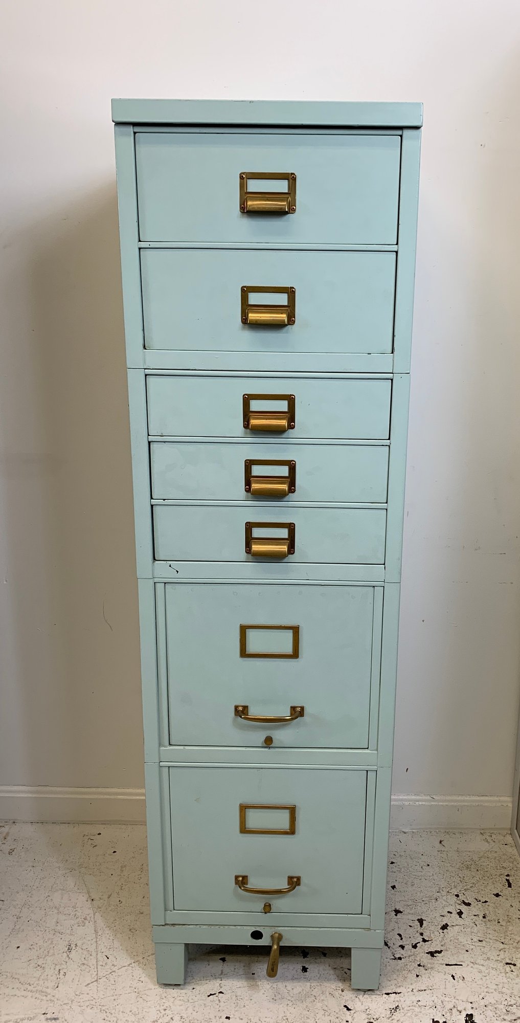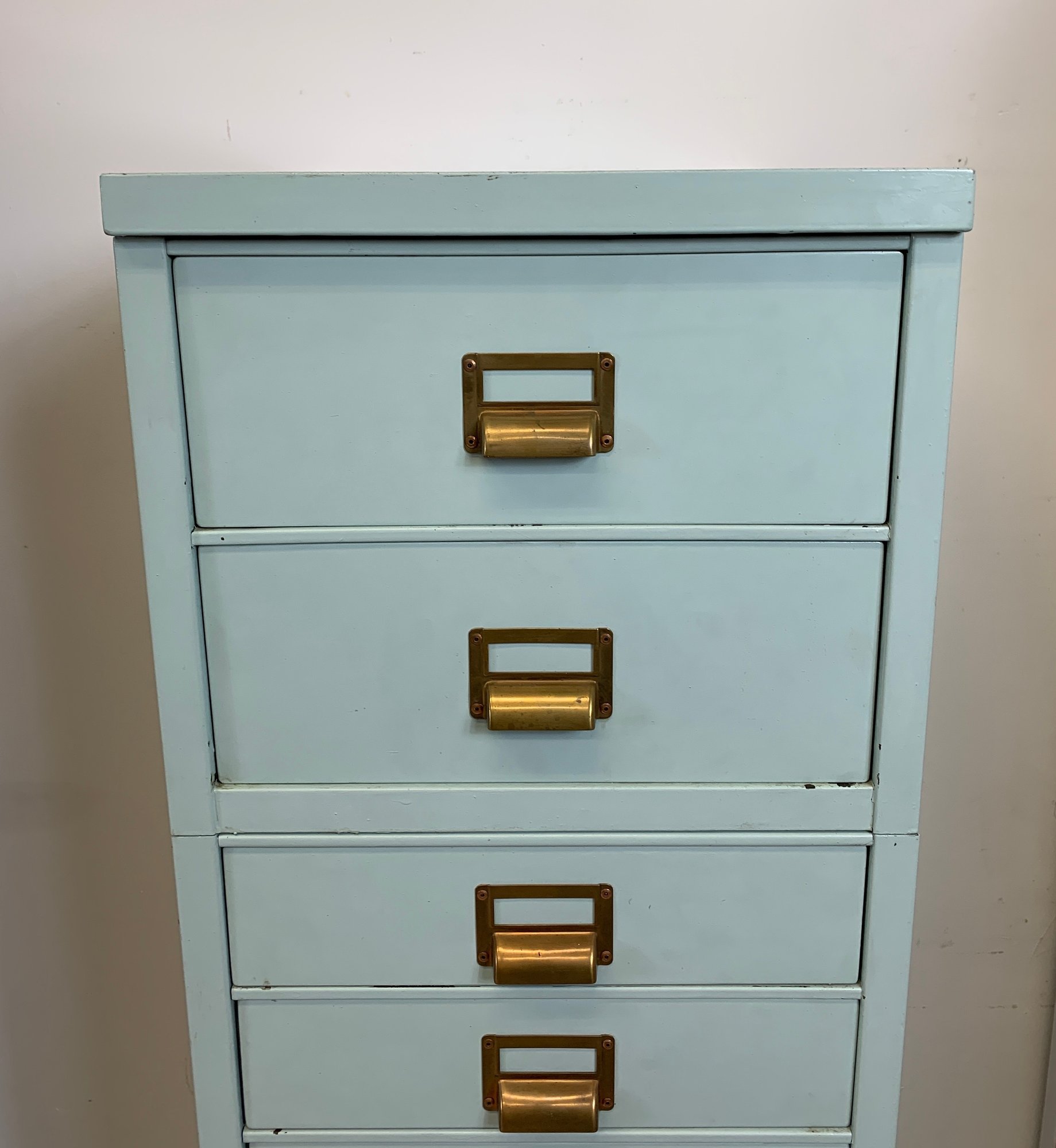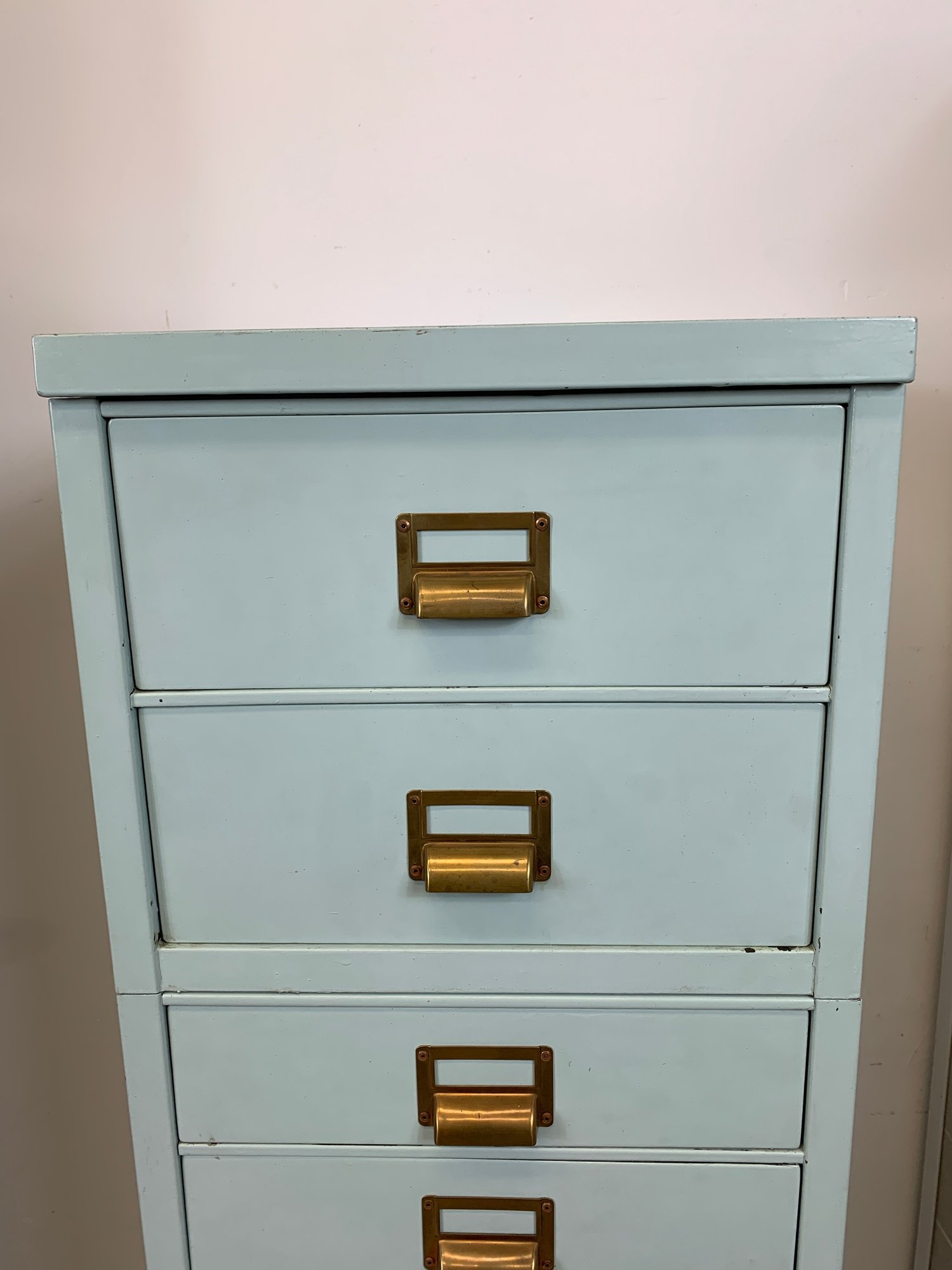 Heavy gauge steel filing cabinet painted in duck egg blue/mint, fitted with brass label holders, bail pulls, and arch handles throughout. Brass anti-tip locking lever at base. Disassembles into 6 stackable sections. Mid-20th century.