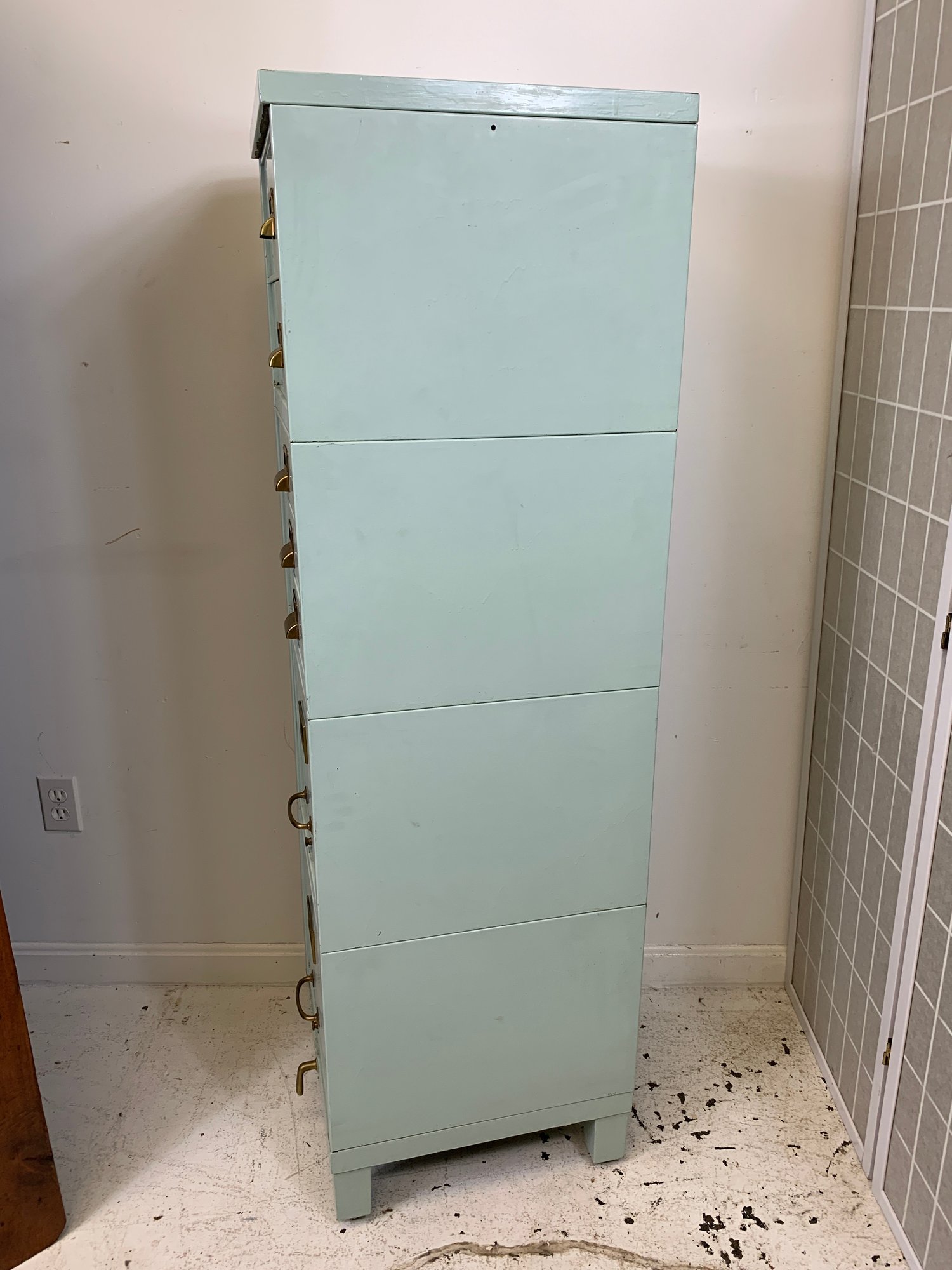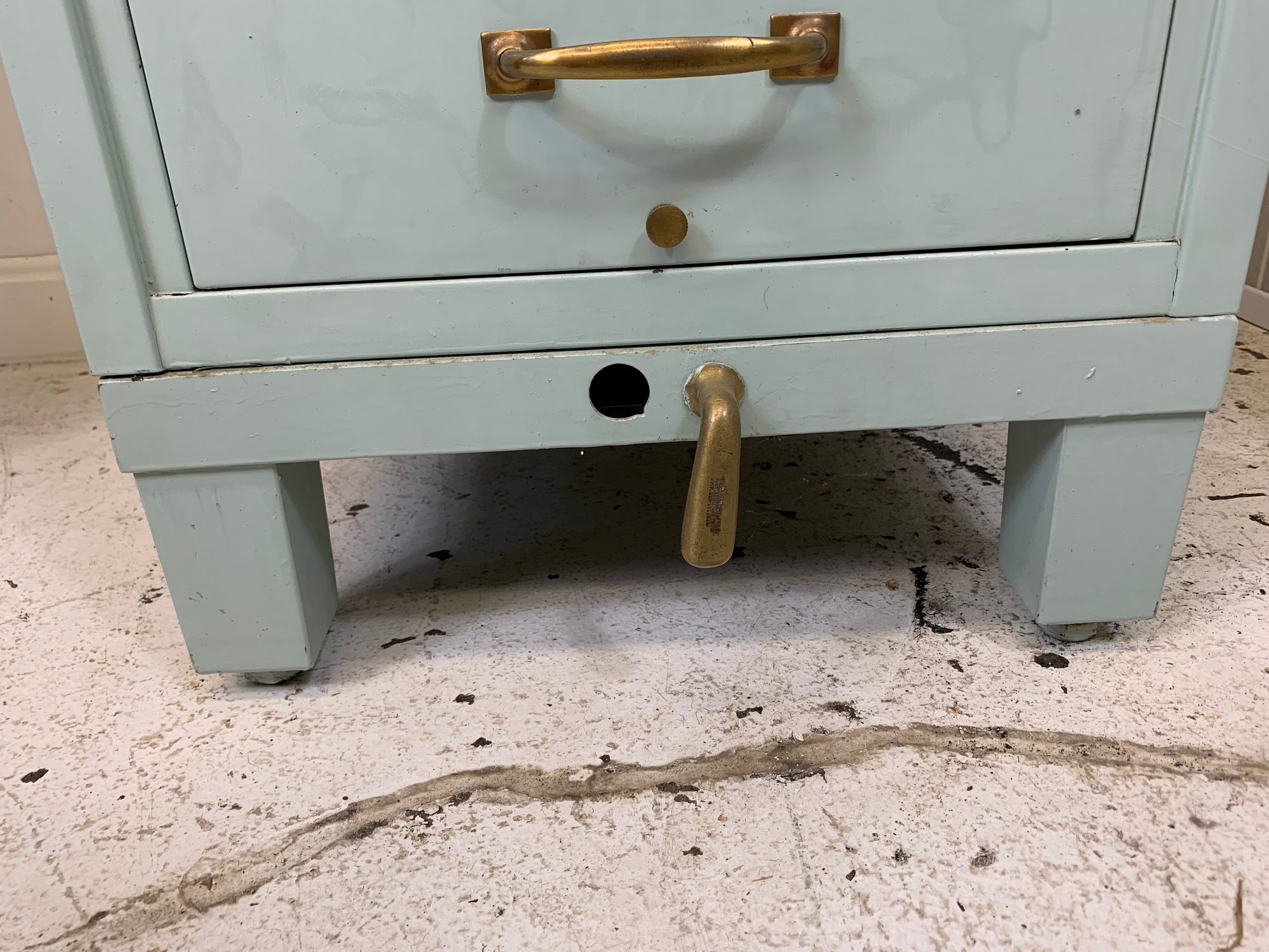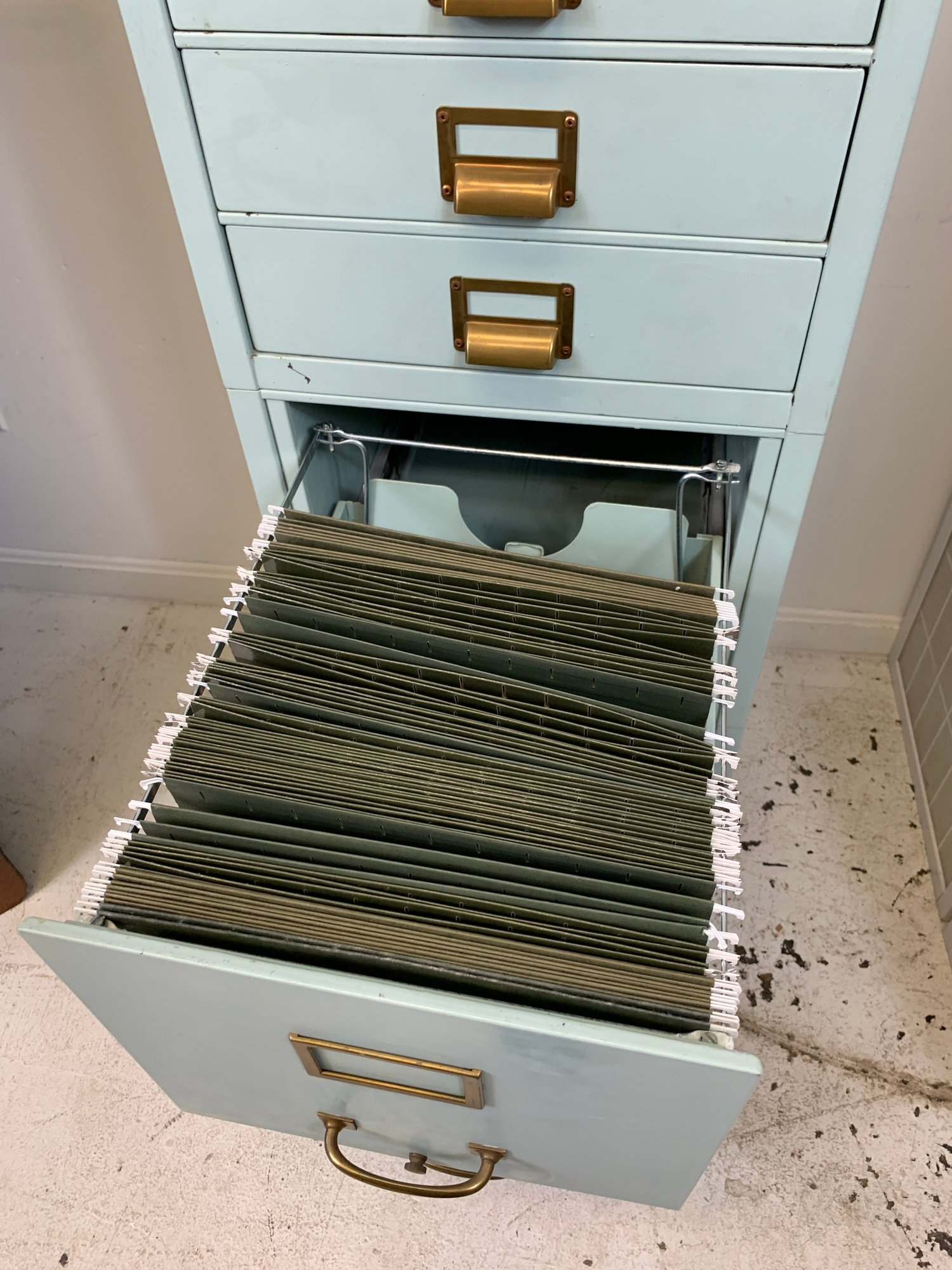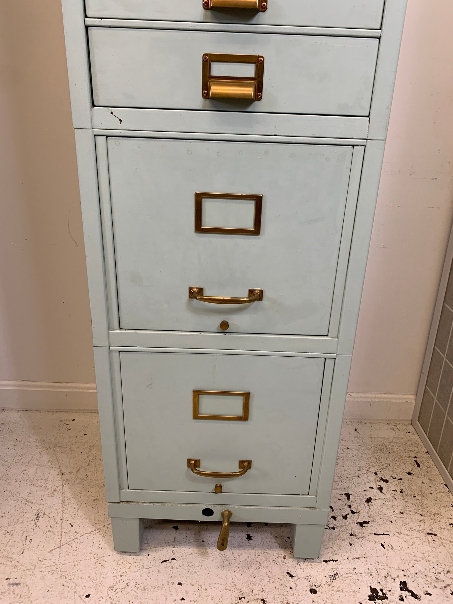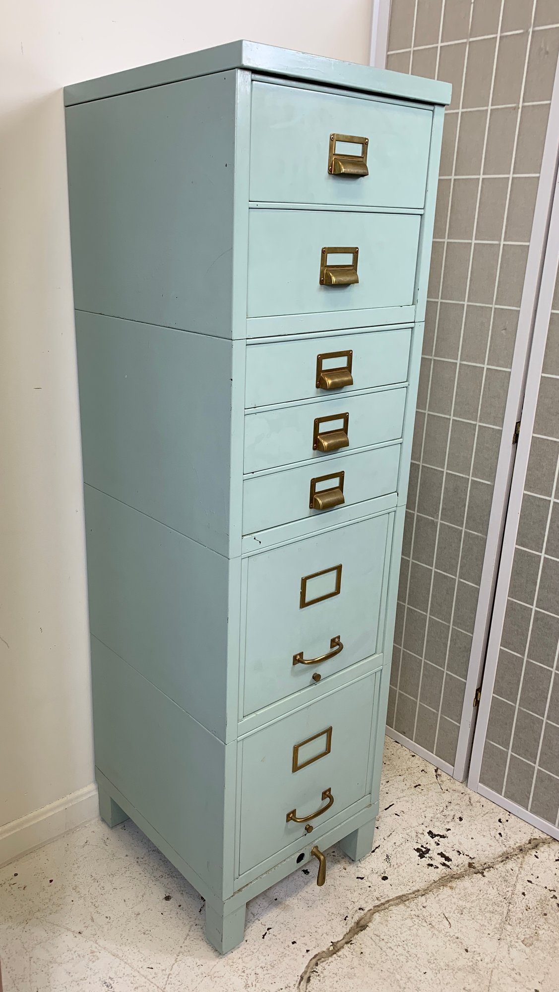 Heavy gauge steel filing cabinet painted in duck egg blue/mint, fitted with brass label holders, bail pulls, and arch handles throughout. Brass anti-tip locking lever at base. Disassembles into 6 stackable sections. Mid-20th century.